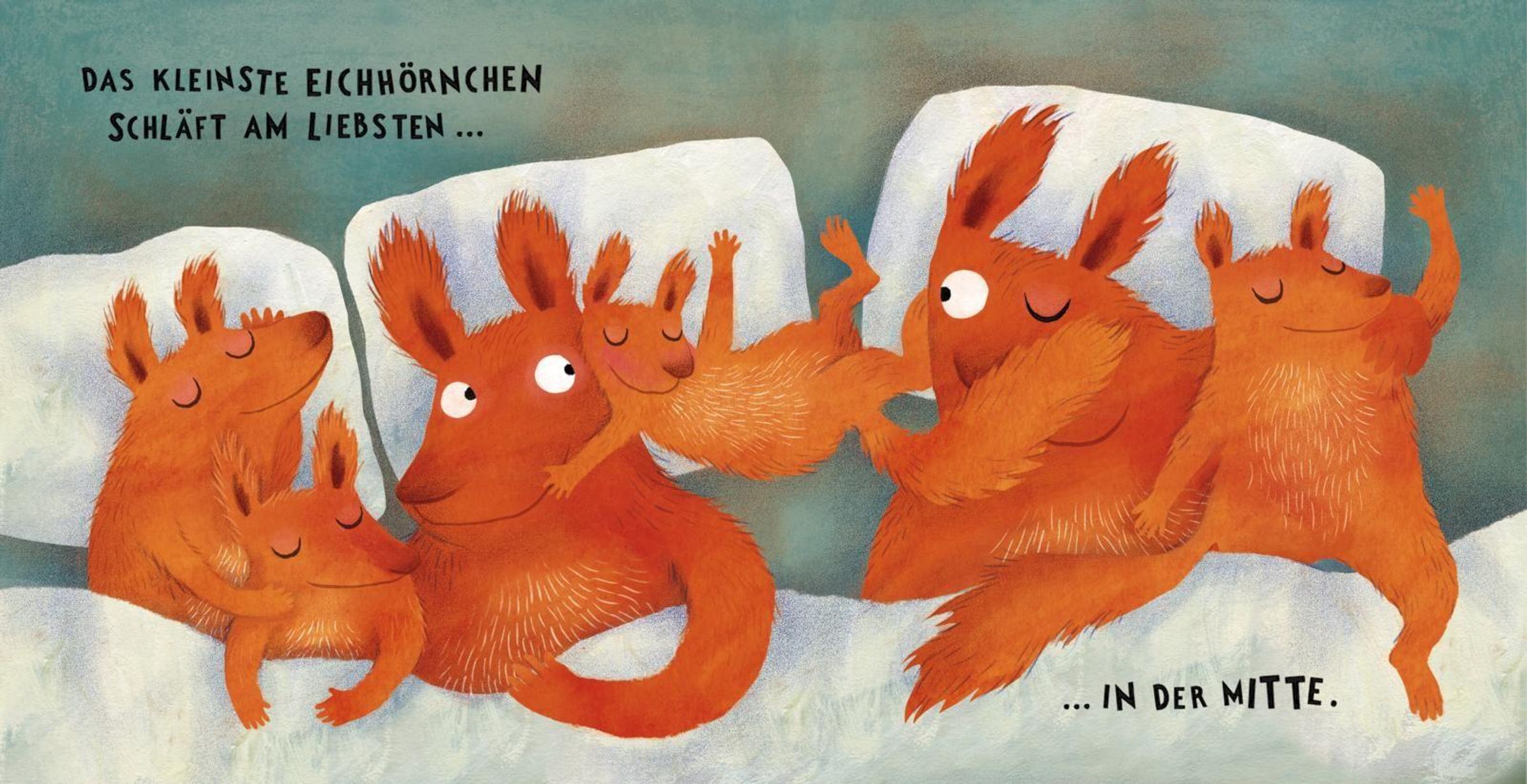Alle schlafen! Gar keine Frage. Wie all diese Tiere so dank dieses witzigen Buches auch jedes Kind! Die Maus zieht sich schon den Schlafanzug an und dann geht es los, der Reihe nach: Jedes Tier schläft auf ganz eigene Weise. Der kleine Löwe schläft auf Papas Rücken und das Kängurubaby in Mamas Beutel. Der Flamingo träumt auf einem Bein und die Fledermaus kopfüber am Ast baumelnd. Das kleine Eichhörnchen schlummert am liebsten genau in der Mitte vom großen Bett und das Kätzchen schläft schon ganz allein in seinem Bett. Der kleine Biber möchte noch spielen und ganz und gar nicht schlafen, oder doch?