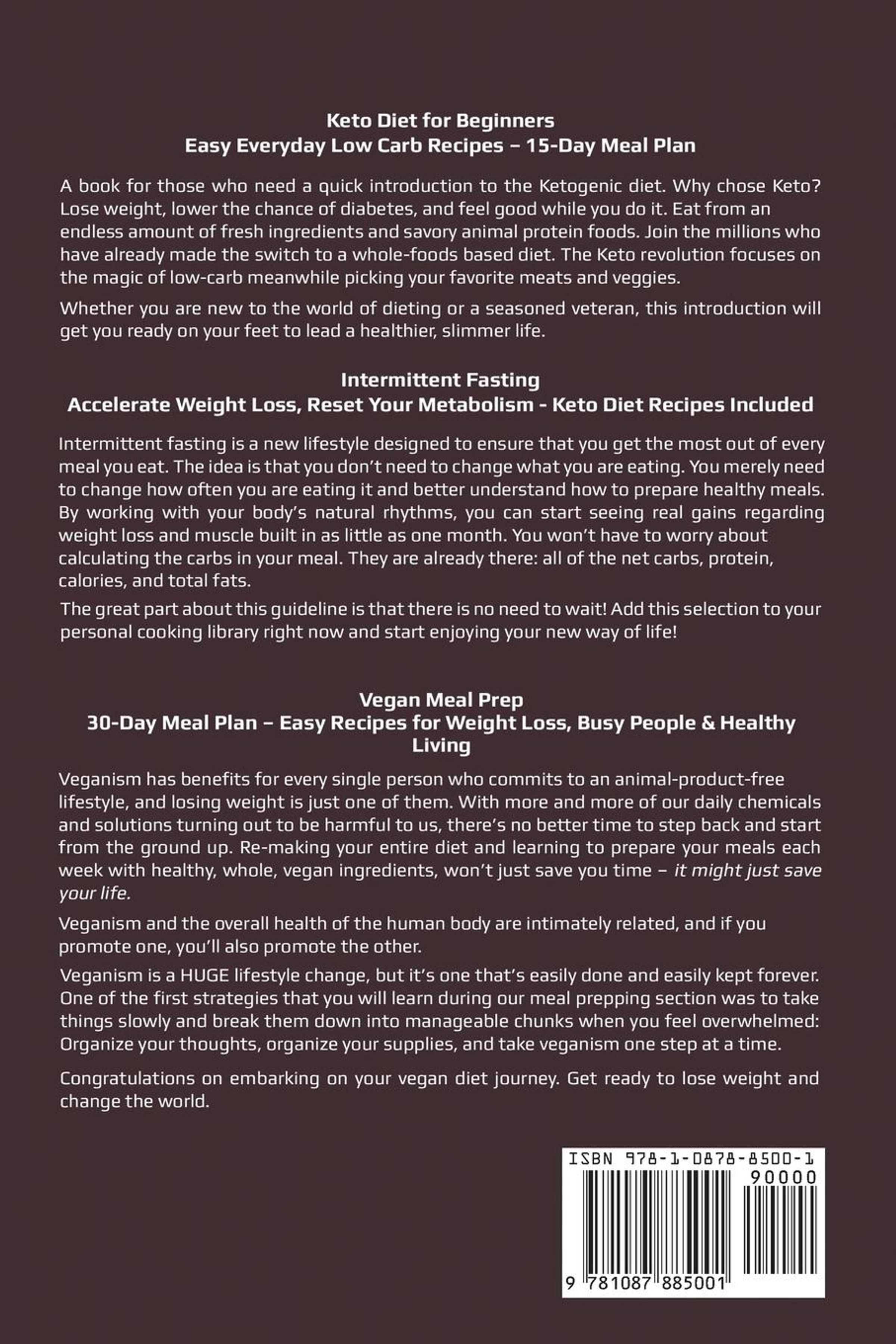 Keto Diet for Beginners Easy Everyday Low Carb Recipes - 15-Day Meal PlanA book for those who need a quick introduction to the Ketogenic diet. Why chose Keto? Lose weight, lower the chance of diabetes, and feel good while you do it. Eat from an endless amount of fresh ingredients and savory animal protein foods. Join the millions who have already made the switch to a whole-foods based diet. The Keto revolution focuses on the magic of low-carb meanwhile picking your favorite meats and veggies. Whether you are new to the world of dieting or a seasoned veteran, this introduction will get you ready on your feet to lead a healthier, slimmer life. Intermittent Fasting Accelerate Weight Loss, Reset Your Metabolism - Keto Diet Recipes IncludedIntermittent fasting is a new lifestyle designed to ensure that you get the most out of every meal you eat. The idea is that you don't need to change what you are eating. You merely need to change how often you are eating it and better understand how to prepare healthy meals. By working with your body's natural rhythms, you can start seeing real gains regarding weight loss and muscle built in as little as one month. You won't have to worry about calculating the carbs in your meal. They are already there: all of the net carbs, protein, calories, and total fats. The great part about this guideline is that there is no need to wait! Add this selection to your personal cooking library right now and start enjoying your new way of life! Vegan Meal Prep 30-Day Meal Plan - Easy Recipes for Weight Loss, Busy People & Healthy LivingVeganism has benefits for every single person who commits to an animal-product-free lifestyle, and losing weight is just one of them. With more and more of our daily chemicals and solutions turning out to be harmful to us, there's no better time to step back and start from the ground up. Re-making your entire diet and learning to prepare your meals each week with healthy, whole, vegan ingredients, won't just save you time - it might just save your life. Veganism and the overall health of the human body are intimately related, and if you promote one, you'll also promote the other. Veganism is a HUGE lifestyle change, but it's one that's easily done and easily kept forever. One of the first strategies that you will learn during our meal prepping section was to take things slowly and break them down into manageable chunks when you feel overwhelmed: Organize your thoughts, organize your supplies, and take veganism one step at a time. Congratulations on embarking on your vegan diet journey. Get ready to lose weight and change the world.