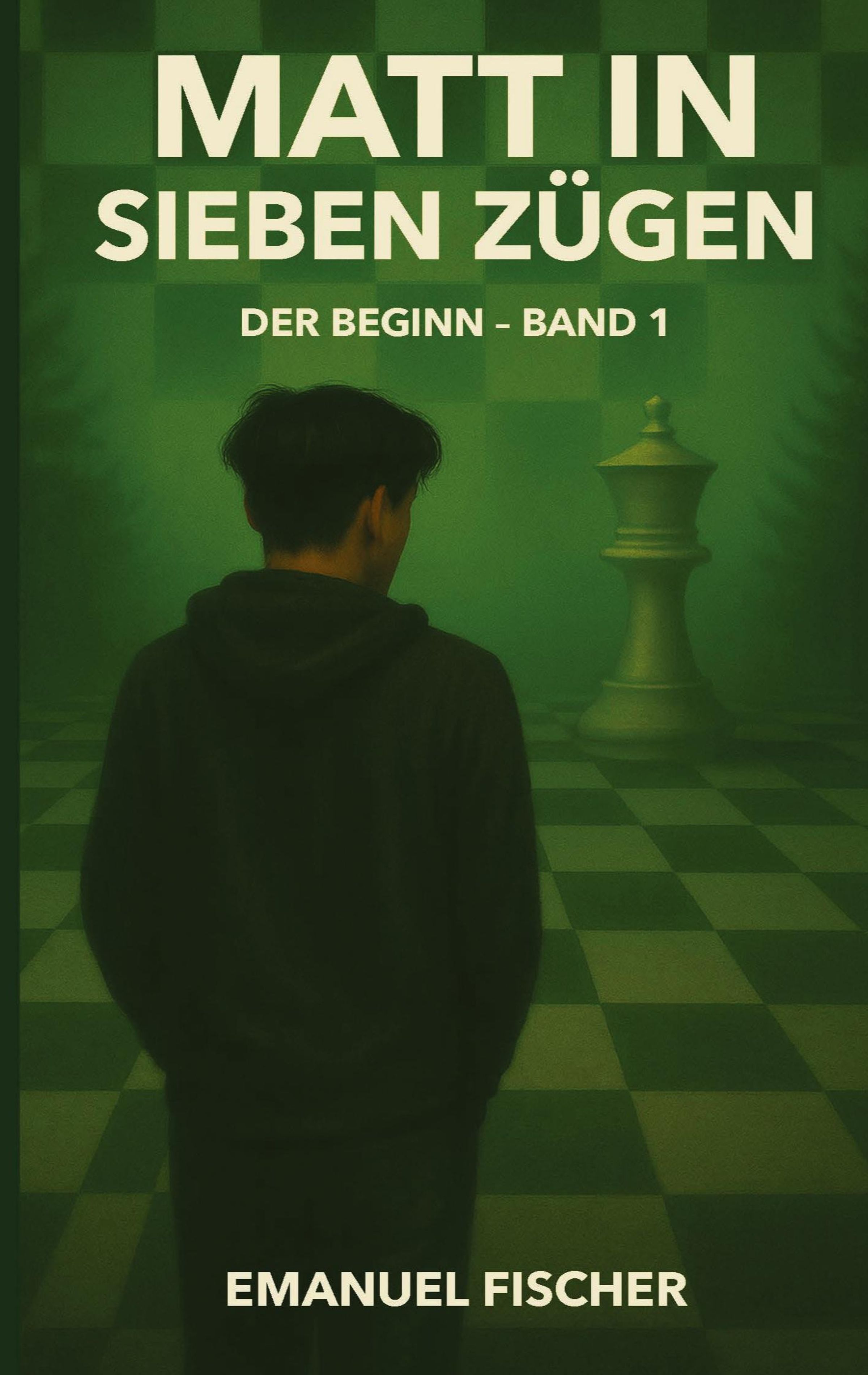 „MATT IN SIEBEN ZÜGEN. DER BEGINN - BAND 1.“ Ein Mann vor einem großen Schachbrettmuster; Schachfigur im Hintergrund., Buch