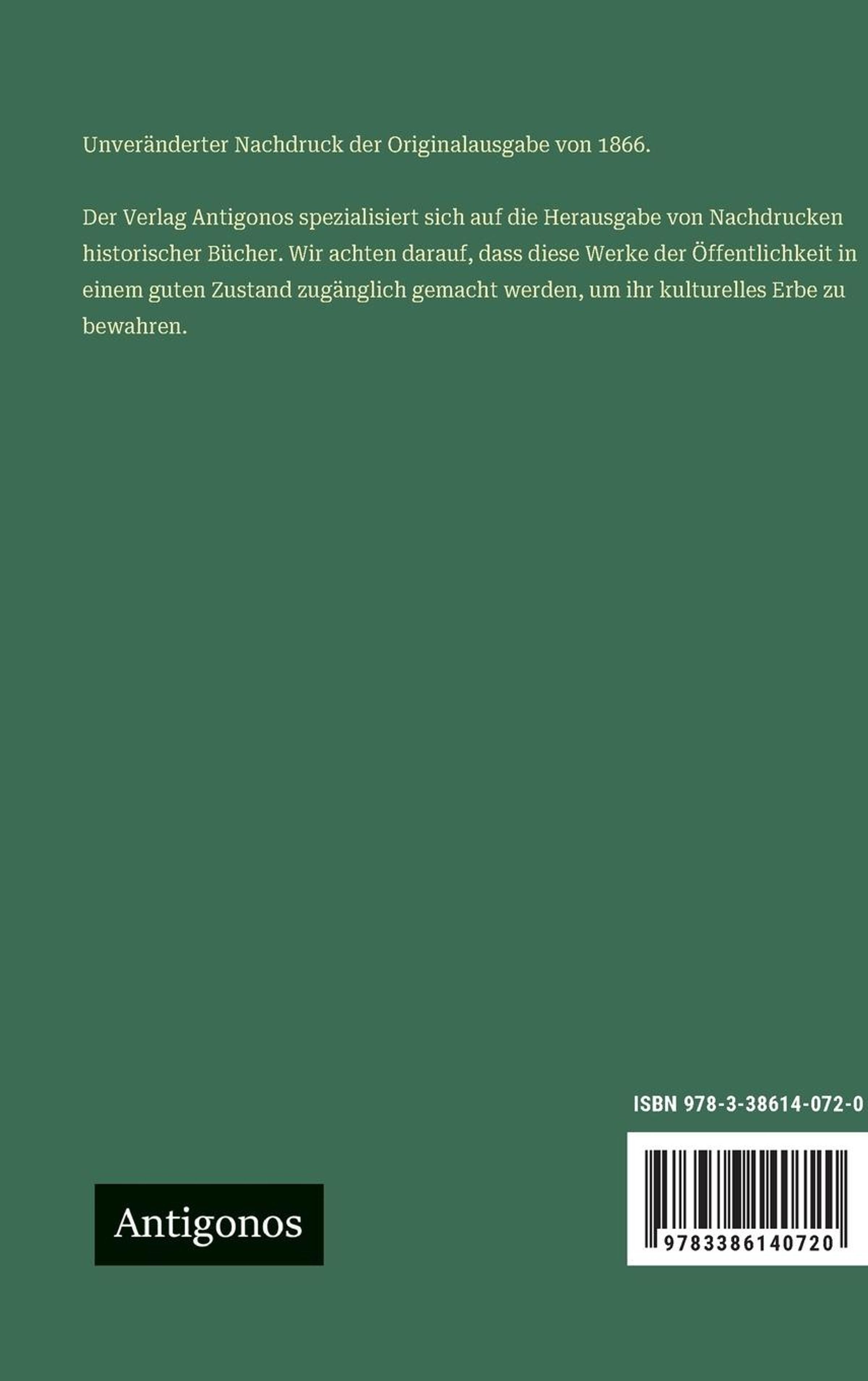 Unveränderter Nachdruck der Originalausgabe von 1866. Der Verlag Antigonos spezialisiert sich auf die Herausgabe von Nachdrucken historischer Bücher. Wir achten darauf, dass diese Werke der Öffentlichkeit in einem guten Zustand zugänglich gemacht werden, um ihr kulturelles Erbe zu bewahren.