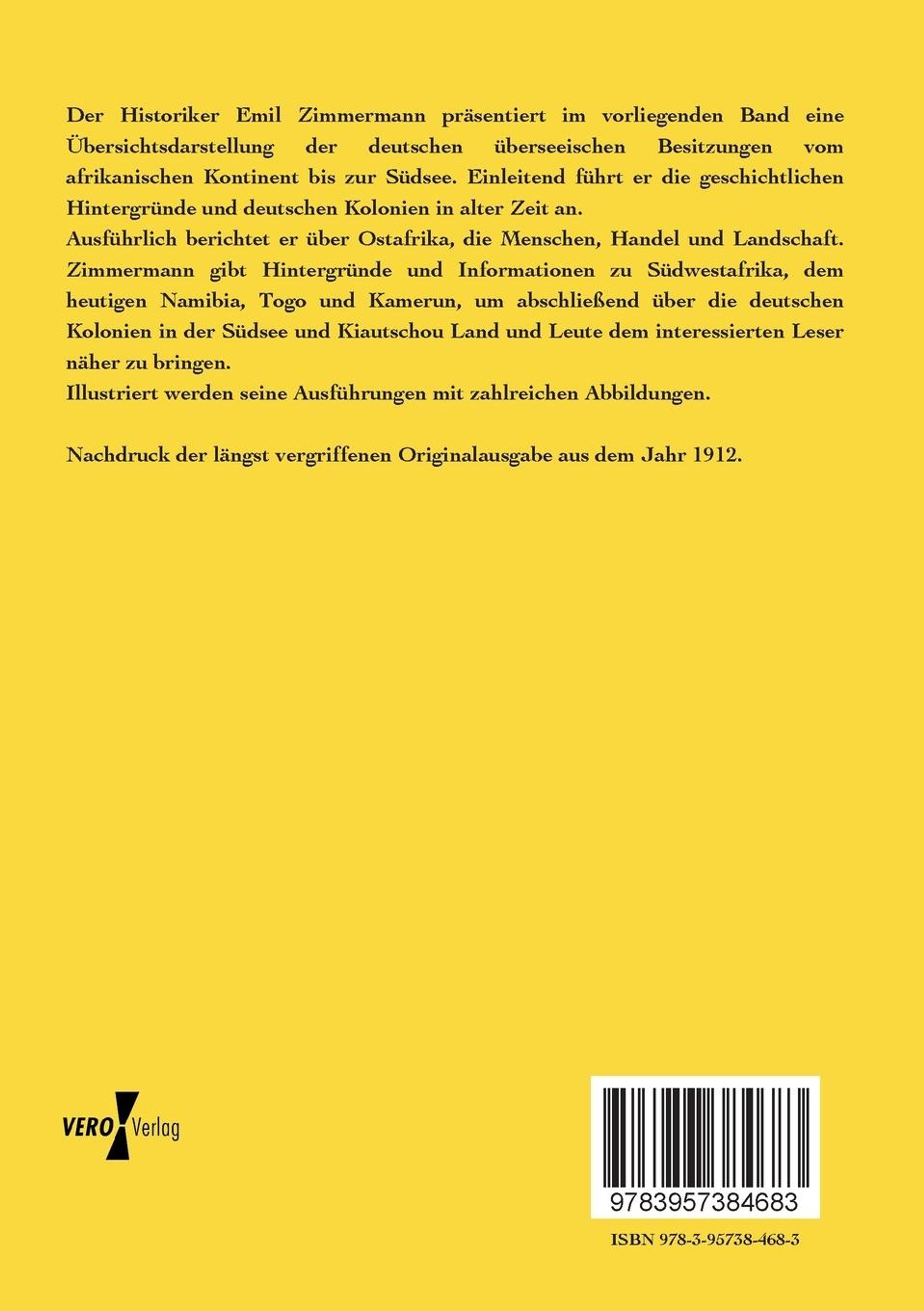 Der Historiker Emil Zimmermann präsentiert im vorliegenden Band eine Übersichtsdarstellung der deutschen überseeischen Besitzungen vom afrikanischen Kontinent bis zur Südsee. Einleitend führt er die geschichtlichen Hintergründe und deutschen Kolonien in alter Zeit an. Ausführlich berichtet er über Ostafrika, die Menschen, Handel und Landschaft. Zimmermann gibt Hintergründe und Informationen zu Südwestafrika, dem heutigen Namibia, Togo und Kamerun, um abschließend über die deutschen Kolonien in der Südsee und Kiautschou Land und Leute dem interessierten Leser näher zu bringen. Illustriert werden seine Ausführungen mit zahlreichen Abbildungen.