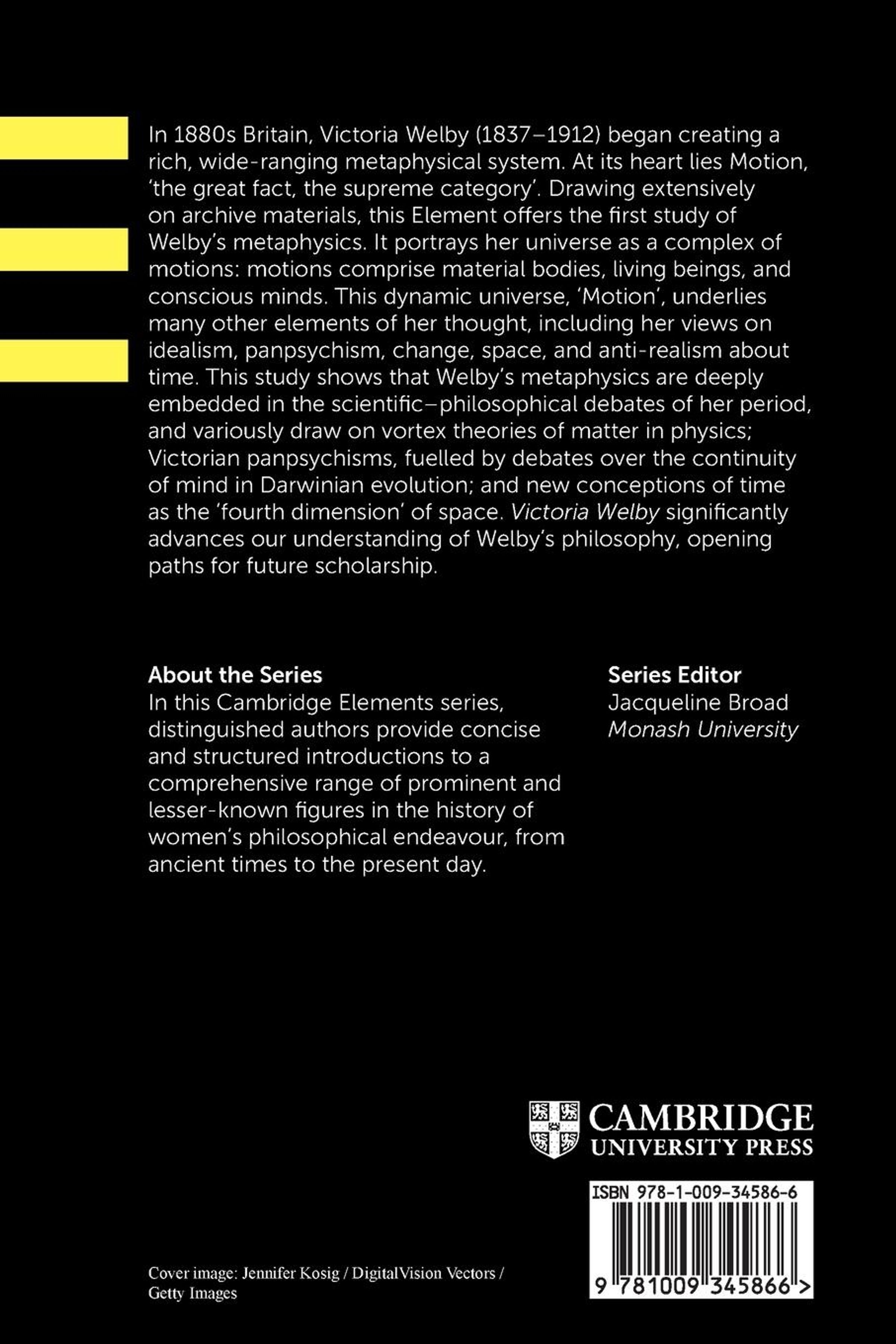 In 1880s Britain, Victoria Welby (1837-1912) began creating a rich, wide-ranging metaphysical system. At its heart lies Motion, 'the great fact, the supreme category'. Drawing extensively on archive materials, this Element offers the first study of Welby's metaphysics. It portrays her universe as a complex of motions: motions comprise material bodies, living beings, and conscious minds. This dynamic universe, 'Motion', underlies many other elements of her thought, including her views on idealism, panpsychism, change, space, and anti-realism about time. This study shows that Welby's metaphysics are deeply embedded in the scientific-philosophical debates of her period, and variously draw on vortex theories of matter in physics; Victorian panpsychisms, fuelled by debates over the continuity of mind in Darwinian evolution; and new conceptions of time as the 'fourth dimension' of space. Victoria Welby significantly advances our understanding of Welby's philosophy, opening paths for future scholarship.
