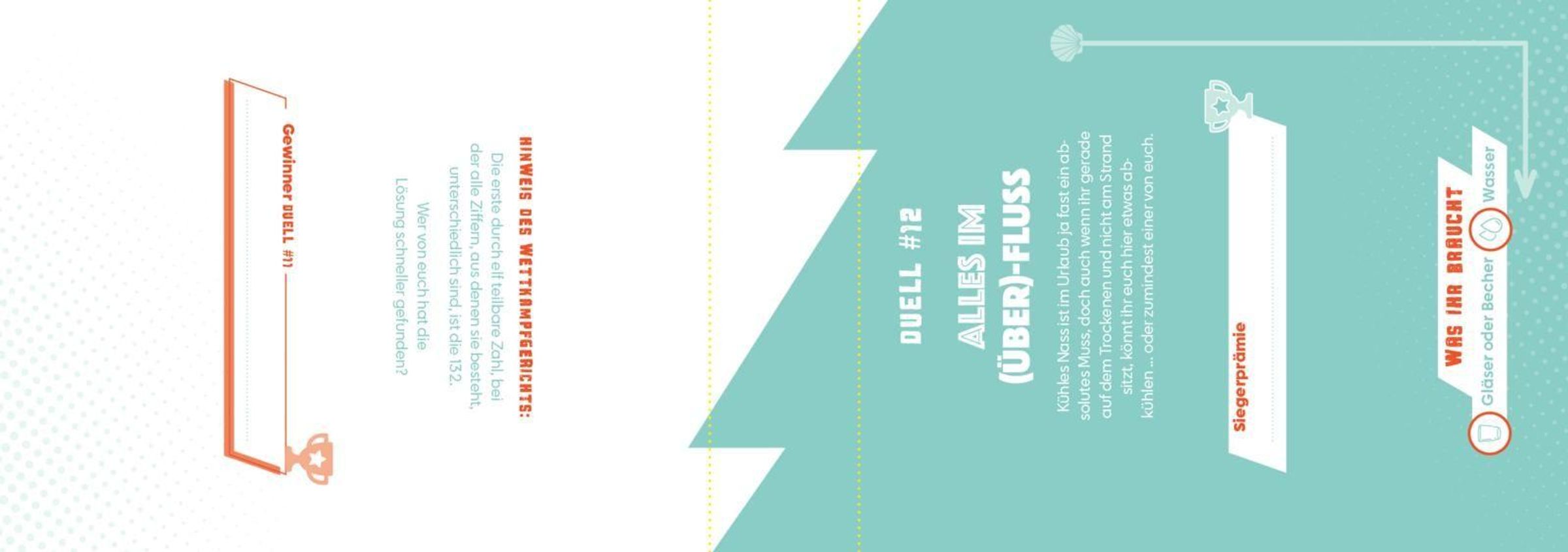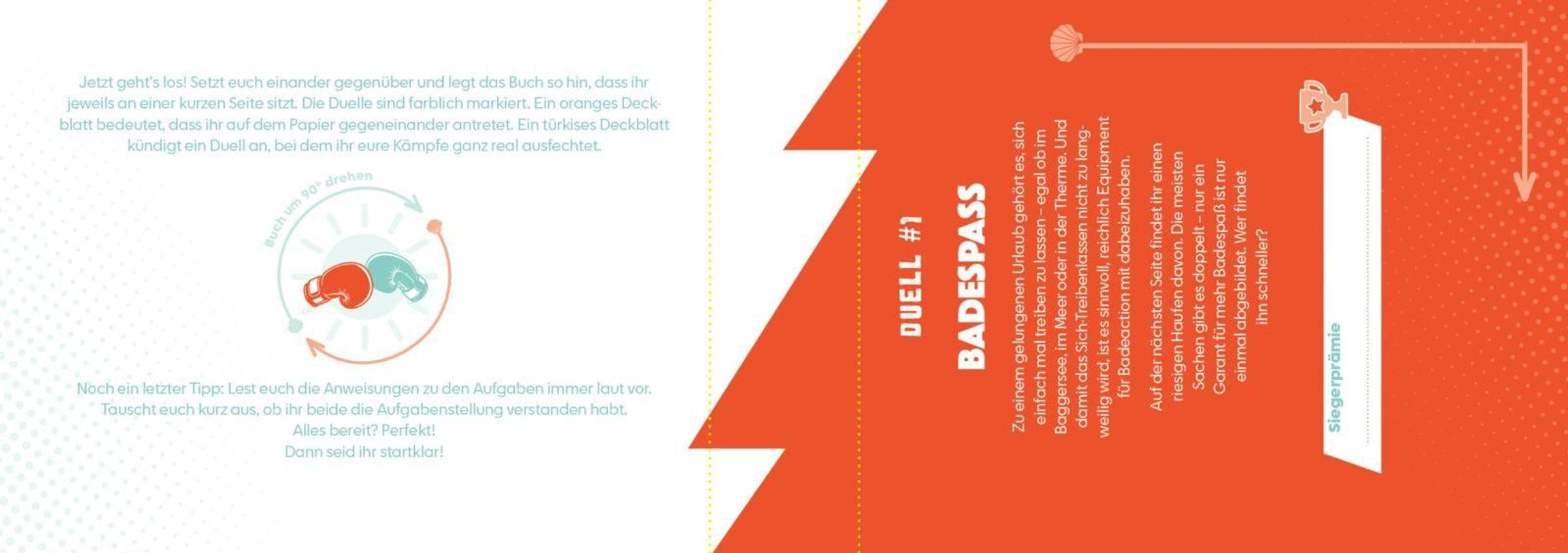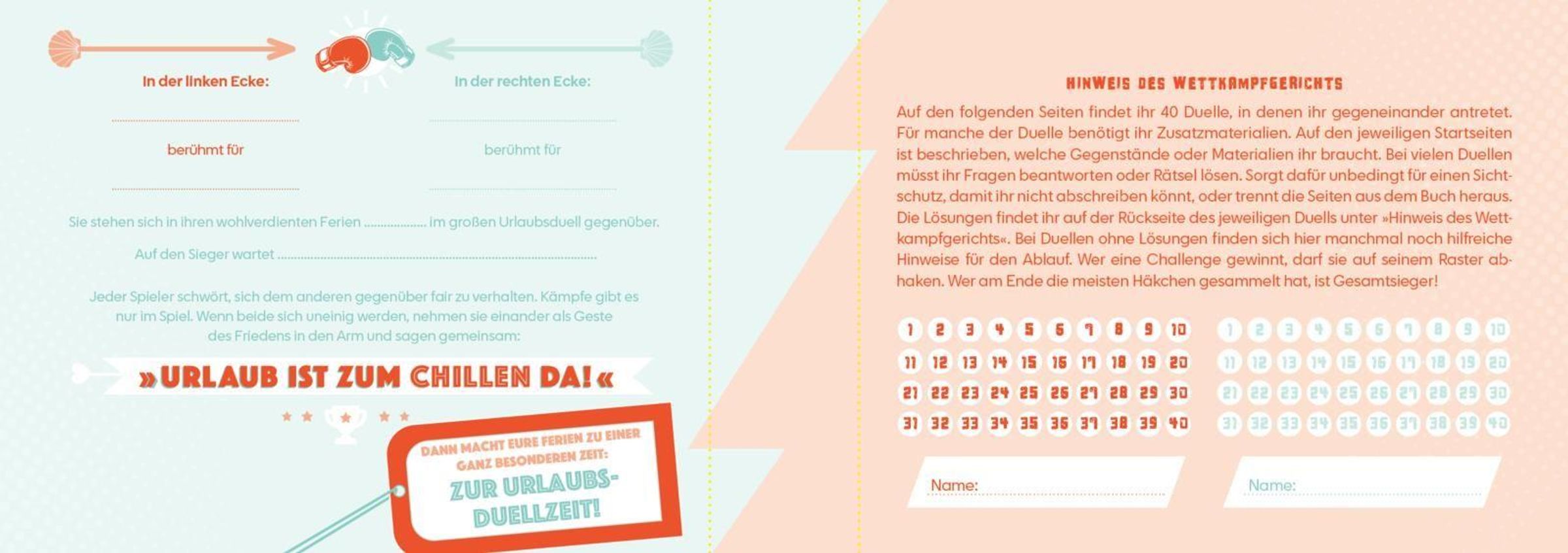 Leerlauf auf langen Reisen? Fehlanzeige! Dieses interaktive Buch bringt frischen Schwung in jede Reise. Egal ob im Bus, im Zug, im Flugzeug oder entspannt am Strand, mit der bunten Auswahl an kniffligen Logikrätseln, kreativen Zeichenaufgaben, blitzschnellen Wissensduellen und kleinen Challenges sorgt Das ultimative Urlaubsduell-Buch für jede Menge Abwechslung. Die hochwertige Ausstattung mit heraustrennbaren Seiten macht das Buch zu einem tollen Geschenk für alle, die gerne gemeinsam unterwegs sind und ihre Reise mit einer Prise Wettkampf verfeinern wollen. Also: Stifte gezückt und los geht's!