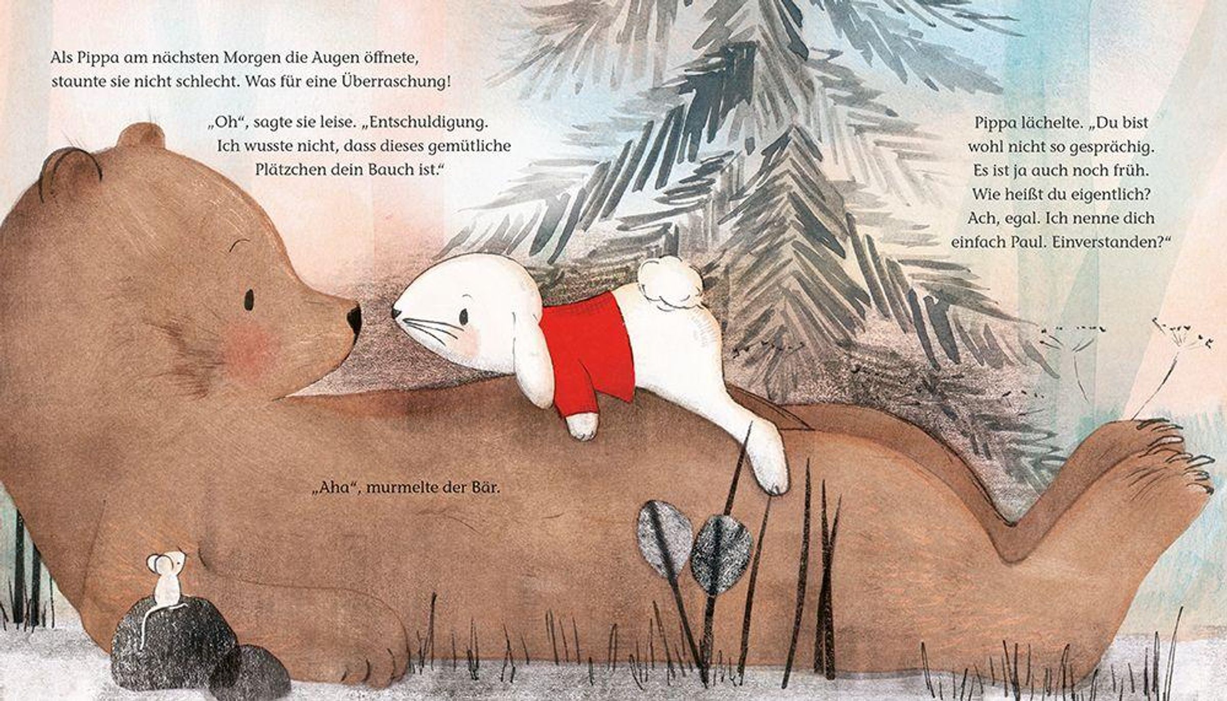 Als sie eines Abends ein besonders gemütliches Schlafplätzchen findet, ahnt sie nicht, dass sie am nächsten Morgen mitten auf dem Bauch eines Bären aufwacht.