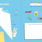 „Endlich Schulkind. Mein erstes Schuljahr“. Ein Zebra hält eine Schultüte, umgeben von Schulutensilien., Buch