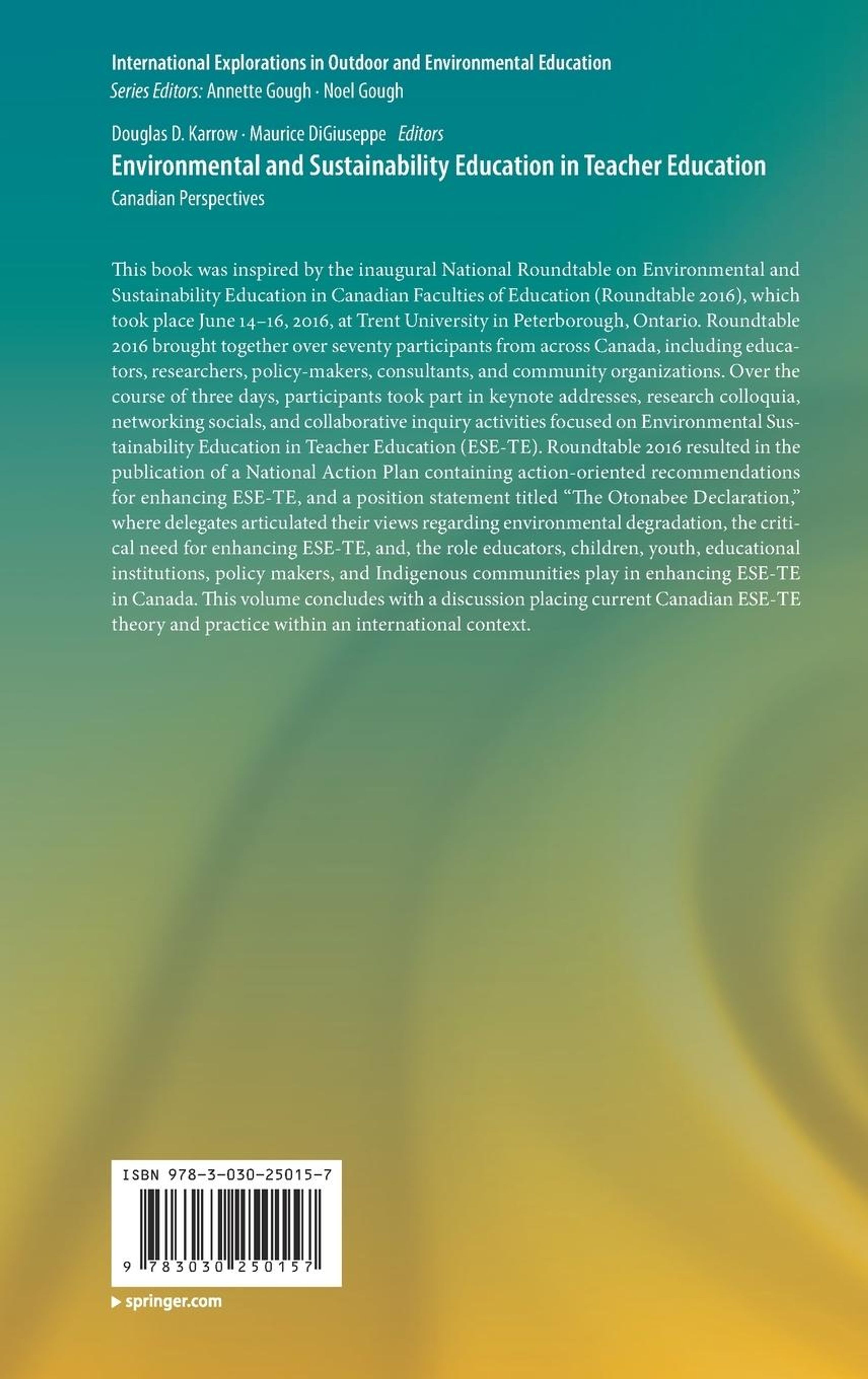 This book was inspired by the inaugural National Roundtable on Environmental and Sustainability Education in Canadian Faculties of Education (Roundtable 2016), which took place June 14-16, 2016, at Trent University in Peterborough, Ontario. Roundtable 2016 brought together over seventy participants from across Canada, including educators, researchers, policy-makers, consultants, and community organizations. Over the course of three days, participants took part in keynote addresses, research colloquia, networking socials, and collaborative inquiry activities focused on Environmental Sustainability Education in Teacher Education (ESE-TE). Roundtable 2016 resulted in the publication of a National Action Plan containing action-oriented recommendations for enhancing ESE-TE, and a position statement titled "The Otonabee Declaration," where delegates articulated their views regarding environmental degradation, the critical need for enhancing ESE-TE, and, the role educators, children, youth, educational institutions, policy makers, and Indigenous communities play in enhancing ESE-TE in Canada. This volume concludes with a discussion placing current Canadian ESE-TE theory and practice within an international context.