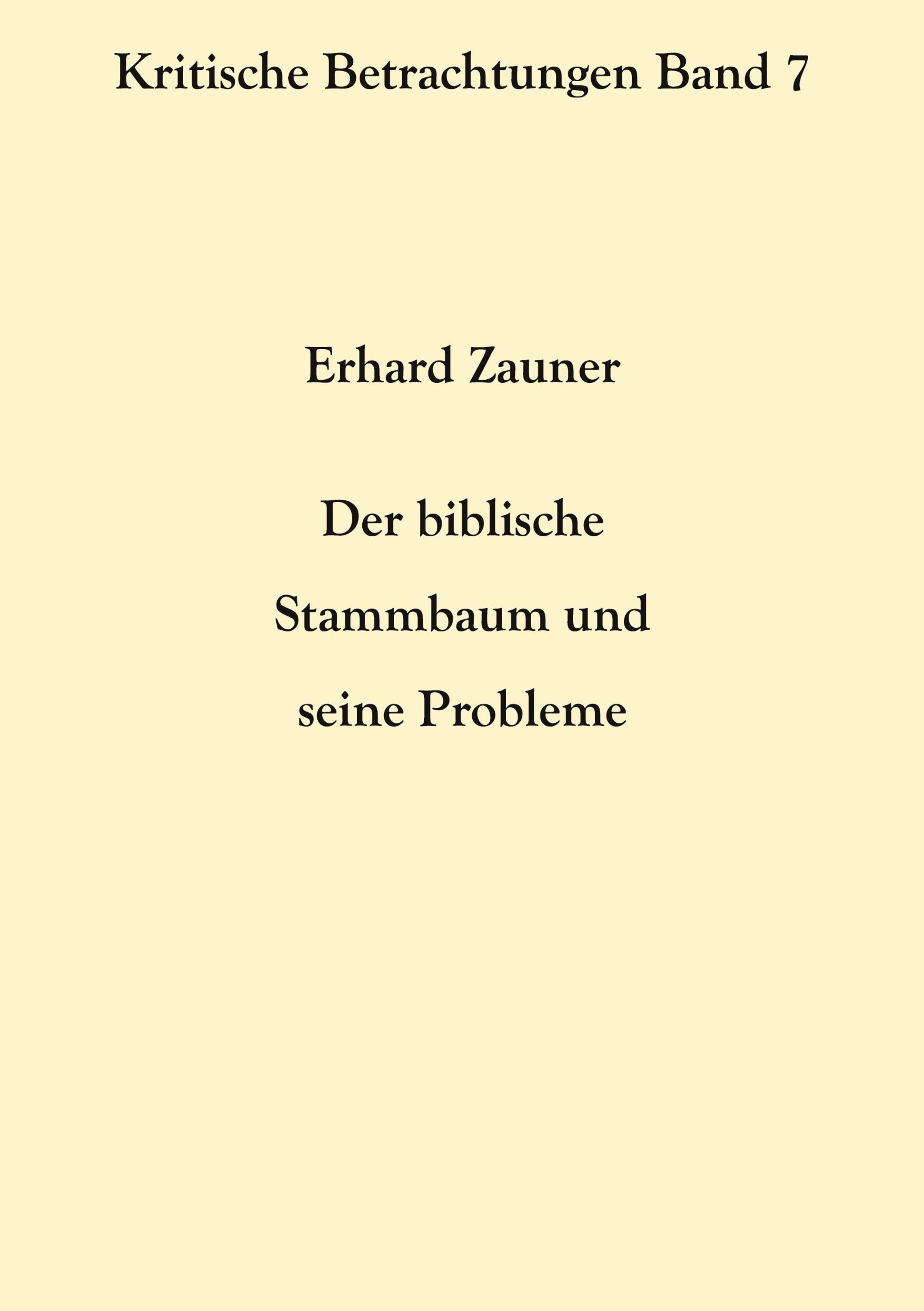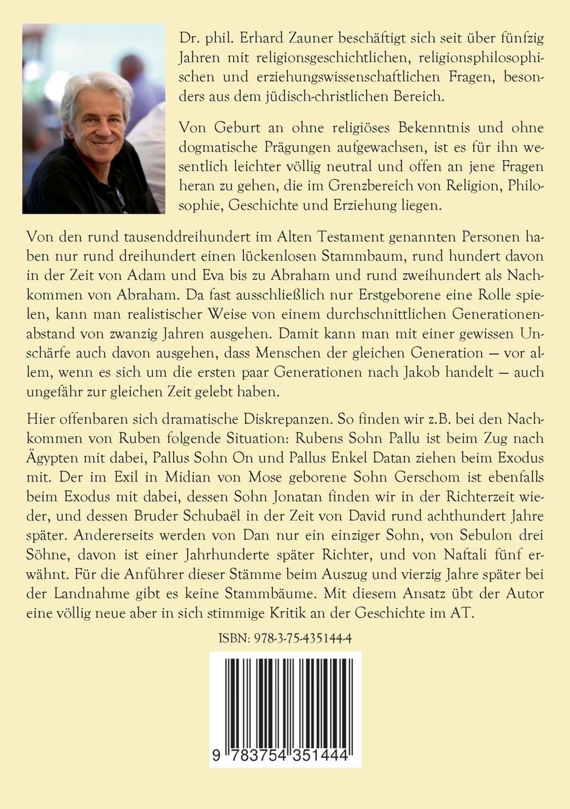 Von den rund tausenddreihundert im Alten Testament genannten Personen haben nur rund dreihundert einen lückenlosen Stammbaum, rund hundert davon in der Zeit von Adam und Eva bis zu Abraham und rund zweihundert als Nachkommen von Abraham. Da fast ausschließlich nur Erstgeborene eine Rolle spielen, kann man realistischer Weise von einem durchschnittlichen Generationenabstand von zwanzig Jahren ausgehen. Damit kann man mit einer gewissen Unschärfe auch davon ausgehen, dass Menschen der gleichen Generation - vor allem, wenn es sich um die ersten paar Generationen nach Jakob handelt - auch ungefähr zur gleichen Zeit gelebt haben. Hier offenbaren sich dramatische Diskrepanzen. So finden wir z. B. bei den Nachkommen von Ruben folgende Situation: Rubens Sohn Pallu ist beim Zug nach Ägypten mit dabei, Pallus Sohn On und Pallus Enkel Datan ziehen beim Exodus mit. Der im Exil in Midian von Mose geborene Sohn Gerschom ist ebenfalls beim Exodus mit dabei, dessen Sohn Jonatan finden wir in der Richterzeit wieder, und dessen Bruder Schubaël in der Zeit von David rund achthundert Jahre später. Andererseits werden von Dan nur ein einziger Sohn, von Sebulon drei Söhne, davon ist einer Jahrhunderte später Richter, und von Naftali fünf erwähnt. Für die Anführer dieser Stämme beim Auszug und vierzig Jahre später bei der Landnahme gibt es keine Stammbäume. Mit diesem Ansatz übt der Autor eine völlig neue aber in sich stimmige Kritik an der Geschichte im AT.
