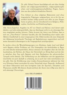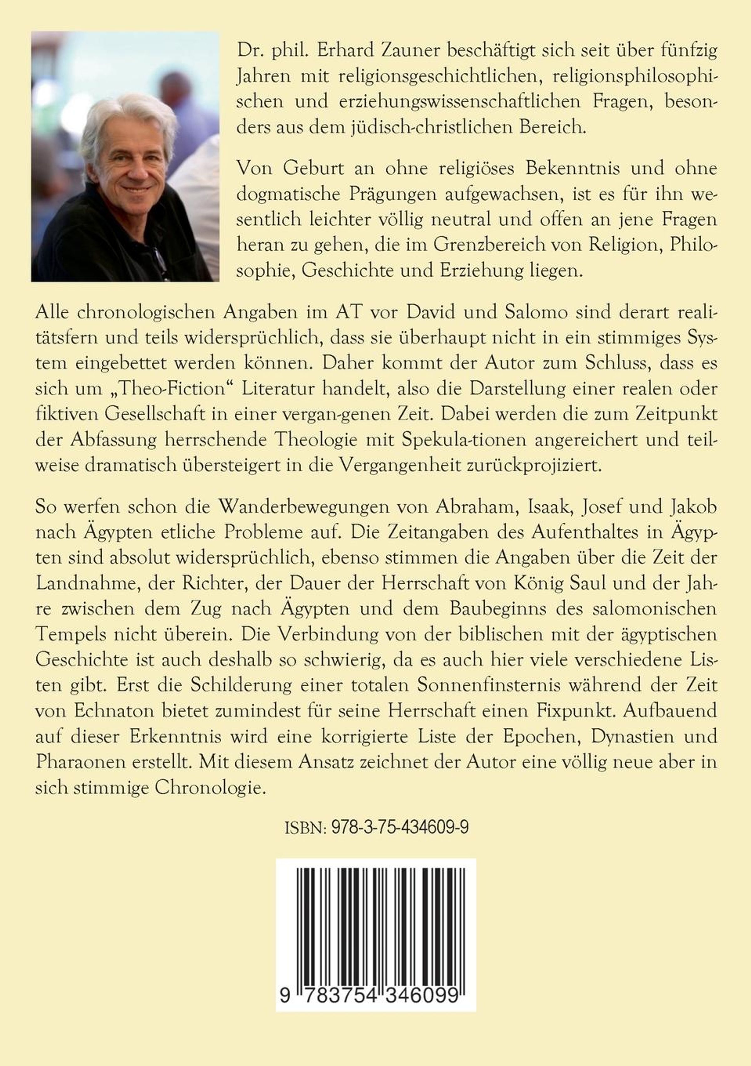 Alle chronologischen Angaben im AT vor David und Salomo sind derart realitätsfern und teils widersprüchlich, dass sie überhaupt nicht in ein stimmiges System eingebettet werden können. Daher kommt der Autor zum Schluss, dass es sich um "Theo-Fiction" Literatur handelt, also die Darstellung einer realen oder fiktiven Gesellschaft in einer vergangenen Zeit. Dabei werden die zum Zeitpunkt der Abfassung herrschende Theologie mit Spekulationen angereichert und teilweise dramatisch übersteigert in die Vergangenheit zurückprojiziert. So werfen schon die Wanderbewegungen von Abraham, Isaak, Josef und Jakob nach Ägypten etliche Probleme auf. Die Zeitangaben des Aufenthaltes in Ägypten sind absolut widersprüchlich, ebenso stimmen die Angaben über die Zeit der Landnahme, der Richter, der Dauer der Herrschaft von König Saul und der Jahre zwischen dem Zug nach Ägypten und dem Baubeginns des salomonischen Tempels nicht überein. Die Verbindung von der biblischen mit der ägyptischen Geschichte ist auch deshalb so schwierig, da es auch hier viele verschiedene Listen gibt. Erst die Schilderung einer totalen Sonnenfinsternis während der Zeit von Echnaton bietet zumindest für seine Herrschaft einen Fixpunkt. Aufbauend auf dieser Erkenntnis wird eine korrigierte Liste der Epochen, Dynastien und Pharaonen erstellt. Mit diesem Ansatz zeichnet der Autor eine völlig neue aber in sich stimmige Chronologie.