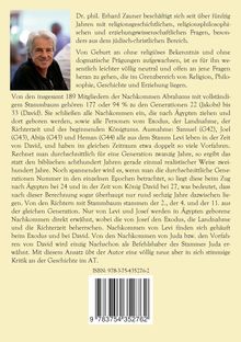 Von den insgesamt 189 Mitgliedern der Nachkommen Abrahams mit vollständigem Stammbaum gehören 177 oder 94 % zu den Generationen 22 (Jakobs) bis 33 (David). Sie schließen alle Nachkommen ein, die nach Ägypten ziehen und dort geboren werden, sowie alle Personen vom Exodus, der Landnahme, der Richterzeit und des beginnenden Königtums. Ausnahme: Samuel (G42), Joel (G43), Abija (G43) und Heman (G44) alle aus dem Stamm Levi leben in der Zeit von David, und haben im gleichen Zeitraum etwa doppelt so viele Vorfahren. Rechnet man durchschnittlich für eine Generation zwanzig Jahre, so ergibt das statt den biblischen achthundert Jahren gerade einmal realistischer Weise zweihundert Jahre. Noch spannender wird es, wenn man die durchschnittliche Generationen Nummer in den einzelnen Epochen betrachtet, so liegt diese beim Zug nach Ägypten bei 24 und in der Zeit von König David bei 27, was bedeutet, dass nach dieser Berechnung sogar überhaupt nur rund sechzig Jahre dazwischen liegen. Von den Richtern mit Stammbaum stammen der 2., der 4. und der 11. aus der gleichen Generation. Nur von Levi und Josef werden in Ägypten geborene Nachkommen direkt erwähnt, wobei die von Josef den Exodus, die Landnahme und die Richterzeit beherrschen. Nachkommen von Levi finden sich gehäuft beim Exodus und bei David. Von den Nachkommen von Juda bzw. den Vorfahren von David wird einzig Nachschon als Befehlshaber des Stammes Juda erwähnt. Mit diesem Ansatz übt der Autor eine völlig neue aber in sich stimmige Kritik an der Geschichte im AT.
