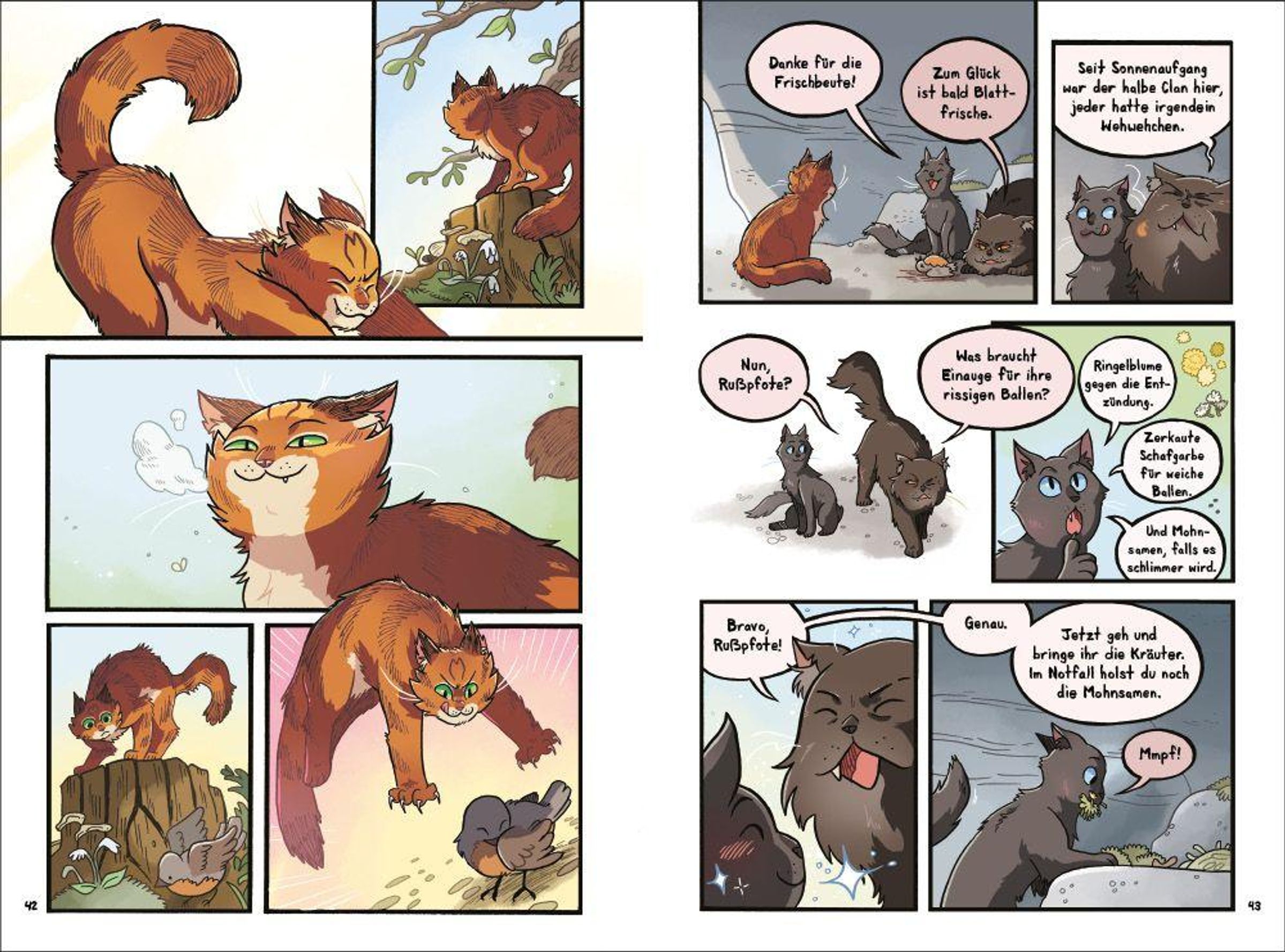 Vier Katzenclans leben seit Generationen verborgen im Wald, fern der Menschenwelt. Lebendige Illustrationen mit leuchtenden Farben und energiegeladenen Linien erwecken ihre Welt zum Leben: giftgrüne Augen, fließende Bewegungen und kraftvolle Szenen prägen das Bild. Sie kämpfen um Nahrung, Territorien - und um Liebe und Freundschaft. Die Bestseller-Reihe "Warrior Cats" wird als Graphic Novel adaptiert - in drei Bänden erzählt sie die Geschichte der ersten Staffel neu. Erlebe wie Sammy - ausgerechnet ein Hauskätzchen! - zum mutigsten Katzenkrieger aller Zeiten aufsteigen und seinen Clan retten wird.