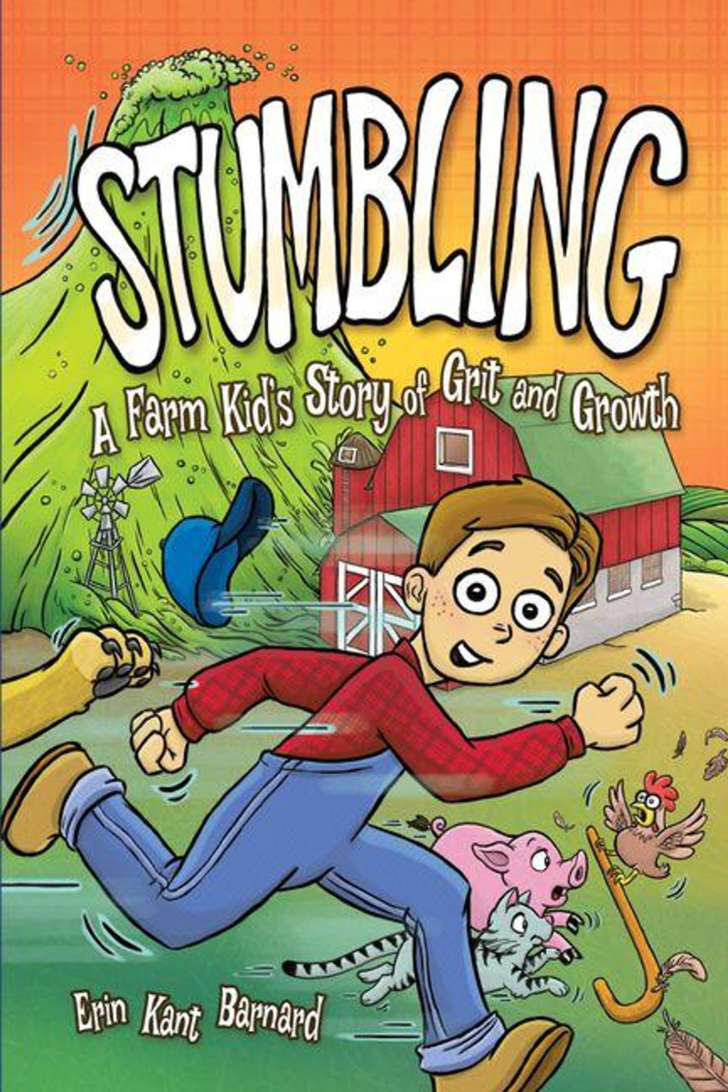 „STUMBLING: A Farm Kid's Story of Grit and Growth. Erin Kant Barnard.” Ein Junge auf dem Bauernhof läuft fröhlich., Buch