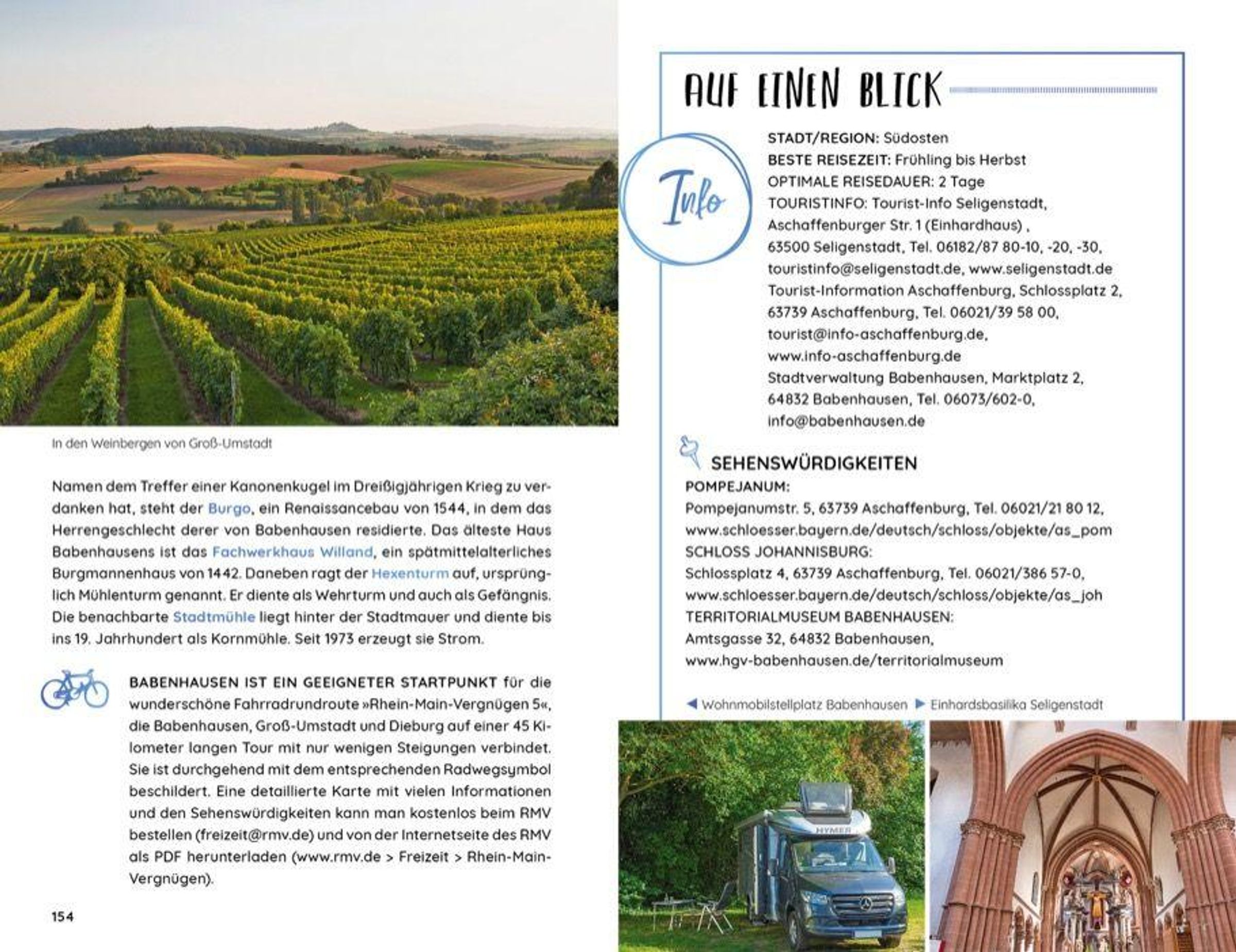 Zwischen Rheingau, Taunus, Spessart und Reinhessen breitet sich das wunderschöne Rhein-Main-Gebiet aus. Mit der Metropole Frankfurt und den Großstädten Mainz, Wiesbaden und Darmstadt, die unterschiedlicher kaum sein könnten, lässt diese Region keine Wünsche offen. Erkunden Sie die Gegend mit dem Wohnmobil! Ernst Wrba führt Sie zu den 15 schönsten Zielen, seinen persönlichen Geheimtipps und den passenden Stell- und Campingplätzen.