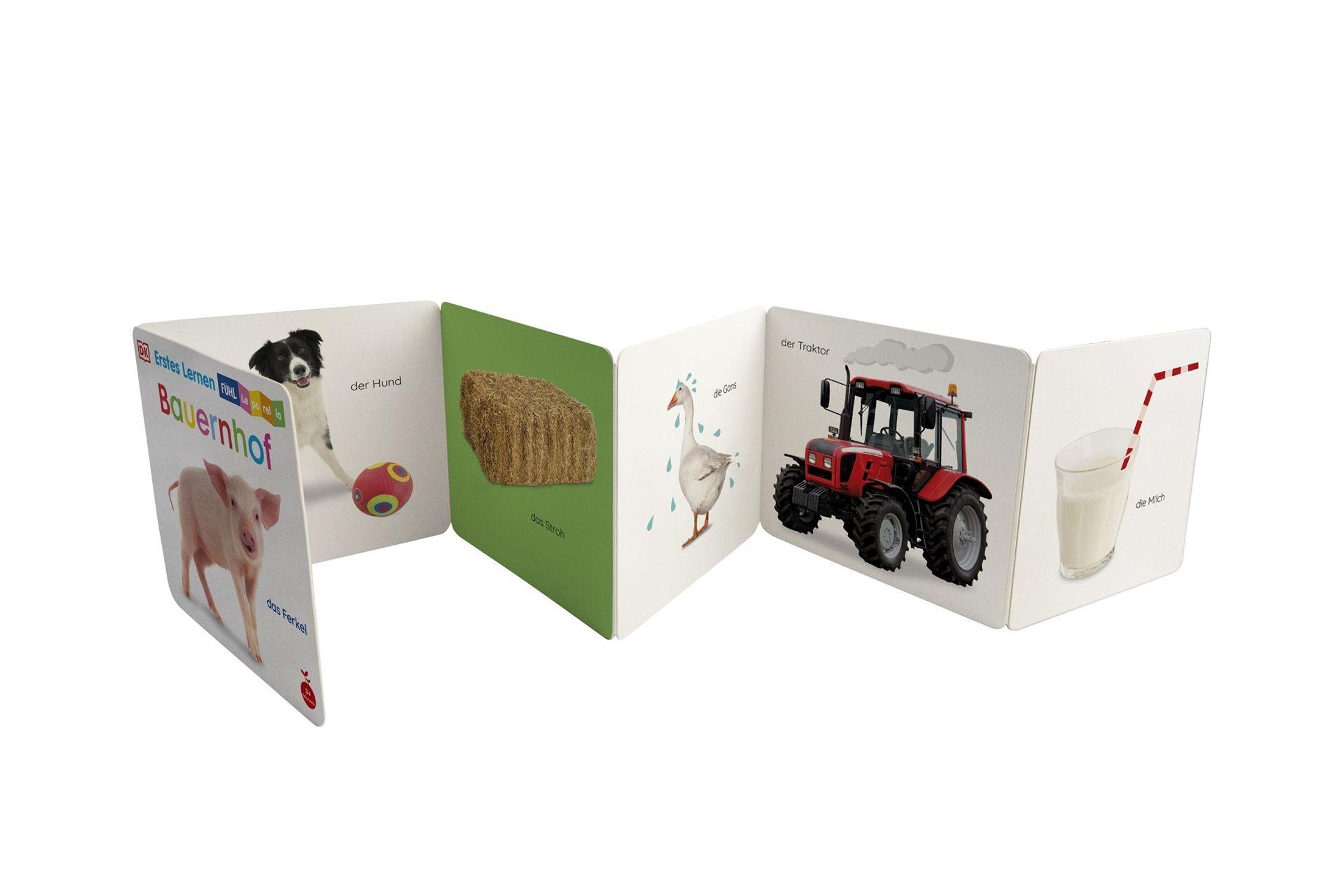 Ob Schaf, Ei oder Hund: Im aufgestellten 77 cm langen Pappbilderbuch begegnen die Mädchen und Jungen typischen Tieren und Gegenständen vom Bauernhof - im bekannten Stil der DK "Erstes Lernen"-Bücher mit realistischen Fotos und einfacher Beschriftung . Zusätzlich sorgt ein Fühlelement auf jeder Seite für haptische Erlebnisse, fördert die Sinneswahrnehmung und lädt zum gemeinsamen "Begreifen" ein: vom weichen Fell bis zum rauen Stroh.