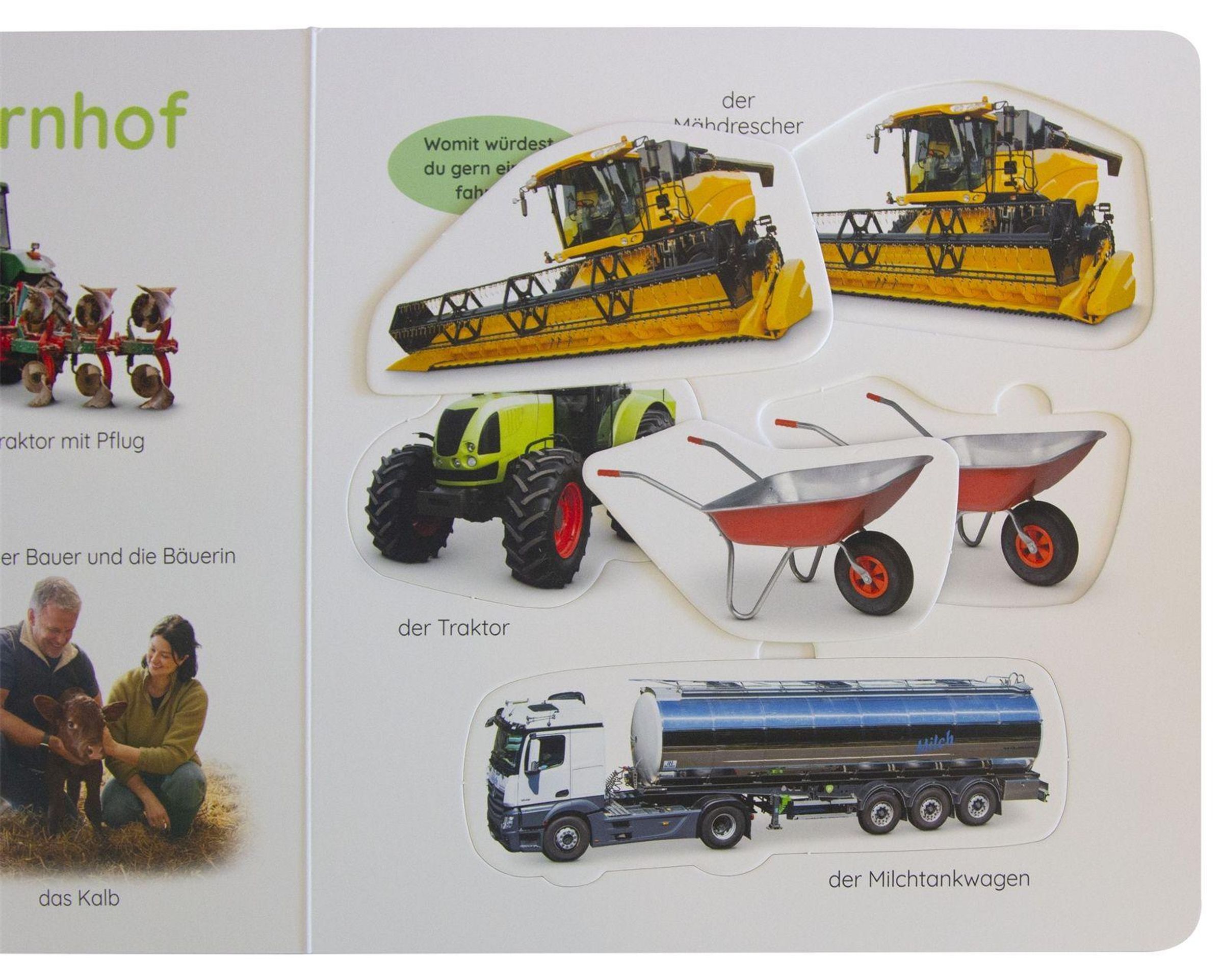 Ob Traktor und Mähdrescher auf dem Bauernhof, Bagger und Kran auf der Baustelle oder Feuerwehr und Polizei beim Rettungseinsatz: Auf 5 Doppelseiten entdecken Kinder ab 18 Monaten die große Vielfalt der Fahrzeuge - darunter mehr als 20 Ausstanzungen mit passenden Puzzle-Teilen . Diese lassen sich einfach greifen und passen genau in eine Lücke mit identischem Foto. Ist es das richtige Teil oder doch nicht? Vielleicht noch einmal drehen ... ah, jetzt sitzt es! Beim Ausprobieren, Zuordnen und Einfügen trainiert das Kinderbuch spielerisch die Formerkennung, Feinmotorik und Konzentration bei Kleinkindern .