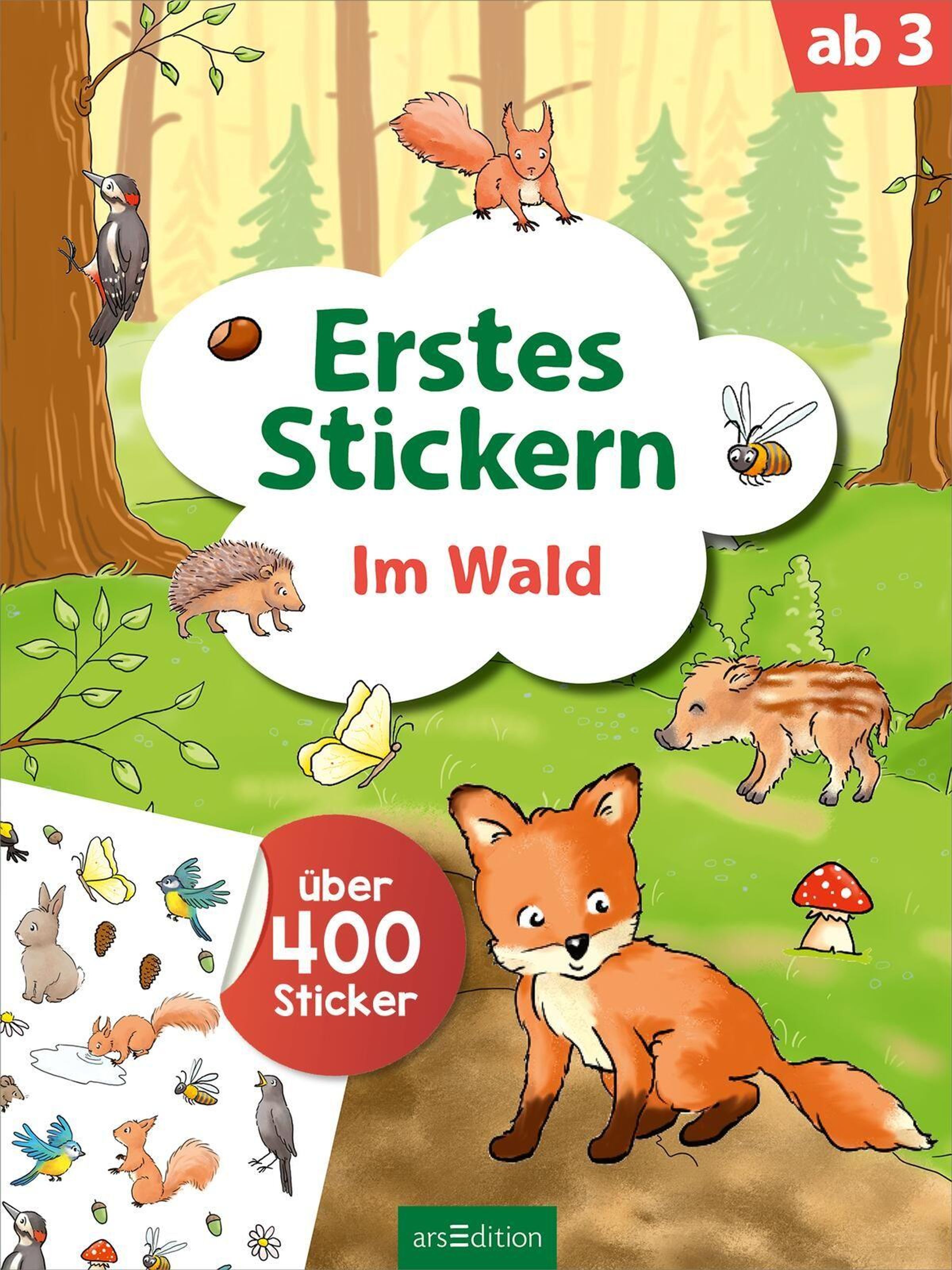 "Erstes Stickern Im Wald" ab 3, über 400 Sticker. Illustration: Waldszene mit Tieren wie Fuchs, Eichhörnchen, Igel., Buch
