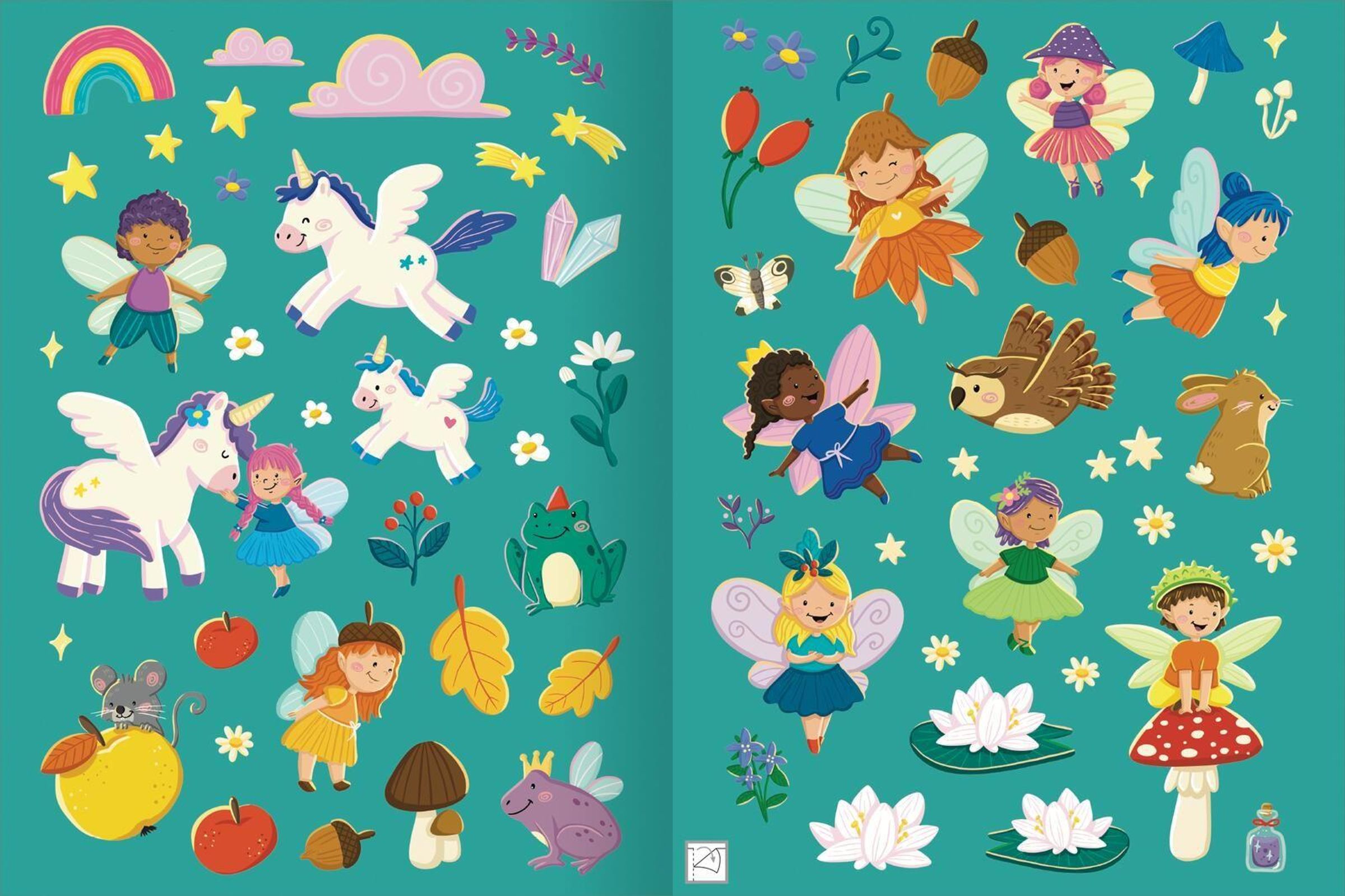 Das großformatige Stickerbuch bietet jede Menge Raum, der Fantasie freien Lauf zu lassen und eigene, schillernde Szenen rund um das Thema Feen zu erschaffen.