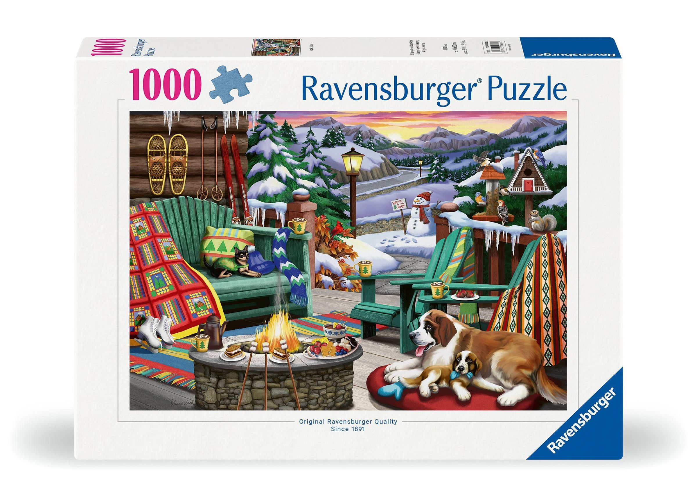 "1000 Ravensburger Puzzle." Ein gemütliches Winterdeck mit Stühlen, Hund, Katze und einem schneebedeckten Bergblick., Spiele