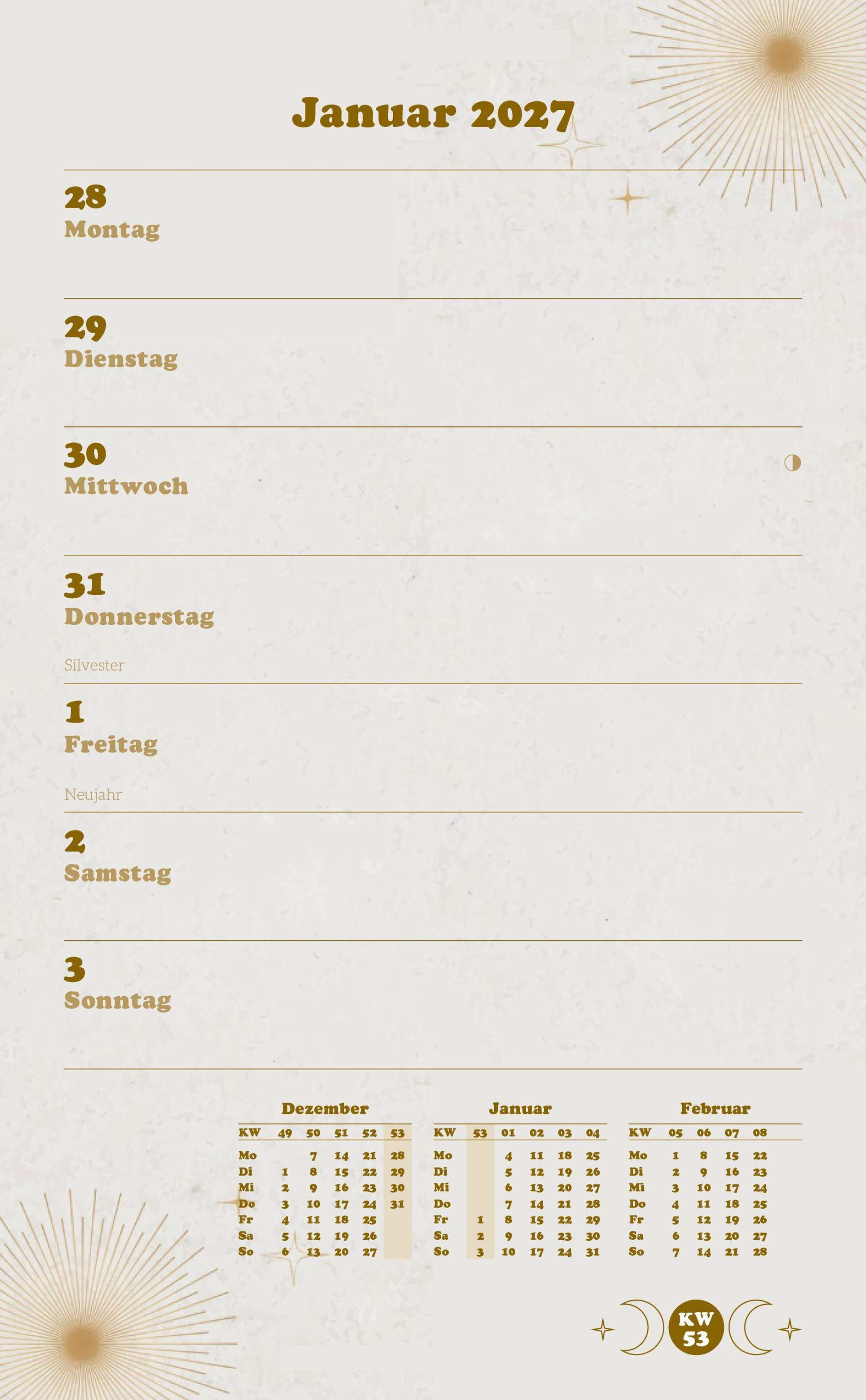 „Erwecke die Göttin in dir 2027" ist mehr als ein Kalender -- es ist ein wöchentlicher Begleiter für mehr Bewusstsein, innere Verbindung und liebevolle Selbstbegleitung durch das Jahr.
