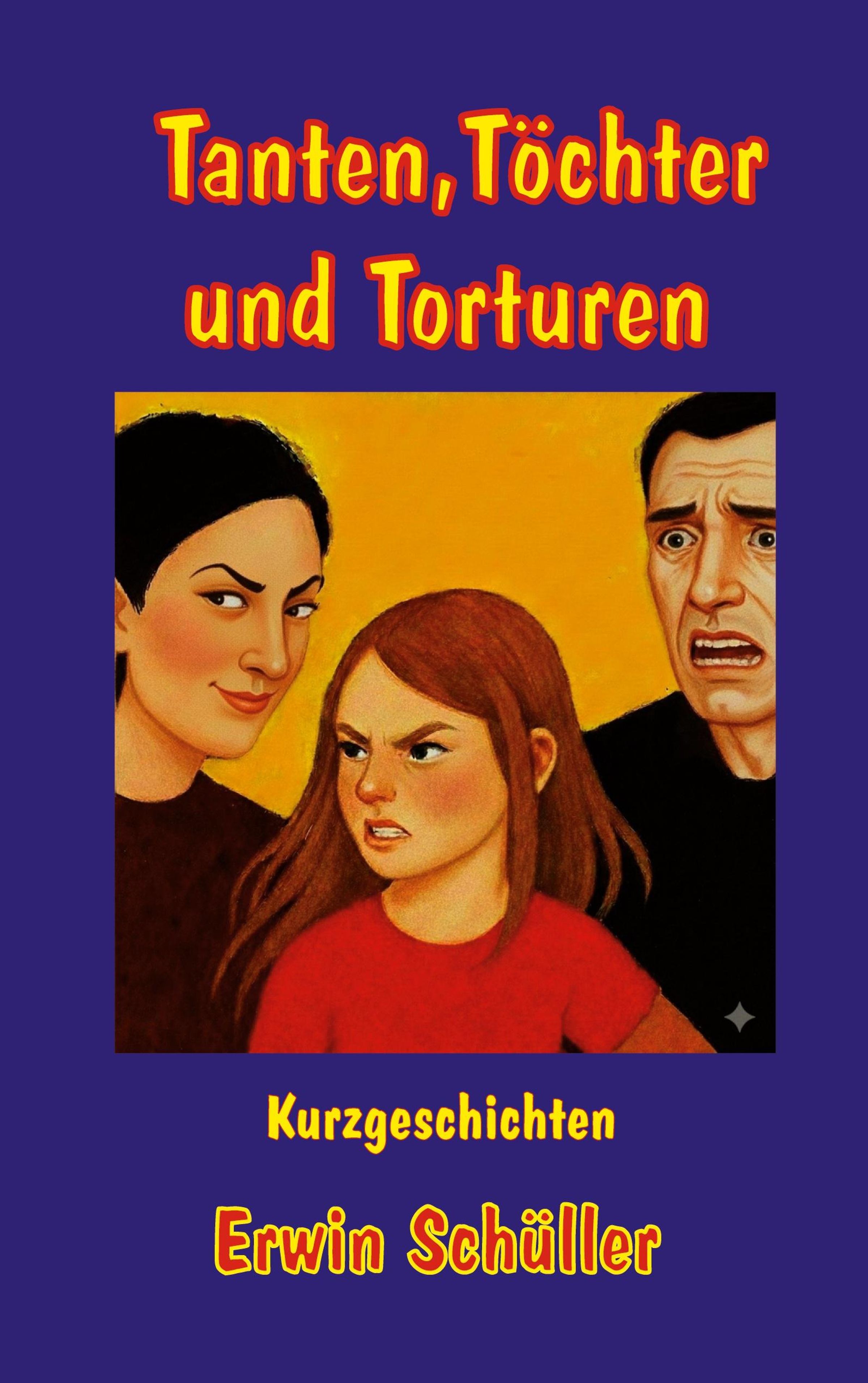 "Tanten, Töchter und Torturen" und "Kurzgeschichten Erwin Schüller". Illustration: Drei Personen mit ernsten Gesichtsausdrücken., Buch