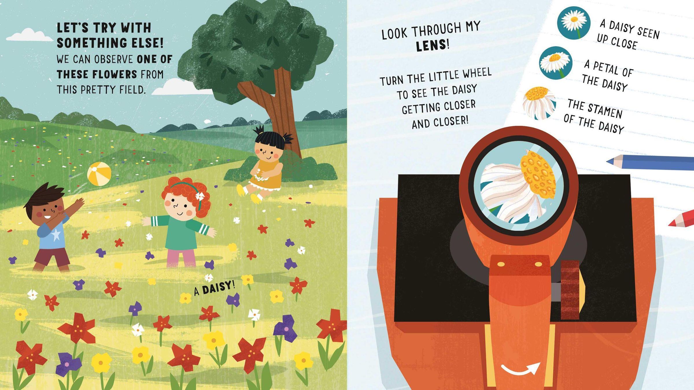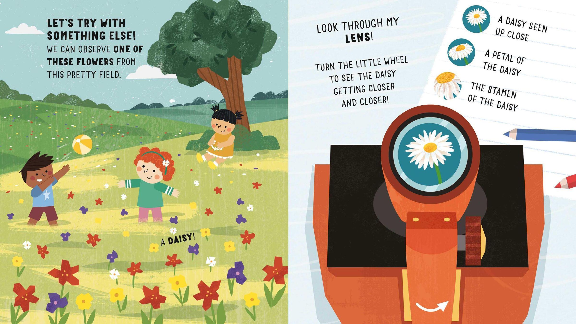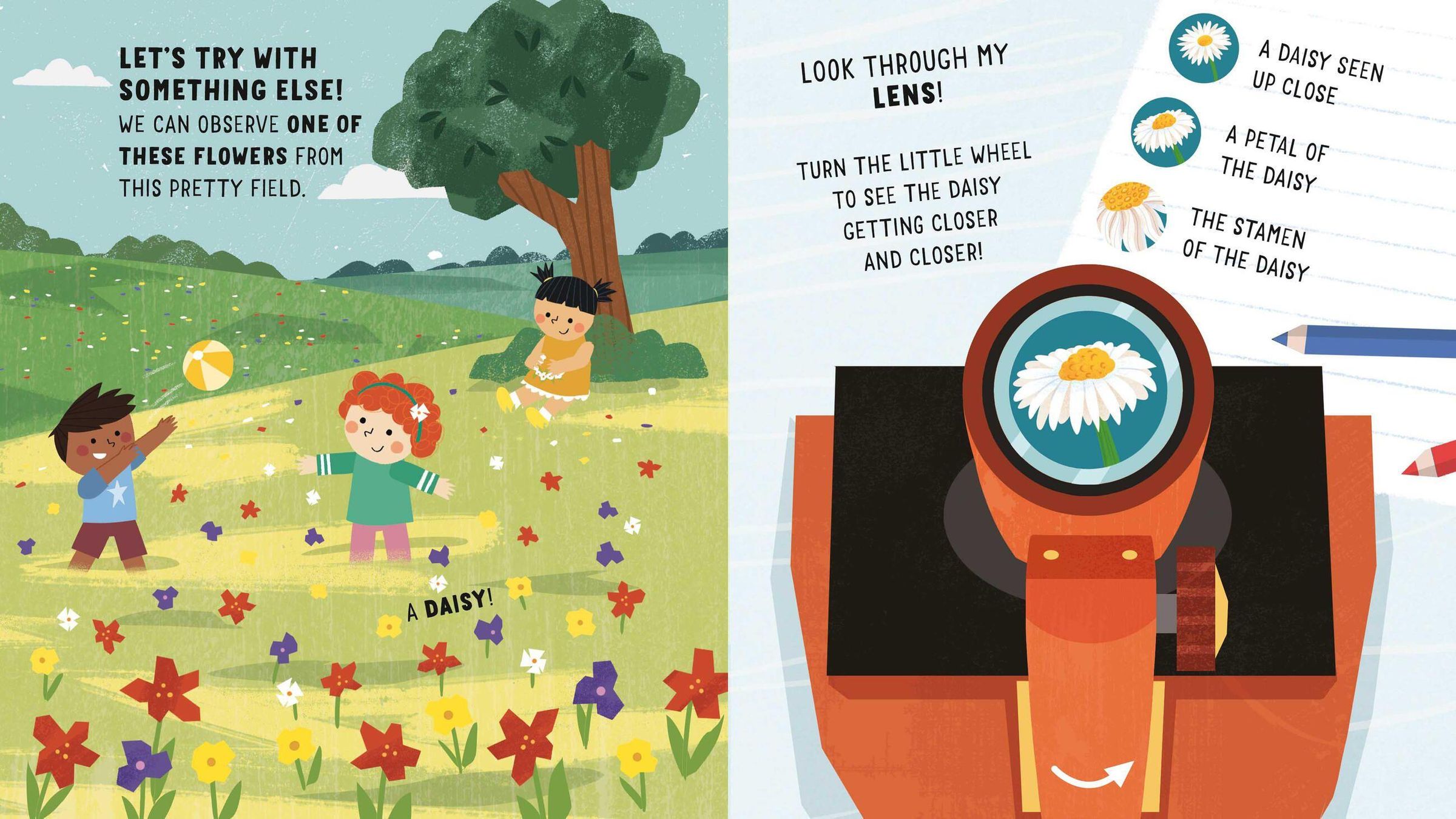 On each page, children are able to take a closer look at an ant, a flower, a pile of sand, and a snowflake to find out what they look like up close. They just need to turn the wheel to "zoom in"! Colorful illustrations by Esme Lee, short engaging text, and a book kids can play with are the perfect tools to stimulate their curiosity and desire to explore the natural world.