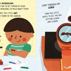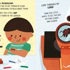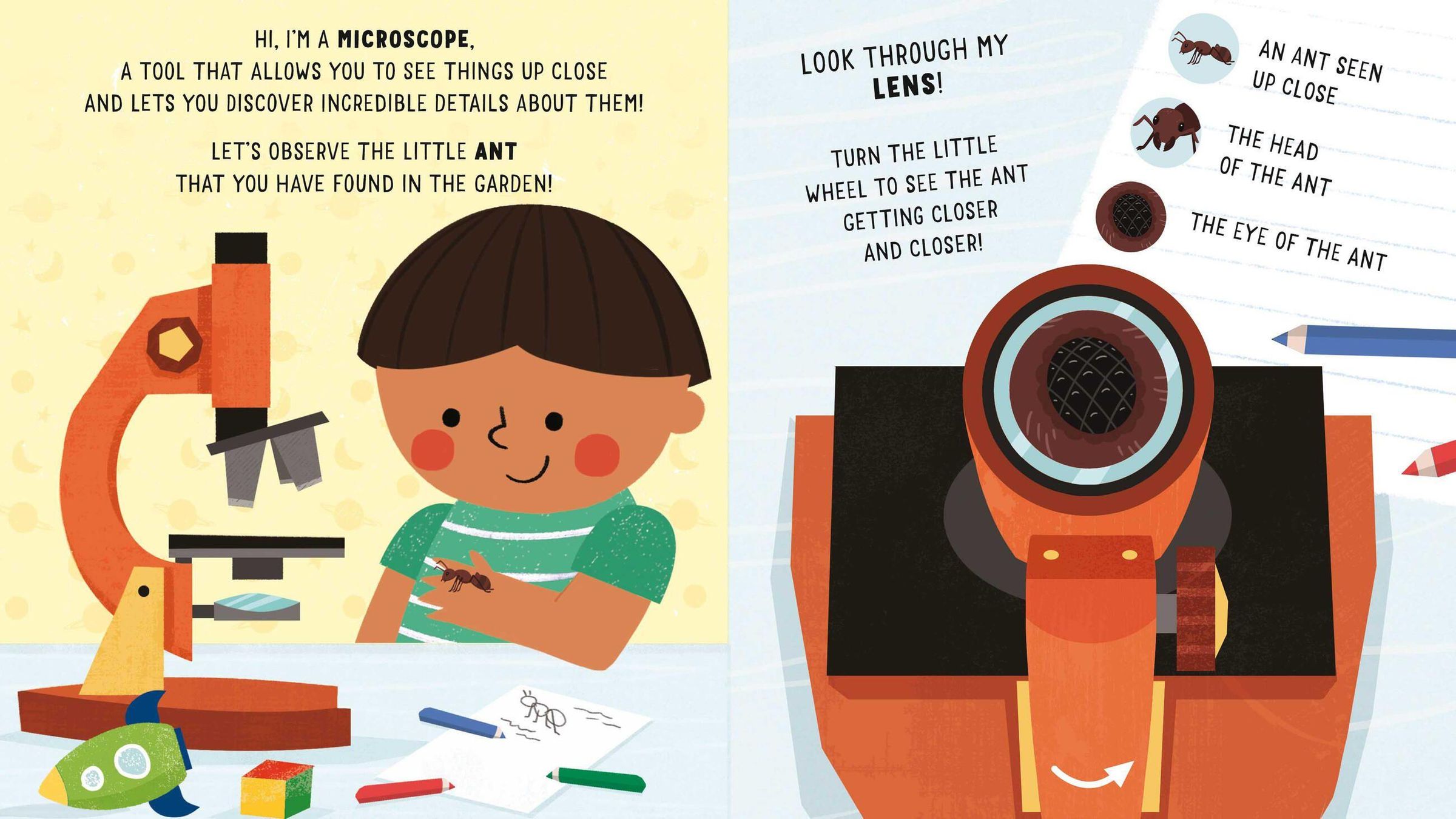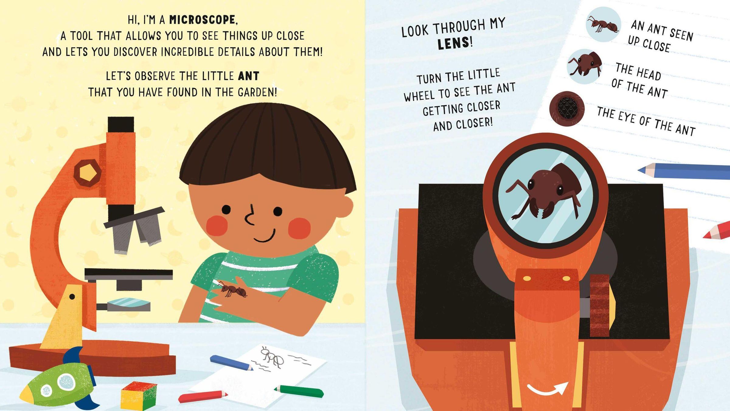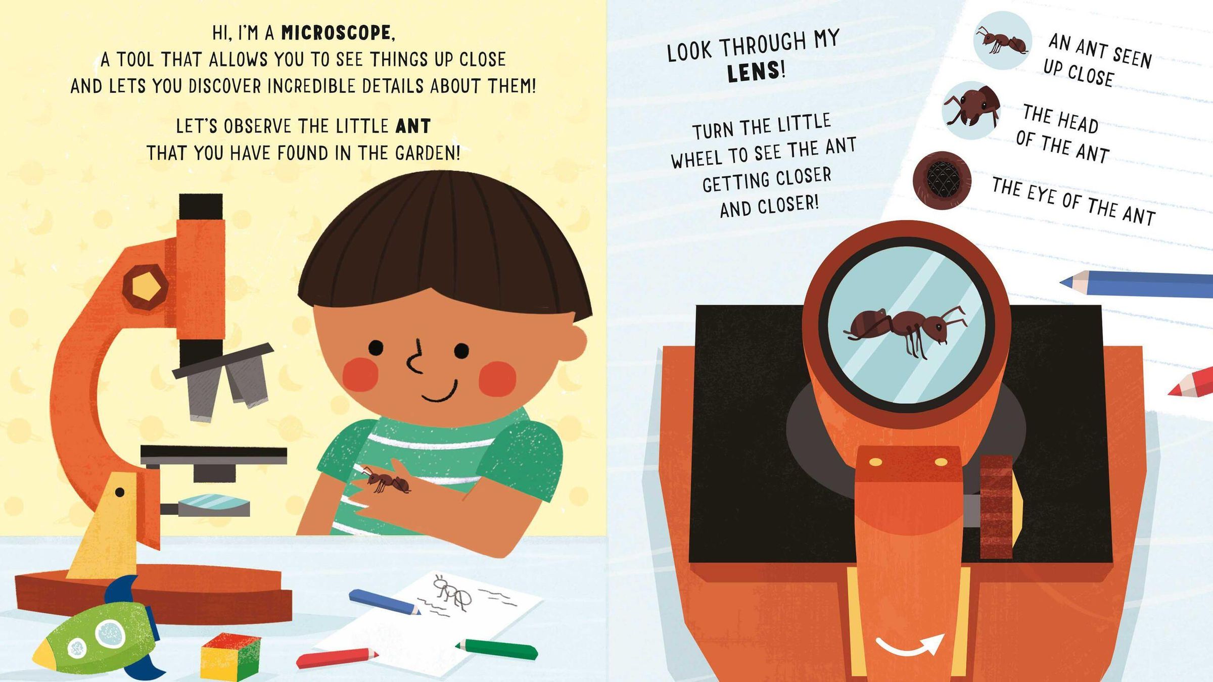 On each page, children are able to take a closer look at an ant, a flower, a pile of sand, and a snowflake to find out what they look like up close. They just need to turn the wheel to "zoom in"! Colorful illustrations by Esme Lee, short engaging text, and a book kids can play with are the perfect tools to stimulate their curiosity and desire to explore the natural world.