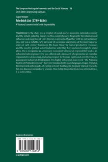 Friedrich List (1789-1846) was a prophet of social market economy, national economy and the infant-industry theory. In this comprehensive biography the international influence and reception of Lists theories is presented together with his extraordinary vita. List was a notable early advocate of economic integration of the many separate states of 19th century Germany. His basic theory is that of productive resources and the need to protect infant industries until they have matured enough to stand alone. He is recognized as a visionary economist with social responsibility and as an influential railway pioneer. He was a liberal and a democrat who promoted an extended representative democracy, including respect for human rights and civil liberties, to accompany industrial development. His highly influential main work The National System of Political Economy has been translated into many languages. Eugen Wendler, the renowned author and List expert, not only builds upon his many years of research, but also discusses several new sources. This richly illustrated book is as informative as it is well written.