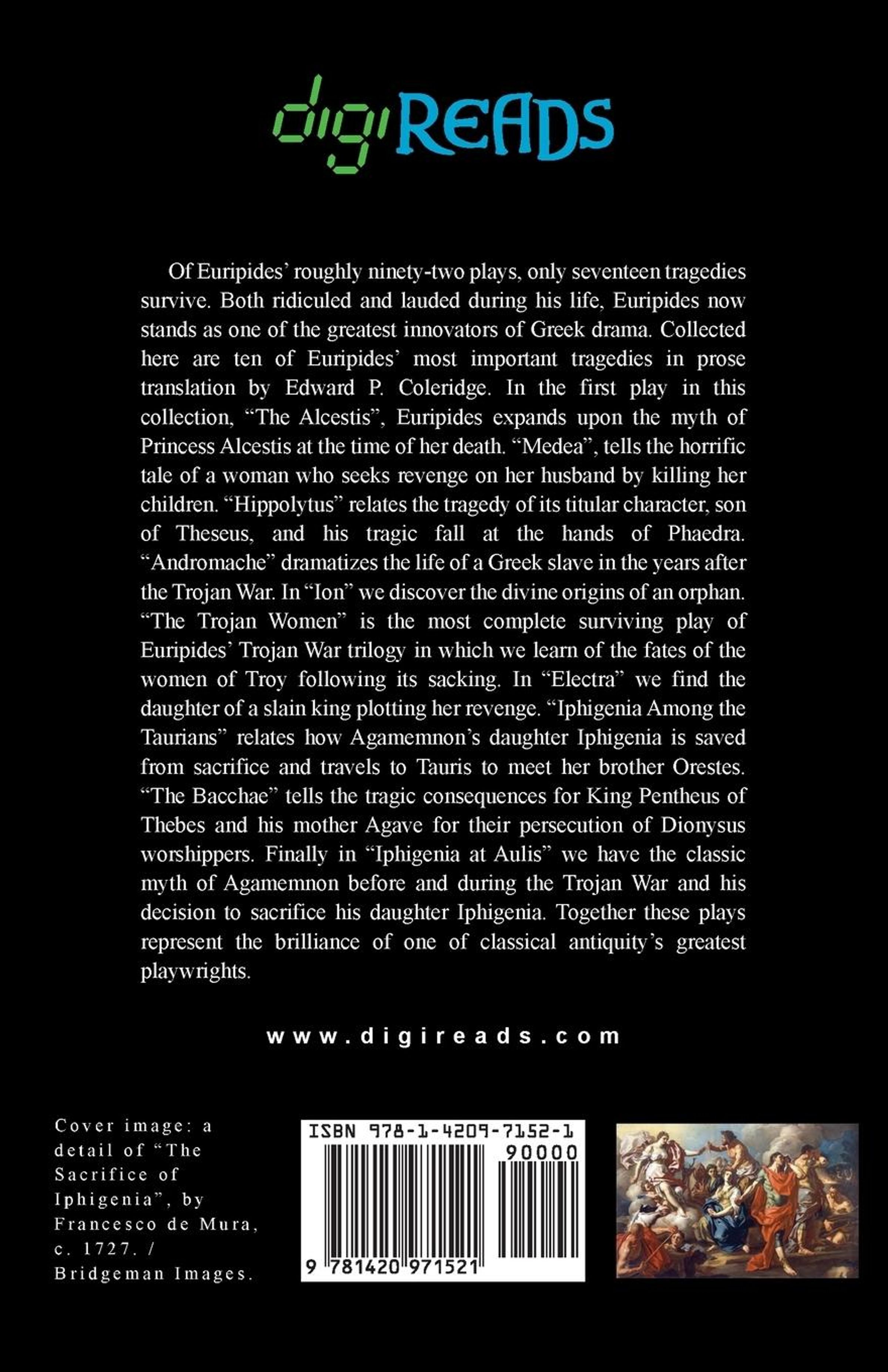 Of Euripides' roughly ninety-two plays, only seventeen tragedies survive. Both ridiculed and lauded during his life, Euripides now stands as one of the greatest innovators of Greek drama. Collected here are ten of Euripides' most important tragedies in prose translation by Edward P. Coleridge. In the first play in this collection, "The Alcestis", Euripides expands upon the myth of Princess Alcestis at the time of her death. "Medea", tells the horrific tale of a woman who seeks revenge on her husband by killing her children. "Hippolytus" relates the tragedy of its titular character, son of Theseus, and his tragic fall at the hands of Phaedra. "Andromache" dramatizes the life of a Greek slave in the years after the Trojan War. In "Ion" we discover the divine origins of an orphan. "The Trojan Women" is the most complete surviving play of Euripides' Trojan War trilogy in which we learn of the fates of the women of Troy following its sacking. In "Electra" we find the daughter of a slain king plotting her revenge. "Iphigenia Among the Taurians" relates how Agamemnon's daughter Iphigenia is saved from sacrifice and travels to Tauris to meet her brother Orestes. "The Bacchae" tells the tragic consequences for King Pentheus of Thebes and his mother Agave for their persecution of Dionysus worshippers. Finally in "Iphigenia at Aulis" we have the classic myth of Agamemnon before and during the Trojan War and his decision to sacrifice his daughter Iphigenia. Together these plays represent the brilliance of one of classical antiquity's greatest playwrights. This edition is printed on premium acid-free paper.