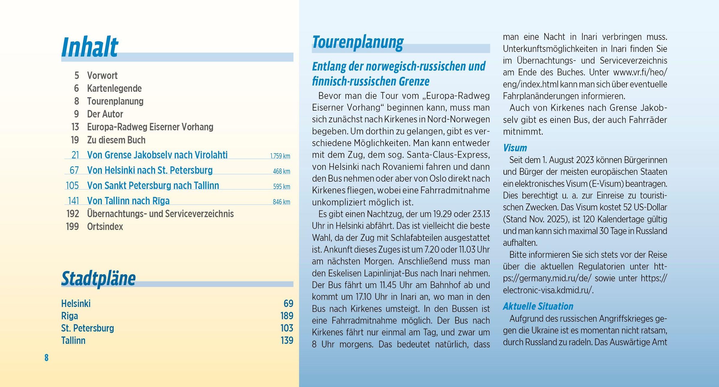 Geschichte im wahrsten Sinne des Wortes erfahrbar zu machen - das ist das Ziel vom "Europa-Radweg Eiserner Vorhang". Von der Barentssee bis zum Schwarzen Meer führt er auf den Spuren des Kalten Krieges quer durch Europa. Dabei verbindet die Route nicht nur europäische Kultur, Geschichte und nachhaltigen Tourismus, sondern leitet geschichtsinteressierte Radler entlang des Europäischen Grünen Bandes auch durch abwechslungsreiche Landschaften und einzigartige Biotope, die im Grenzstreifen entstehen konnten. Bei der überarbeiteten Neuauflage wird laminiertes Papier benutzt und die Karten bekommen andere Maßstäbe. Deshalb wird es statt drei nun fünf Bücher geben. Dieser erste Band dokumentiert den fast 4.000 Kilometer langen nördlichen Teil der Route von Grense Jakobselv an der norwegisch-russischen Grenze bis zur lettischen Hauptstadt Riga. Dabei radelt man von den beeindruckenden Weiten Norwegens und Finnlands über den russischen, estnischen und lettischen Teil vom Ostseeküsten-Radweg nach Riga, wobei der Abschnitt ab Helsiniki ebenfalls integriert wurde.