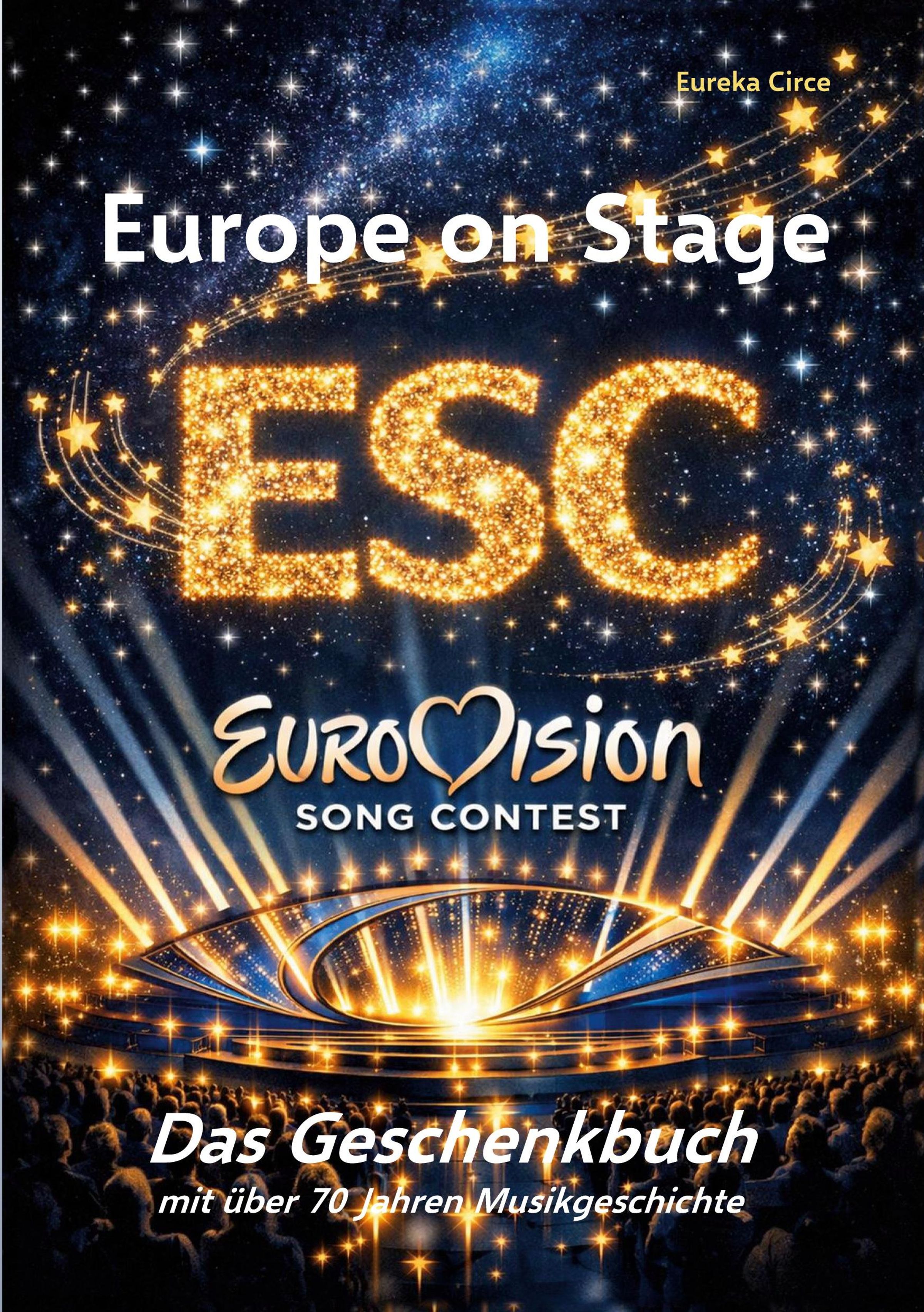 Text: "Europe on Stage", "ESC", "Eurovision Song Contest", "Das Geschenkebuch", "mit über 70 Jahren Musikgeschichte". Illustration: Sterne, Bühne., Buch