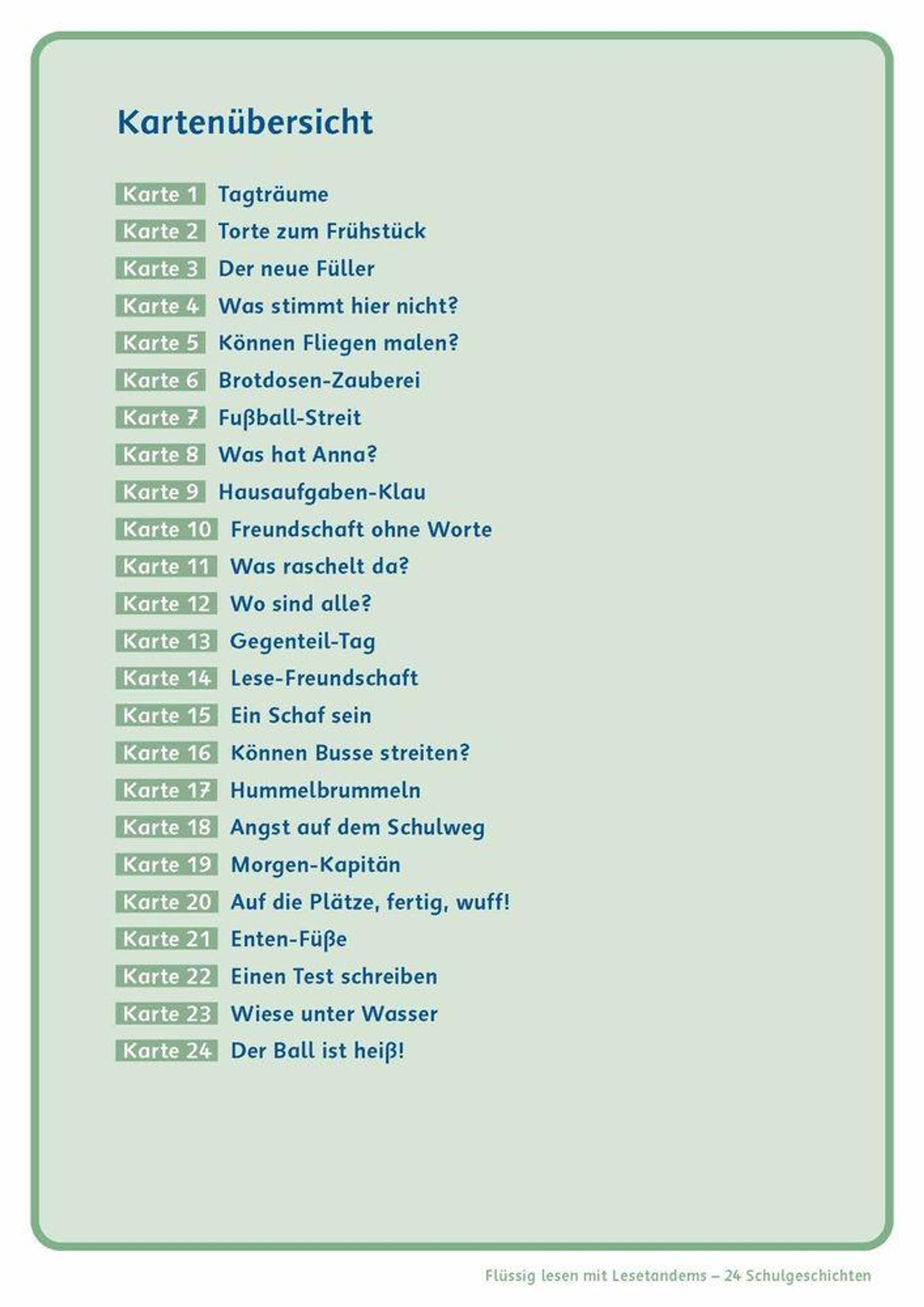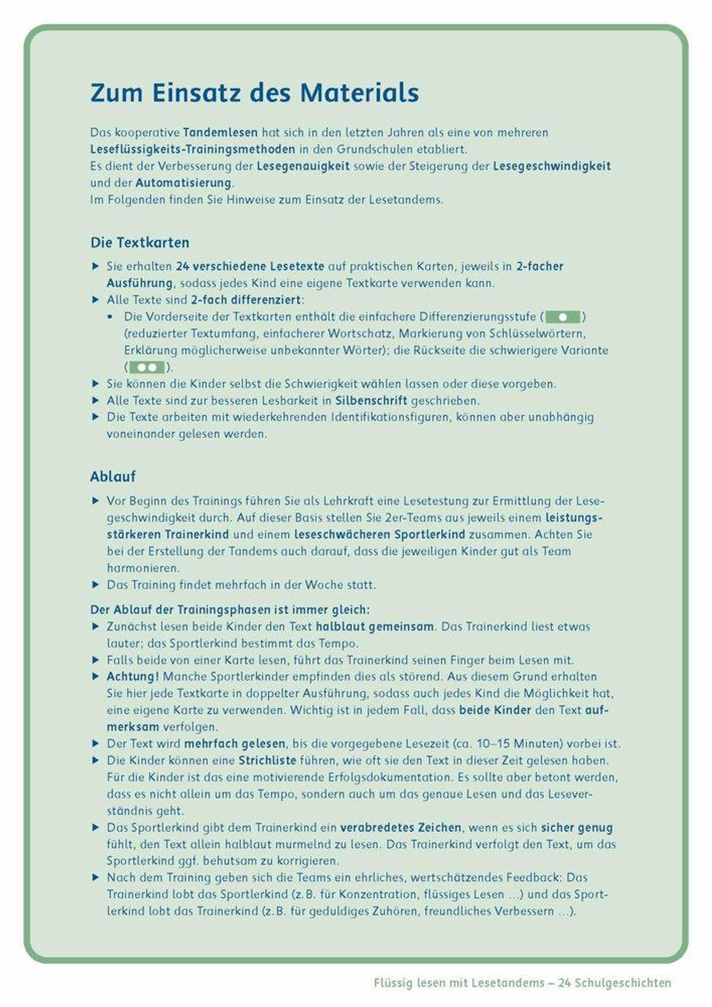 Und so geht's: Ein lesestarkes und ein eher leseschwaches Kind arbeiten als Lesetandem zusammen mit demselben Text. Gemeinsam lesen sie die Geschichte halblaut und trainieren durch chorisches Lesen ihre Leseflüssigkeit. Damit das kooperative Lernen problemlos gelingt, gibt es alle Textkarten in doppelter Ausführung - so erhält jedes Kind seine eigene Textkarte.