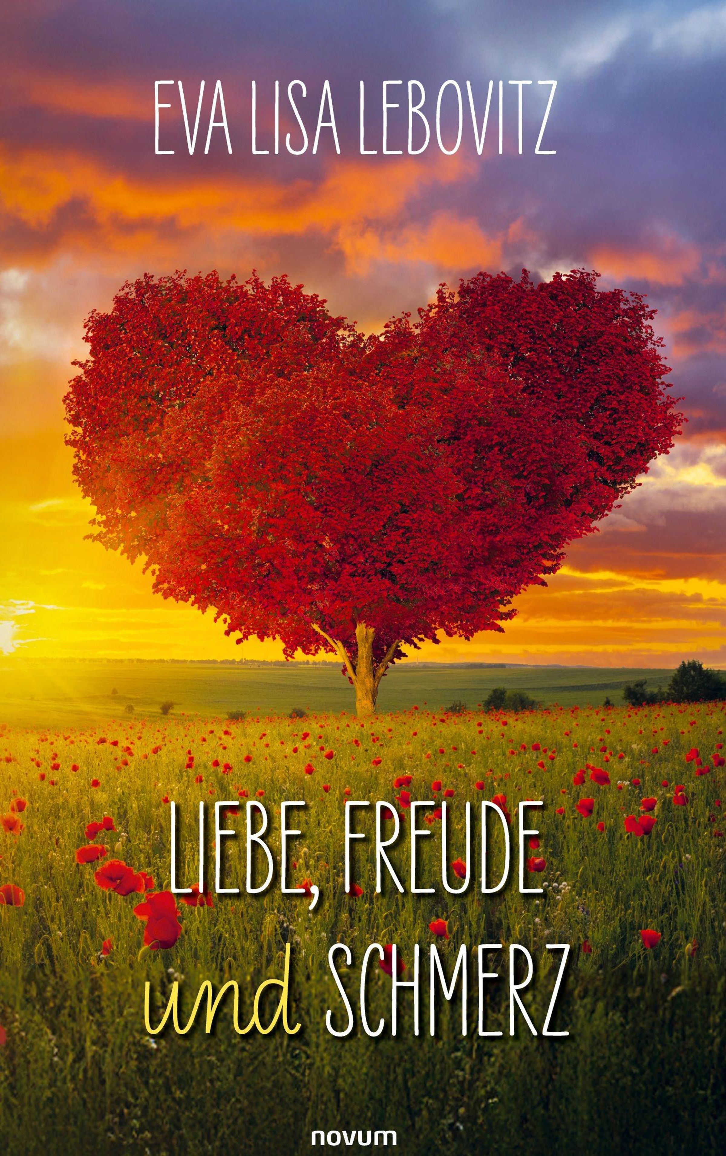 Text: "EVA LISA LEBOVITZ", "LIEBE, FREUDE und SCHMERZ". Herzformiger Baum in roter Blüte auf Feld bei Sonnenuntergang., Buch