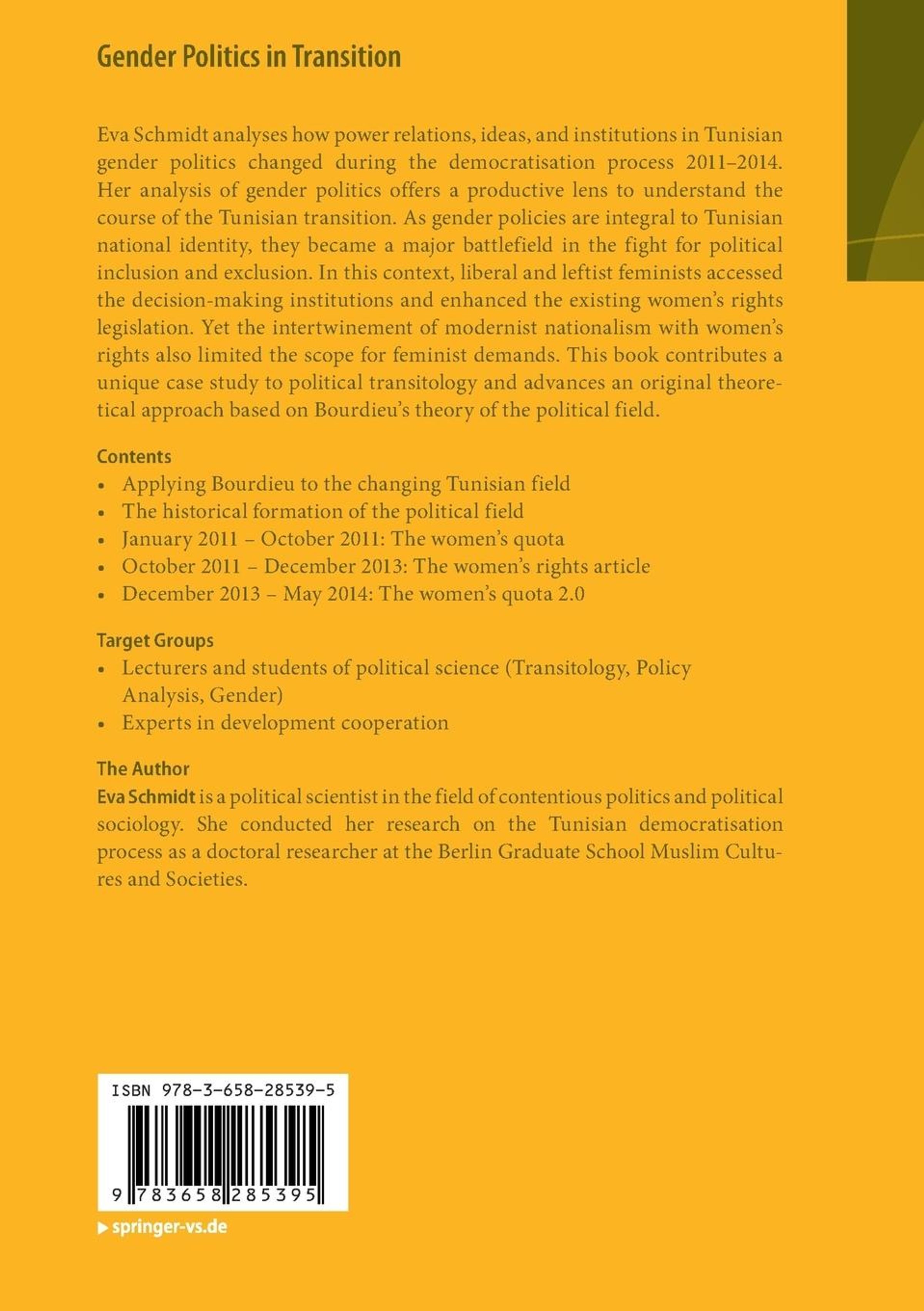 Eva Schmidt analyses how power relations, ideas, and institutions in Tunisian gender politics changed during the democratisation process 2011-2014. Her analysis of gender politics offers a productive lens to understand the course of the Tunisian transition. As gender policies are integral to Tunisian national identity, they became a major battlefield in the fight for political inclusion and exclusion. In this context, liberal and leftist feminists accessed the decision-making institutions and enhanced the existing women's rights legislation. Yet the intertwinement of modernist nationalism with women's rights also limited the scope for feminist demands. This book contributes a unique case study to political transitology and advances an original theoretical approach based on Bourdieu's theory of the political field.