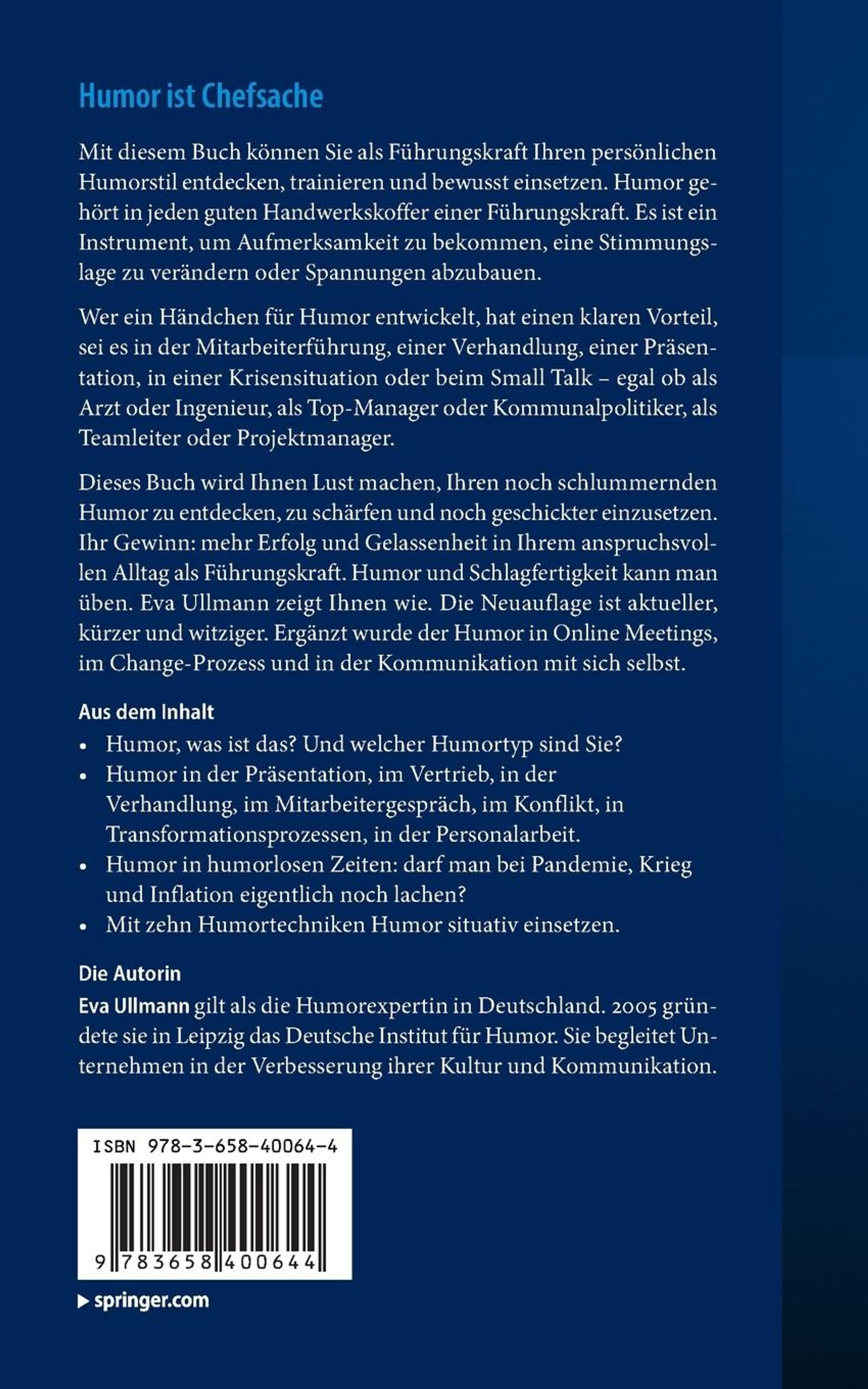Dieses Buch wird Ihnen Lust machen, Ihren noch schlummernden Humor zu entdecken, zu schärfen und noch geschickter einzusetzen. Ihr Gewinn: mehr Erfolg und Gelassenheit in Ihrem anspruchsvollen Alltag als Führungskraft. Humor und Schlagfertigkeit kann man üben. Eva Ullmann zeigt Ihnen wie. Die Neuauflage ist aktueller, kürzer und witziger. Ergänzt wurde der Humor in Online Meetings, im Change-Prozess und in der Kommunikation mit sich selbst.