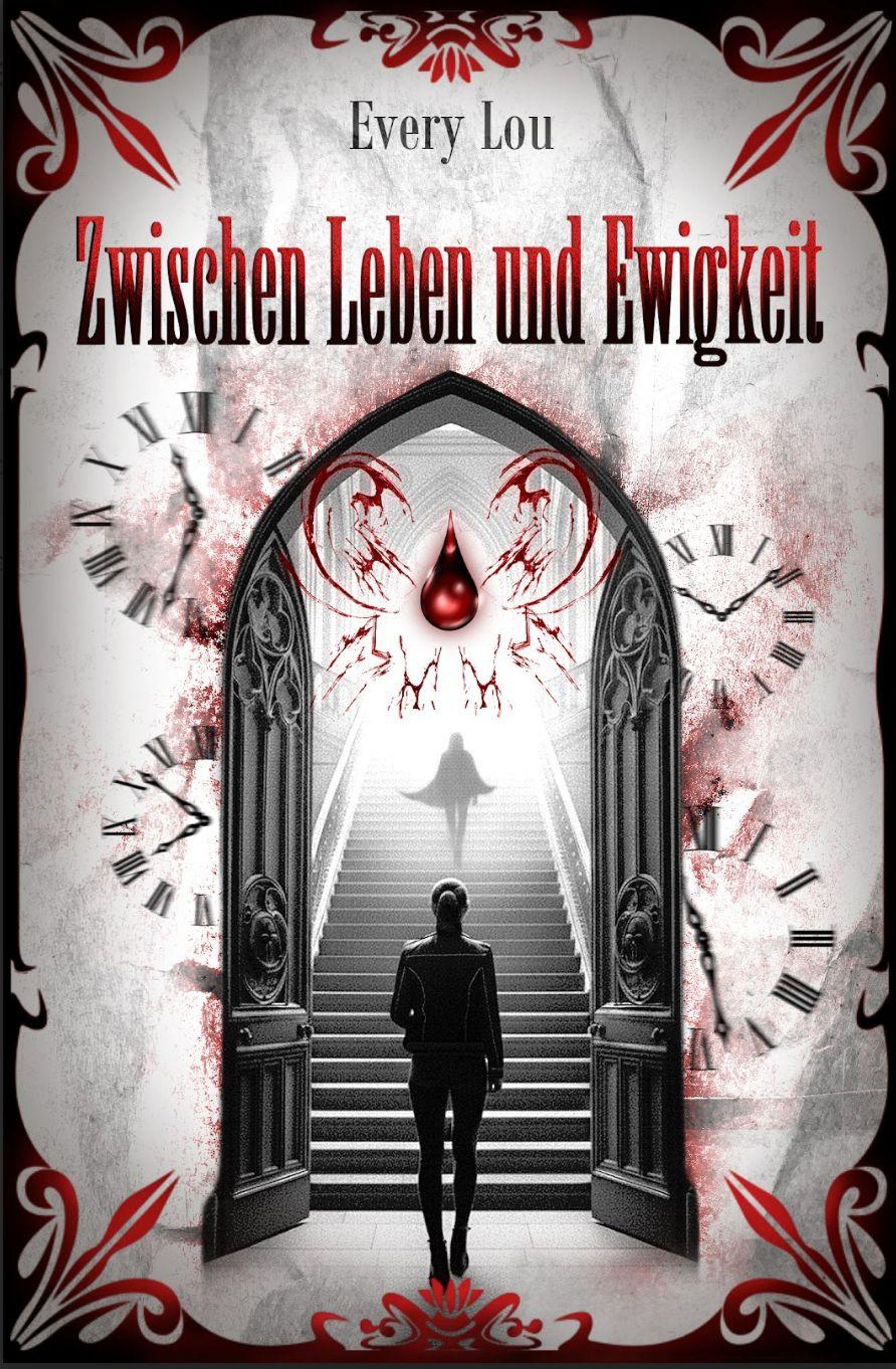 "Zwischen Leben und Ewigkeit" von Every Lou. Rotes Tropfen-Motiv, eine Person steigt dunkle Treppe hinauf, Uhren im Hintergrund., Buch