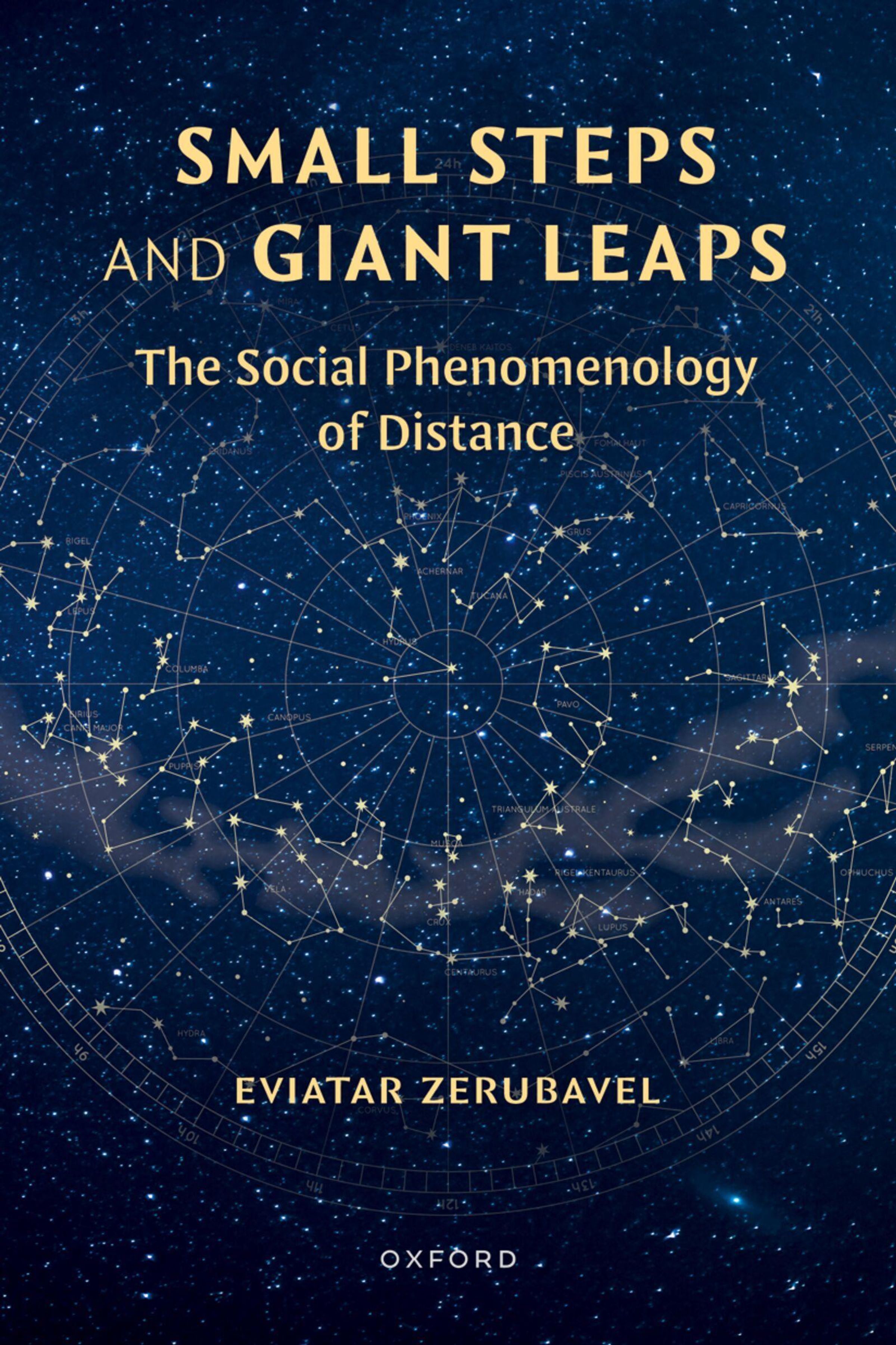 Text: "Small Steps and Giant Leaps: The Social Phenomenology of Distance, Eviatar Zerubavel, Oxford." Hintergrund: Sternenhimmel., Buch
