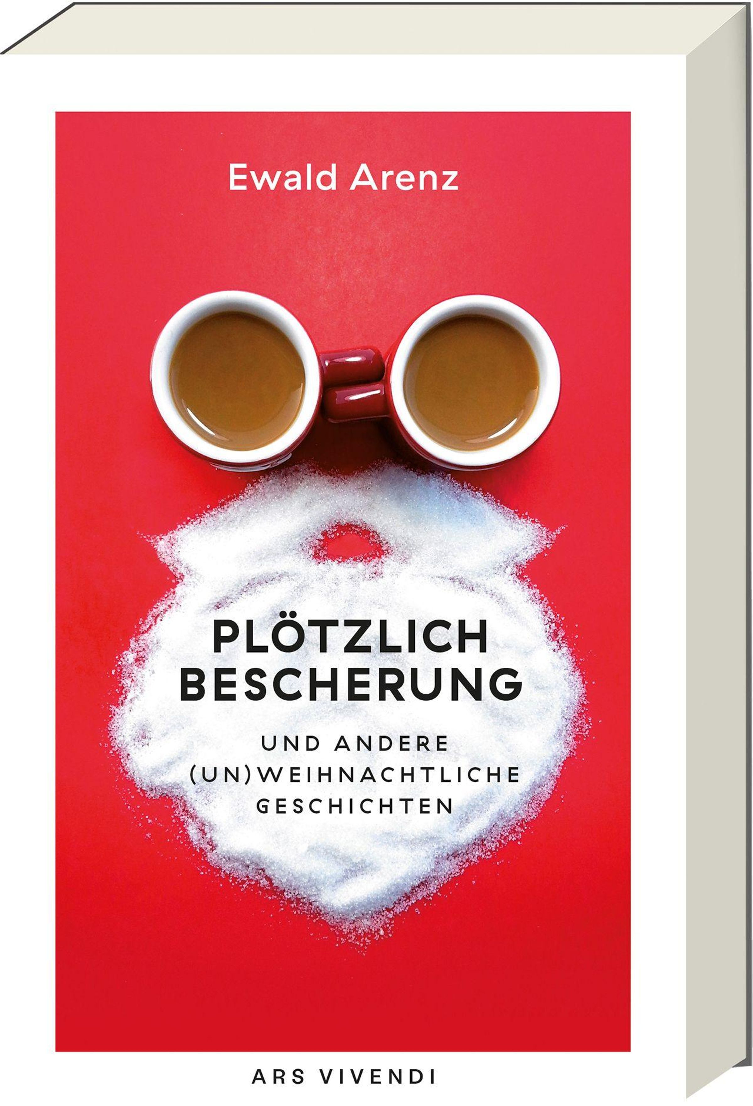 Auf rotem Hintergrund: "Ewald Arenz - Plötzlich Bescherung und andere (un)weihnachtliche Geschichten". Unten: "ARS VIVENDI". Zwei Kaffeetassen und Zucker formen ein Gesicht., Buch