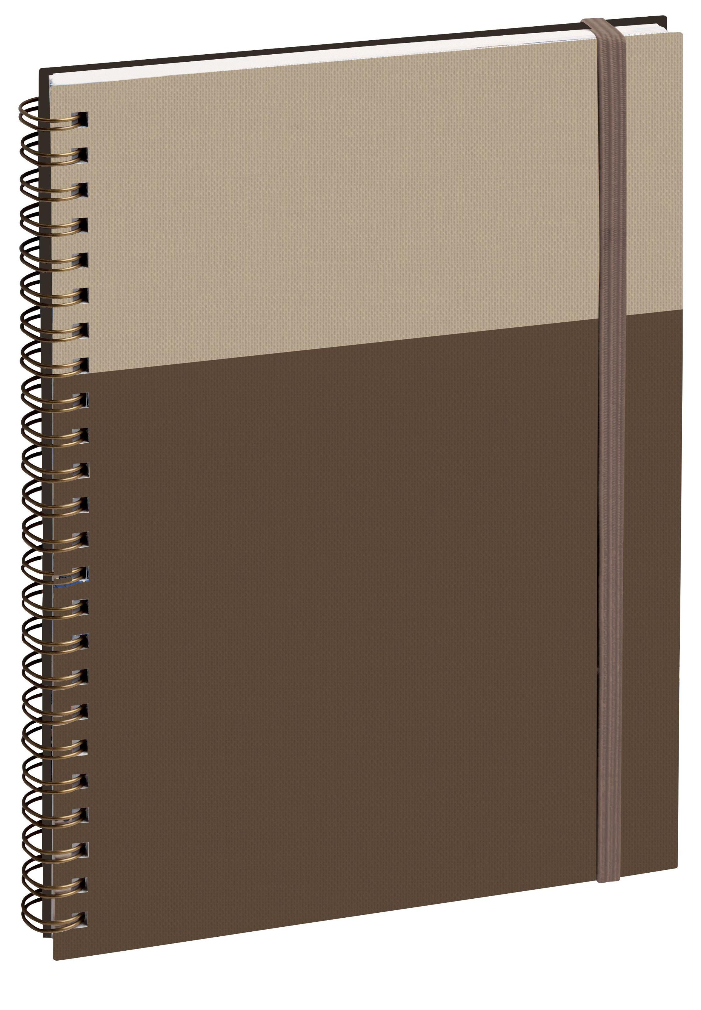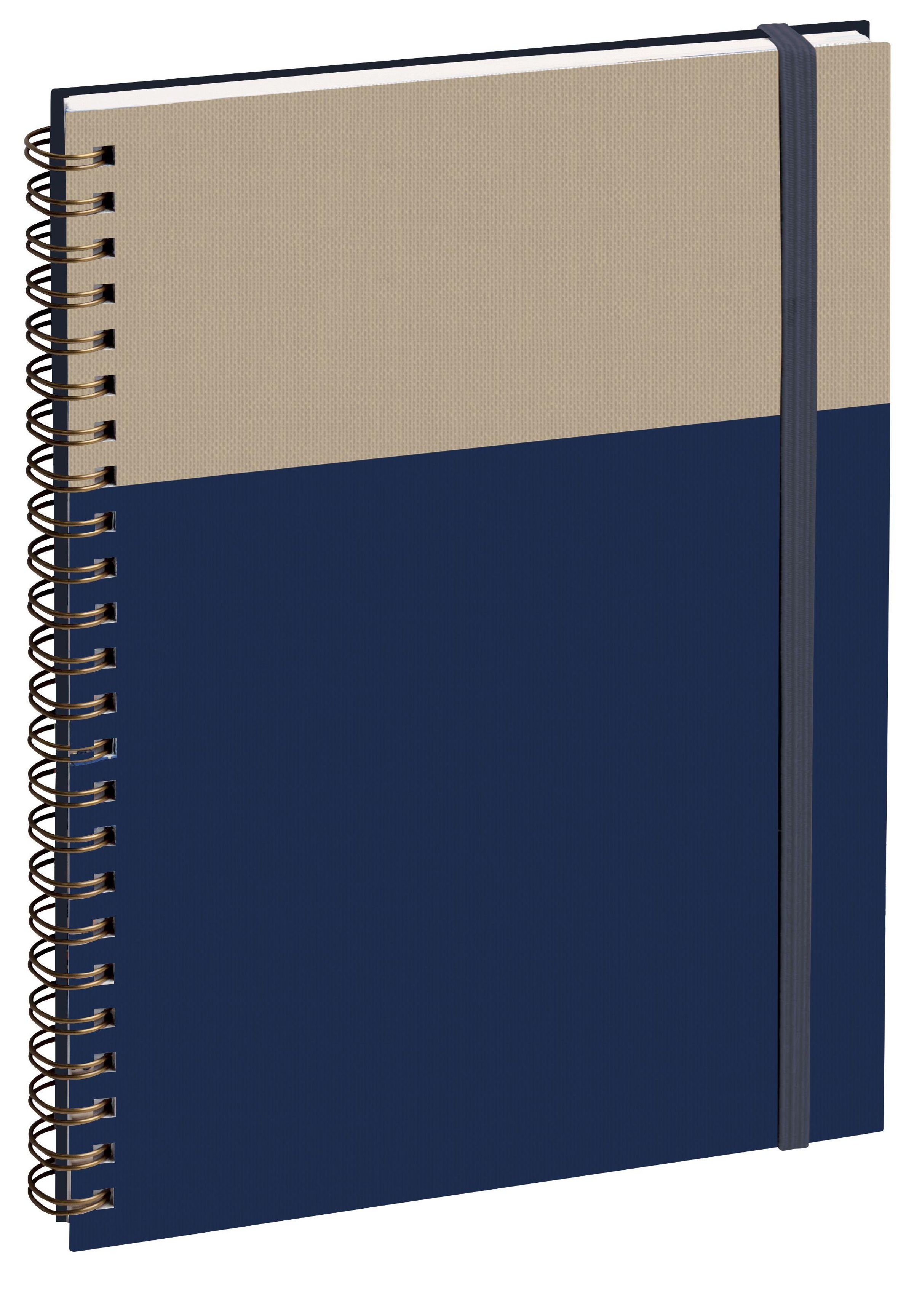 Ein Notizbuch mit Spiralbindung, oben in Beige und unten in Dunkelblau, mit einem schwarzen elastischen Band., Buch