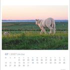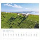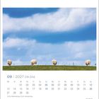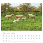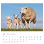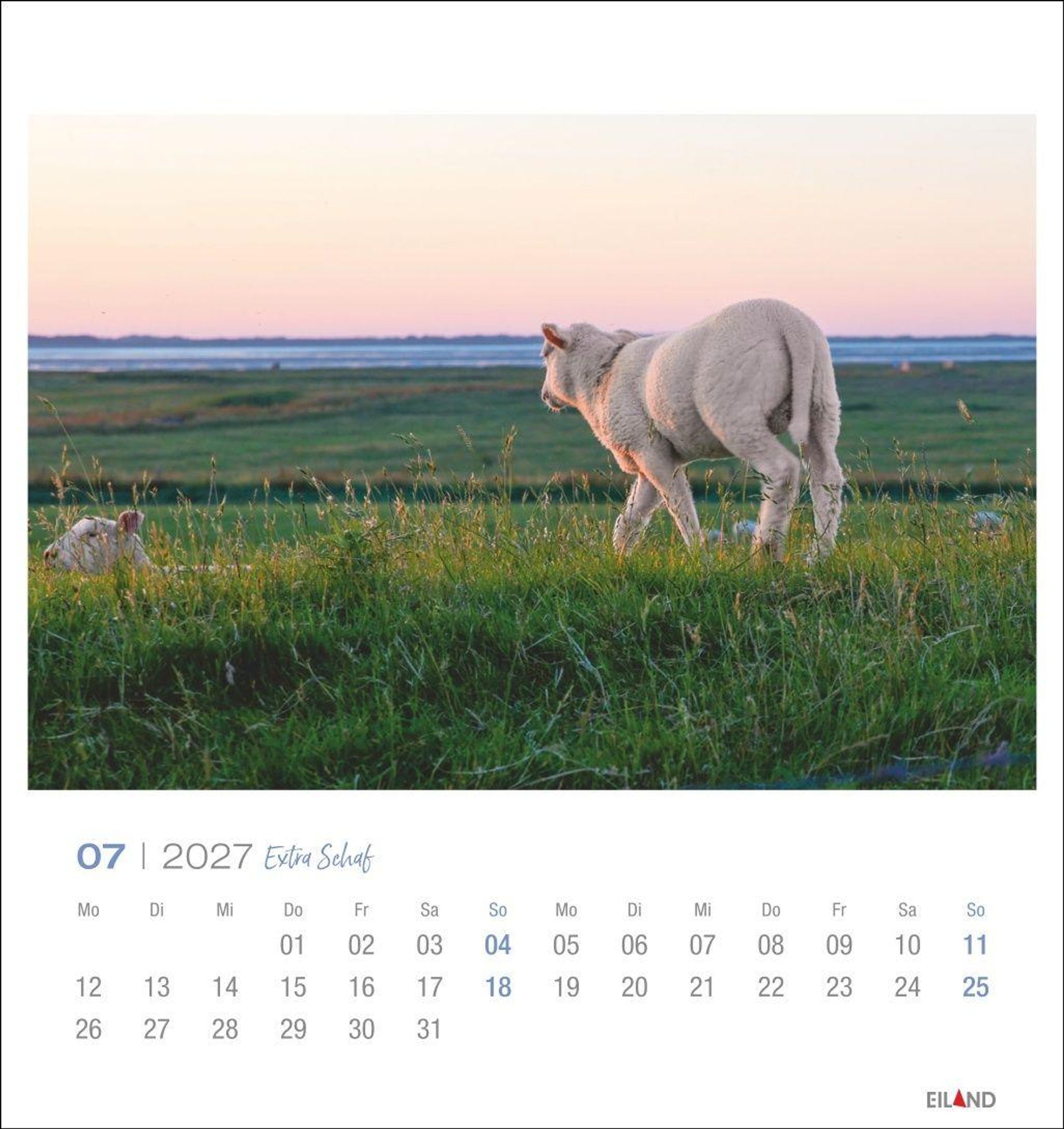„Extra Schaf 2027“. Ein Schaf und zwei Lämmer stehen auf einer Wiese unter blauem Himmel. "EILAND Kalender"., Kalender