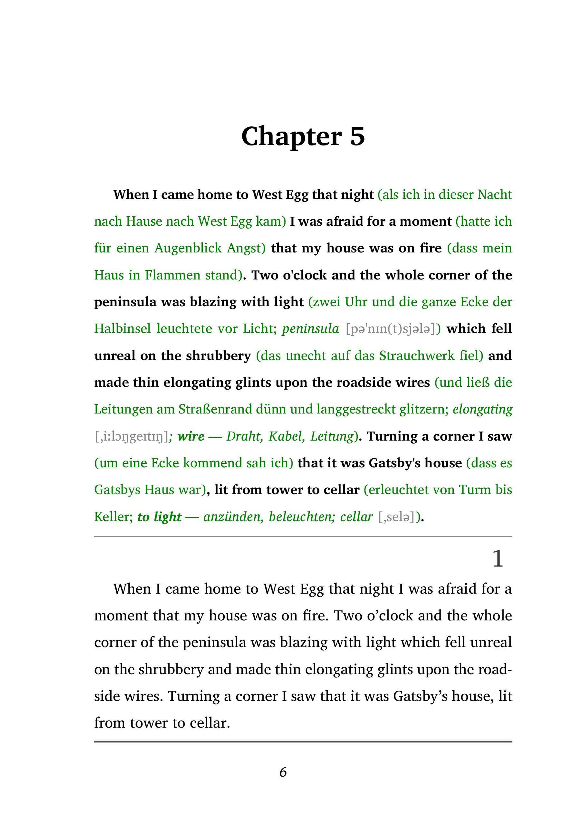Erleben Sie die Goldenen Zwanziger mit all ihrem Glanz, ihrer Sehnsucht - und ihrer Leere. The Great Gatsby von F. Scott Fitzgerald gilt als einer der bedeutendsten Romane der amerikanischen Literatur. Diese Ausgabe enthält den vollständigen Originaltext - authentisch und ungekürzt, aber durch die Frank-Lesemethode auch für fortgeschrittene Englischlernende verständlich gemacht.