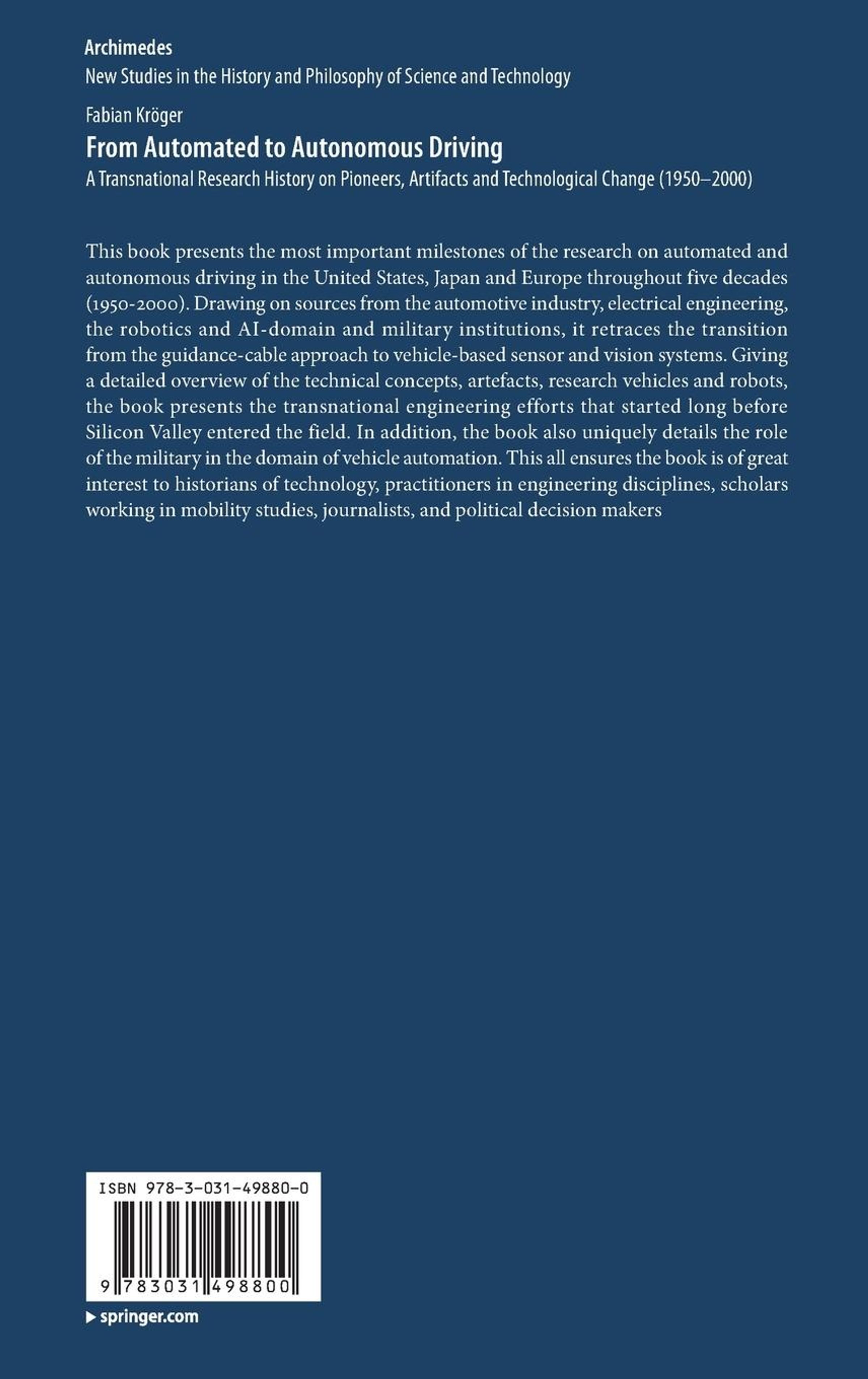 This book presents the most important milestones of the research on automated and autonomous driving in the United States, Japan and Europe throughout five decades (1950-2000). Drawing on sources from the automotive industry, electrical engineering, the robotics and AI-domain and military institutions, it retraces the transition from the guidance-cable approach to vehicle-based sensor and vision systems. Giving a detailed overview of the technical concepts, artefacts, research vehicles and robots, the book presents the transnational engineering efforts that started long before Silicon Valley entered the field. In addition, the book also uniquely details the role of the military in the domain of vehicle automation. This all ensures the book is of great interest to historians of technology, practitioners in engineering disciplines, scholars working in mobility studies, journalists, and political decision makers.