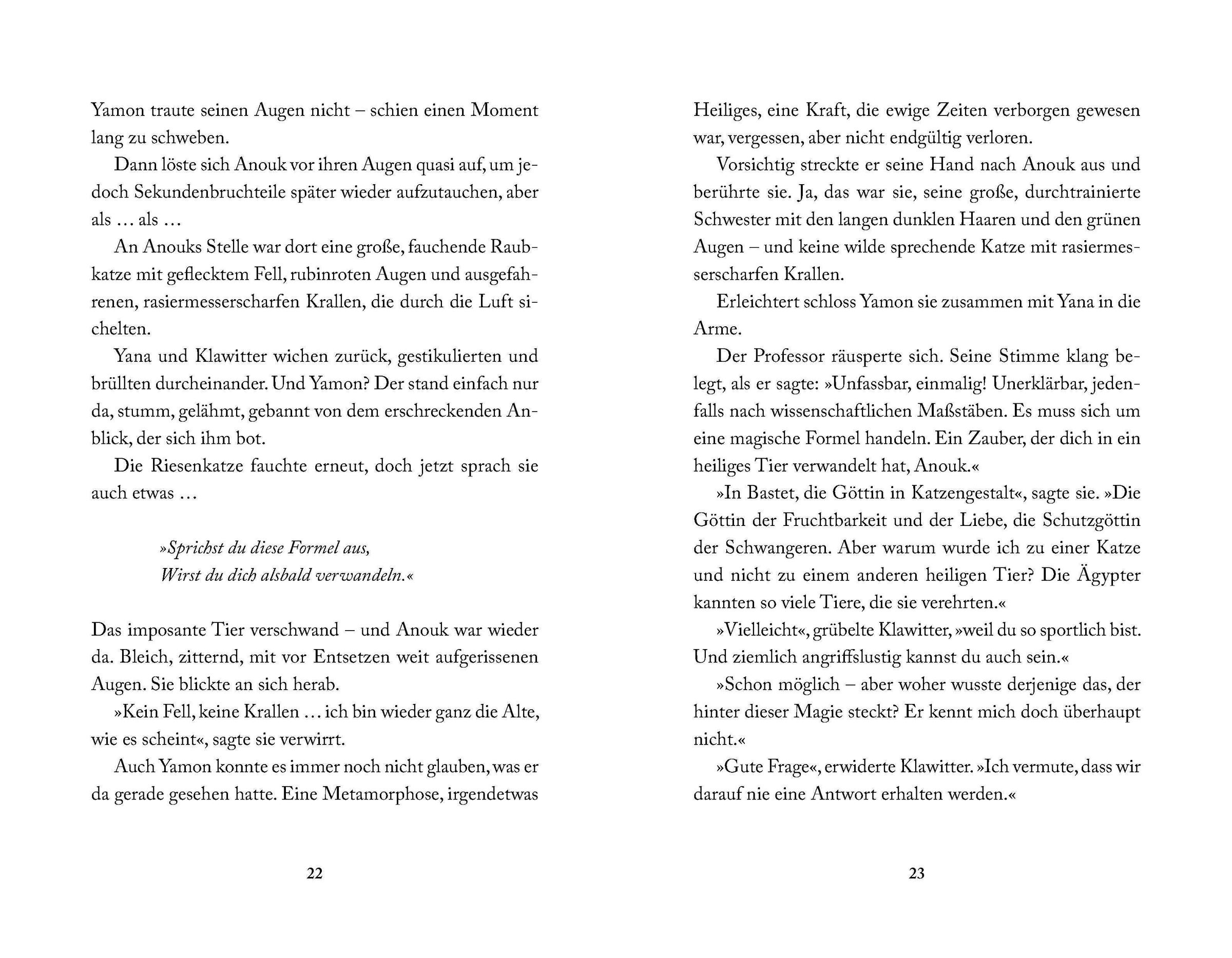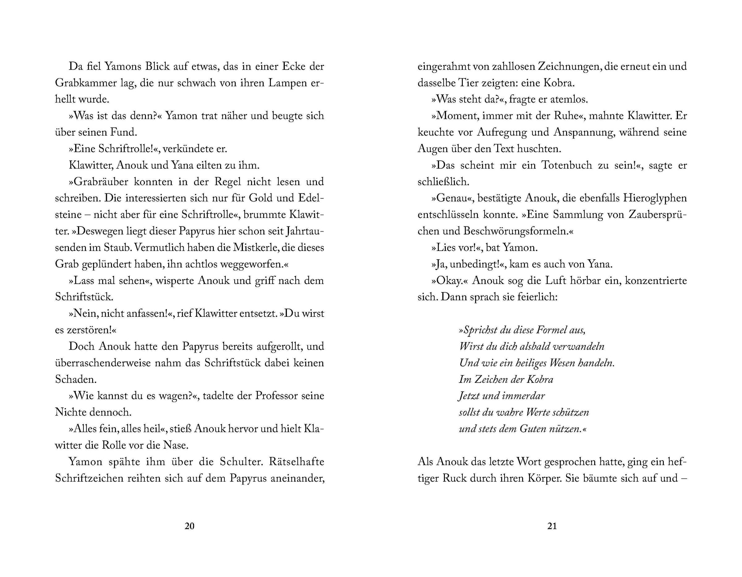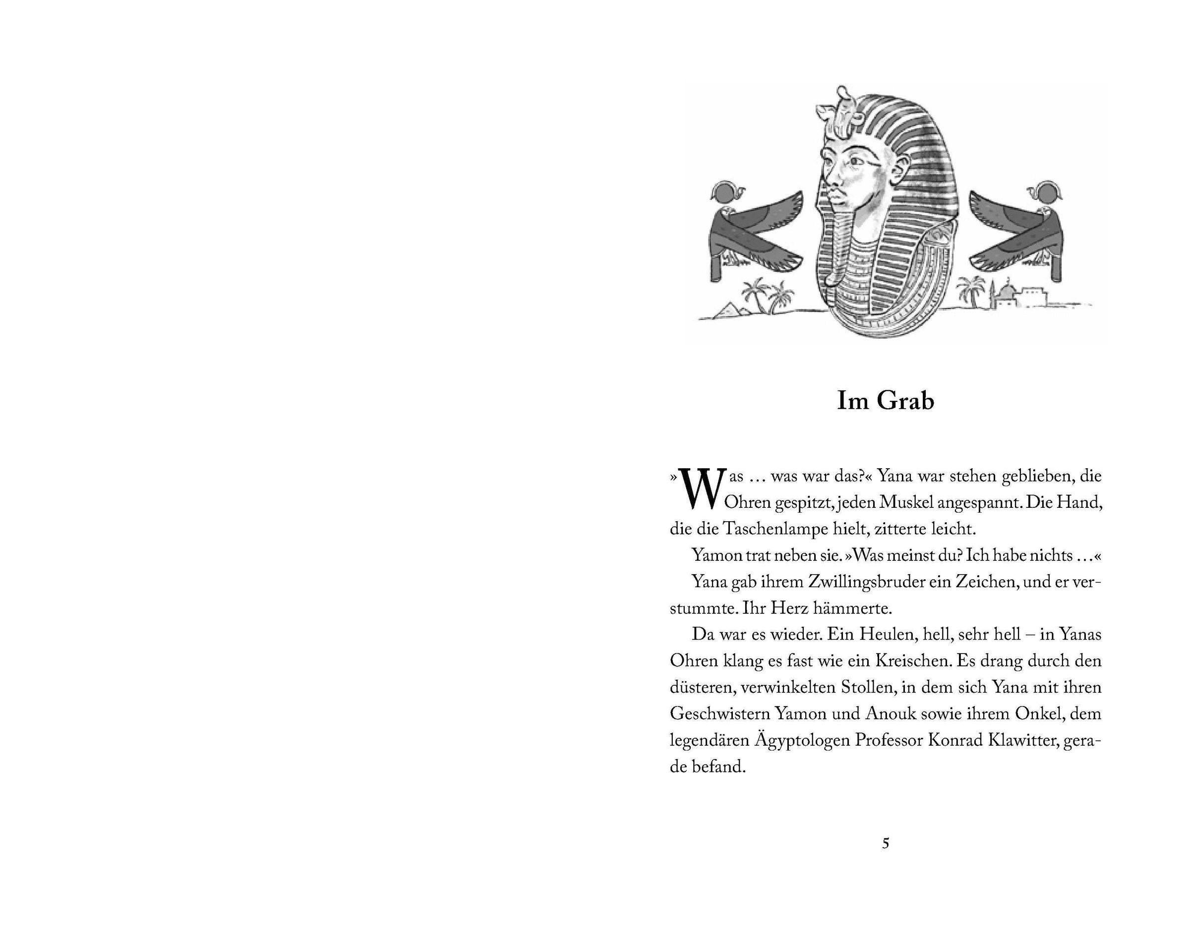 Ein spannender Sommer in Ägypten: Die Zwillinge Yana und Yamon (12) reisen mit ihrer Schwester Anouk, einer schlagfertigen Archäologiestudentin, und ihrem Onkel Professor Klawitter ins Tal der Könige. Dort entdecken sie eine neue Grabkammer - und darin eine magische Formel, mit der sie sich in heilige Tiere verwandeln: Bastet die Katze, Horus den Falken und Anubis den Hund. Als sie beim Besuch im Ägyptischen Museum Zeugen eines Raubüberfalls werden, bei dem unter anderem Tutanchamuns Maske und eine Mumie entwendet werden, kommt es zu einer halsbrecherischen Verfolgungsjagd. Und der Drahtzieher kennt das Geheimnis der magischen Formel! Wird es den drei Geschwistern gelingen, die historischen Schätze zurückzuholen?