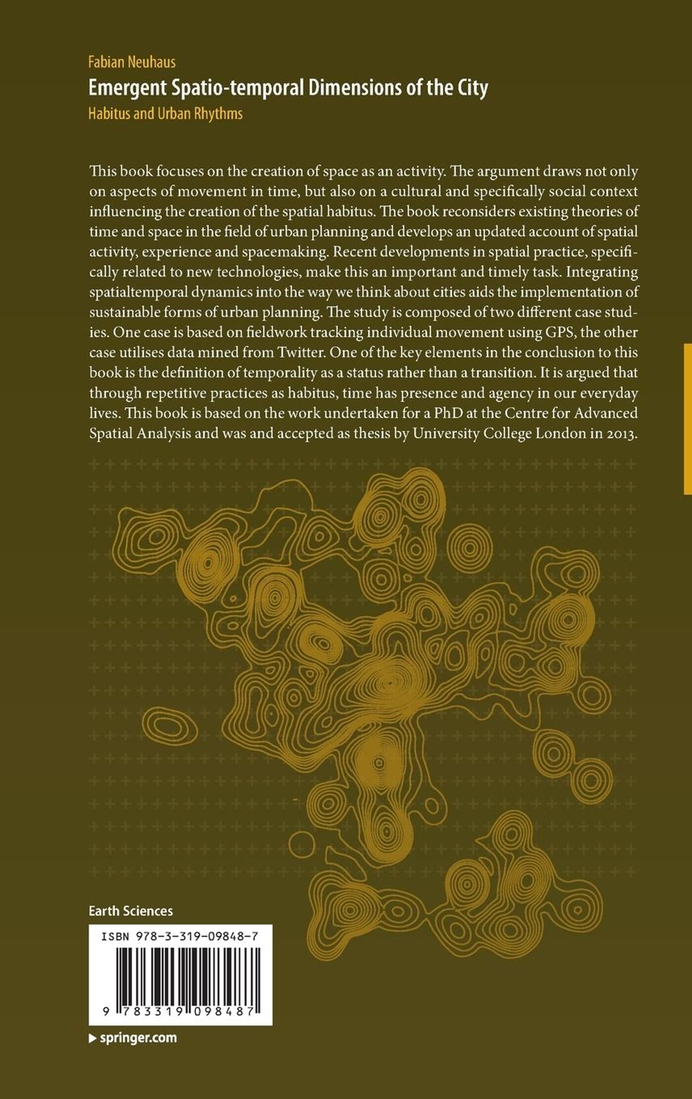 This book focuses on the creation of space as an activity. The argument draws not only on aspects of movement in time, but also on a cultural and specifically social context influencing the creation of the spatial habitus. The book reconsiders existing theories of time and space in the field of urban planning and develops an updated account of spatial activity, experience and space-making. Recent developments in spatial practice, specifically related to new technologies, make this an important and timely task. Integrating spatial-temporal dynamics into the way we think about cities aids the implementation of sustainable forms of urban planning. The study is composed of two different case studies. One case is based on fieldwork tracking individual movement using GPS, the other case utilises data mined from Twitter. One of the key elements in the conclusion to this book is the definition of temporality as a status rather than a transition. It is argued that through repetitive practices as habitus, time has presence and agency in our everyday lives. This book is based on the work undertaken for a PhD at the Centre for Advanced Spatial Analysis and was and accepted as thesis by University College London in 2013.