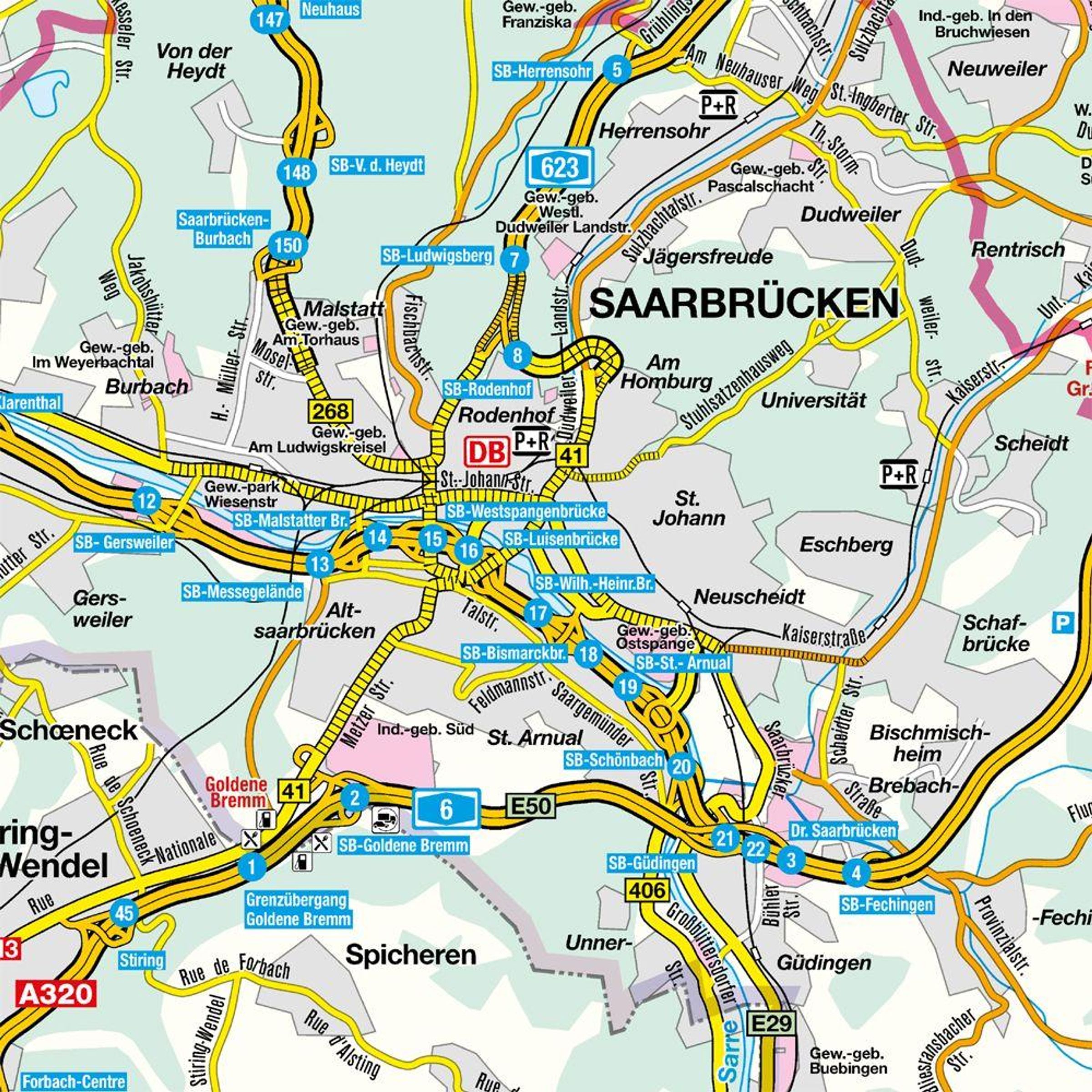Der Falk Cityplan Saarbrücken im Maßstab 1: 20.000 ist für Ihre nächste Stadterkundung ein absoluter Gewinn. Entspannt in der Stadt ankommen? Und das sogar mit dem Auto? Dank des Falk Cityplans kein Problem. Ob mit dem Auto, ÖPNV oder zu Fuß: Der kleine kompakte Plan bietetet Ihnen eine zuverlässige Orientierung und leitet Sie schnell und unkompliziert zu Ihrem nächsten Ziel. Mit Hilfe des blauen und grauen Suchgitters wird die Orientierung innerhalb der Stadt zum Kinderspiel. Auf der Rückseite finden Sie nicht nur Wissenswertes über Saarbrücken, sondern auch ein Straßenverzeichnis mit Postleitzahlen und Suchfeldangaben, einen Innenstadtplan sowie eine praktische Durchfahrtskarte. Der Liniennetzplan hilft Ihnen darüber hinaus bei der Planung Ihrer Fahrten mit Bus und Bahn - für eine rundum gelungene Stadterkundung.