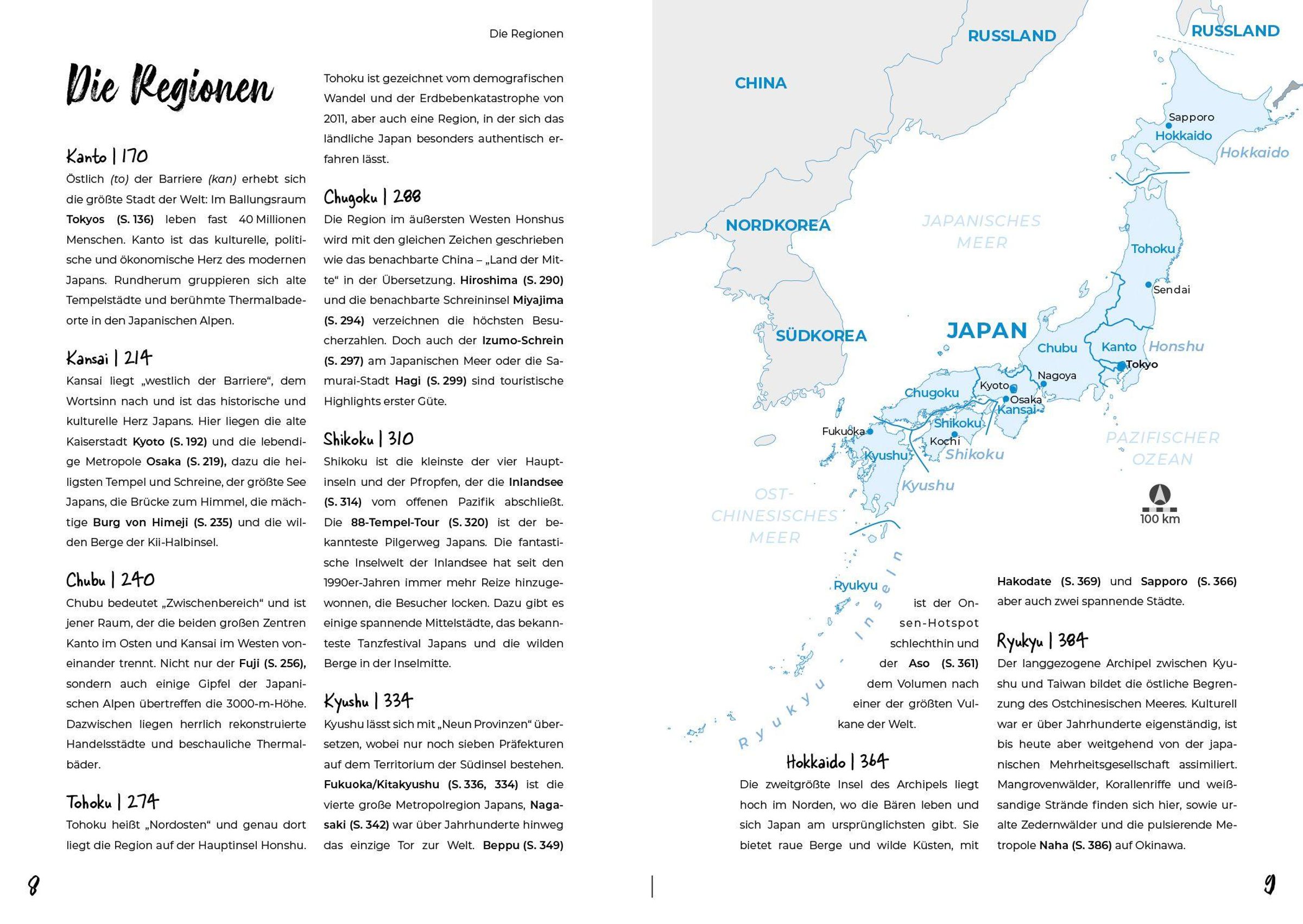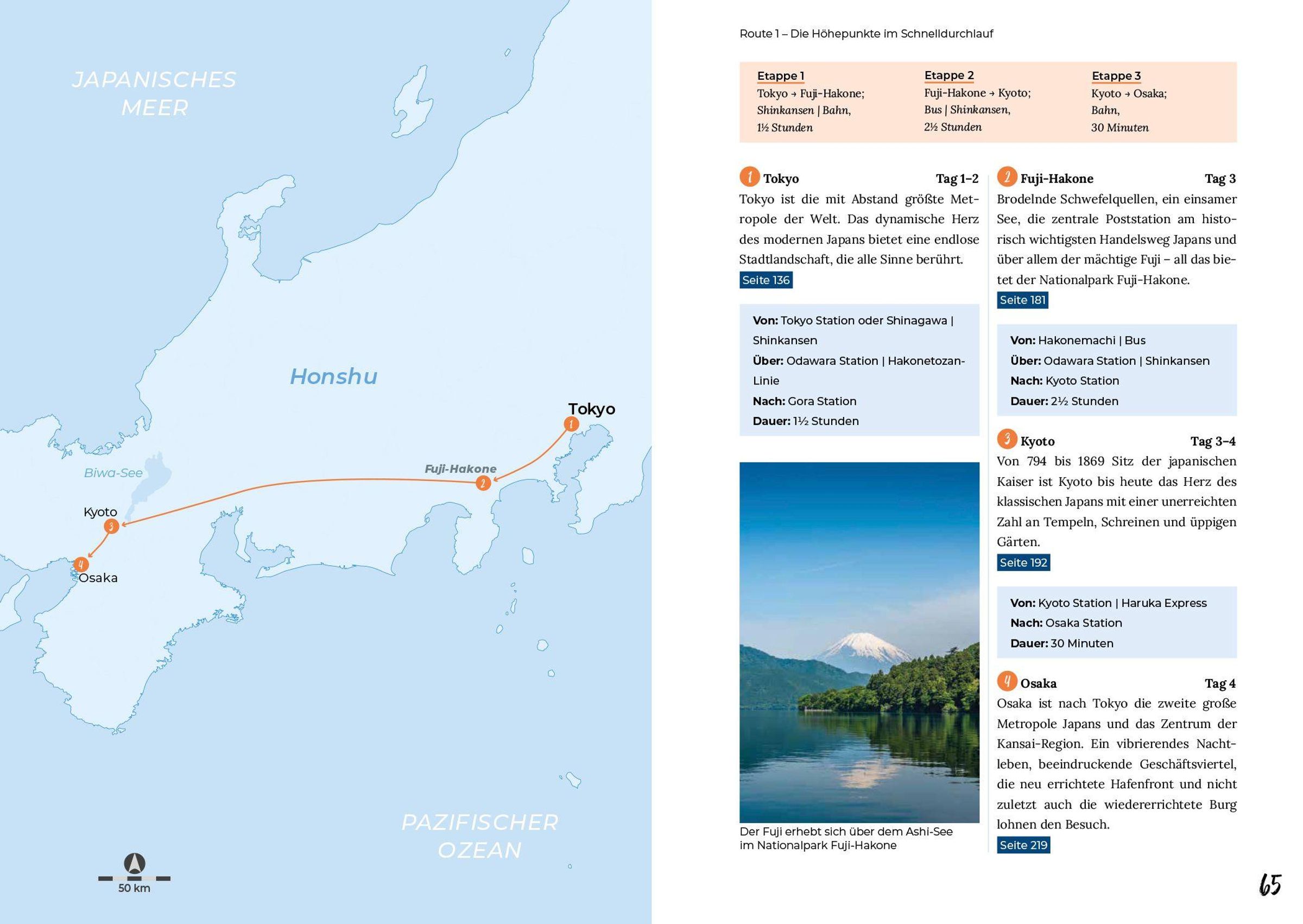 Die erprobten Reiserouten führen entlang aller Highlights und Sehenswürdigkeiten des beliebten Reiseziels: geheime Onsen - heiße Quellen - in idyllischen Landschaften oder traditionelle Gärten inmitten der Stadt, dazu weniger bekannte, aber atemberaubende Naturschönheiten wie die unberührte Küste und die dichten Wälder in den ländlicheren Regionen.