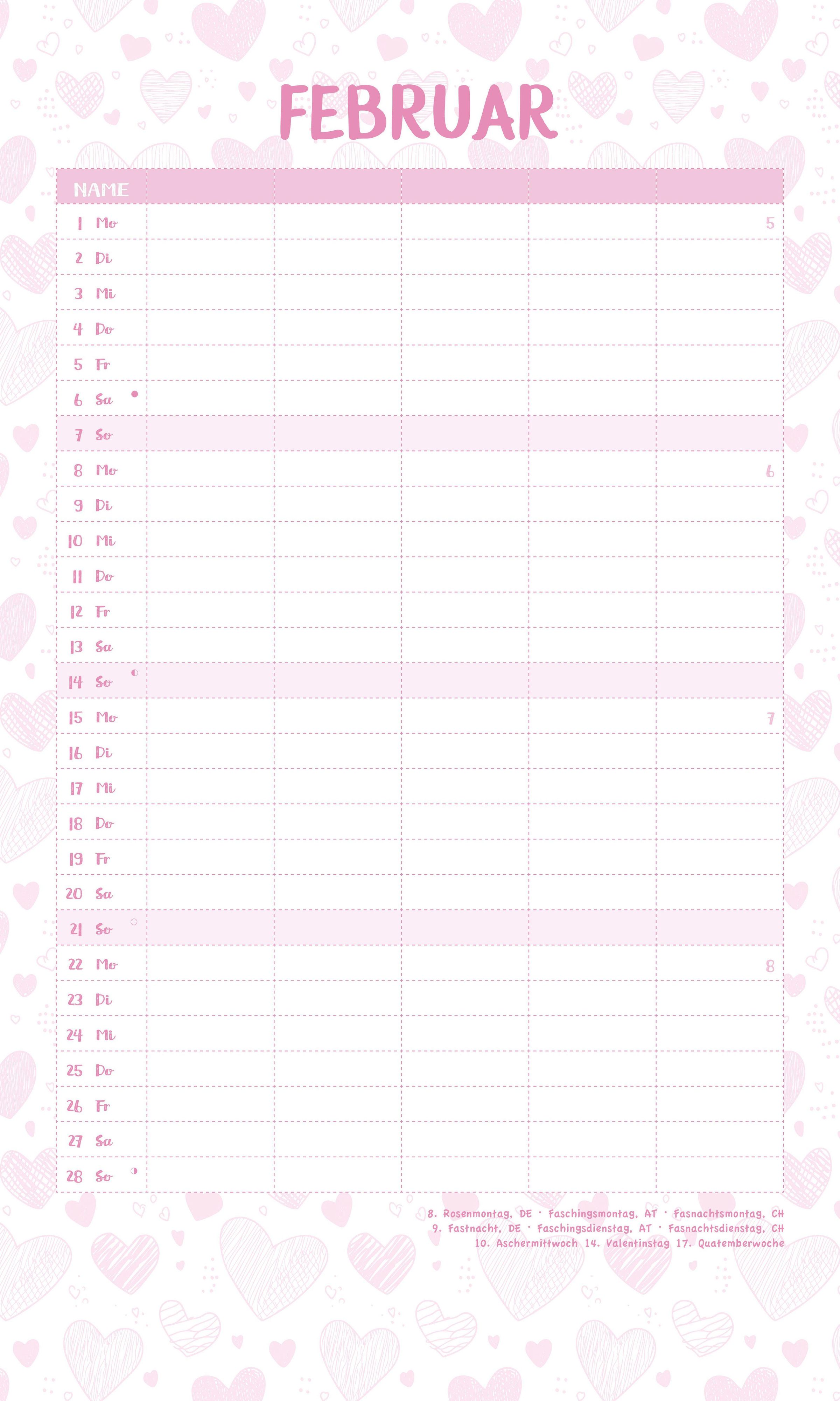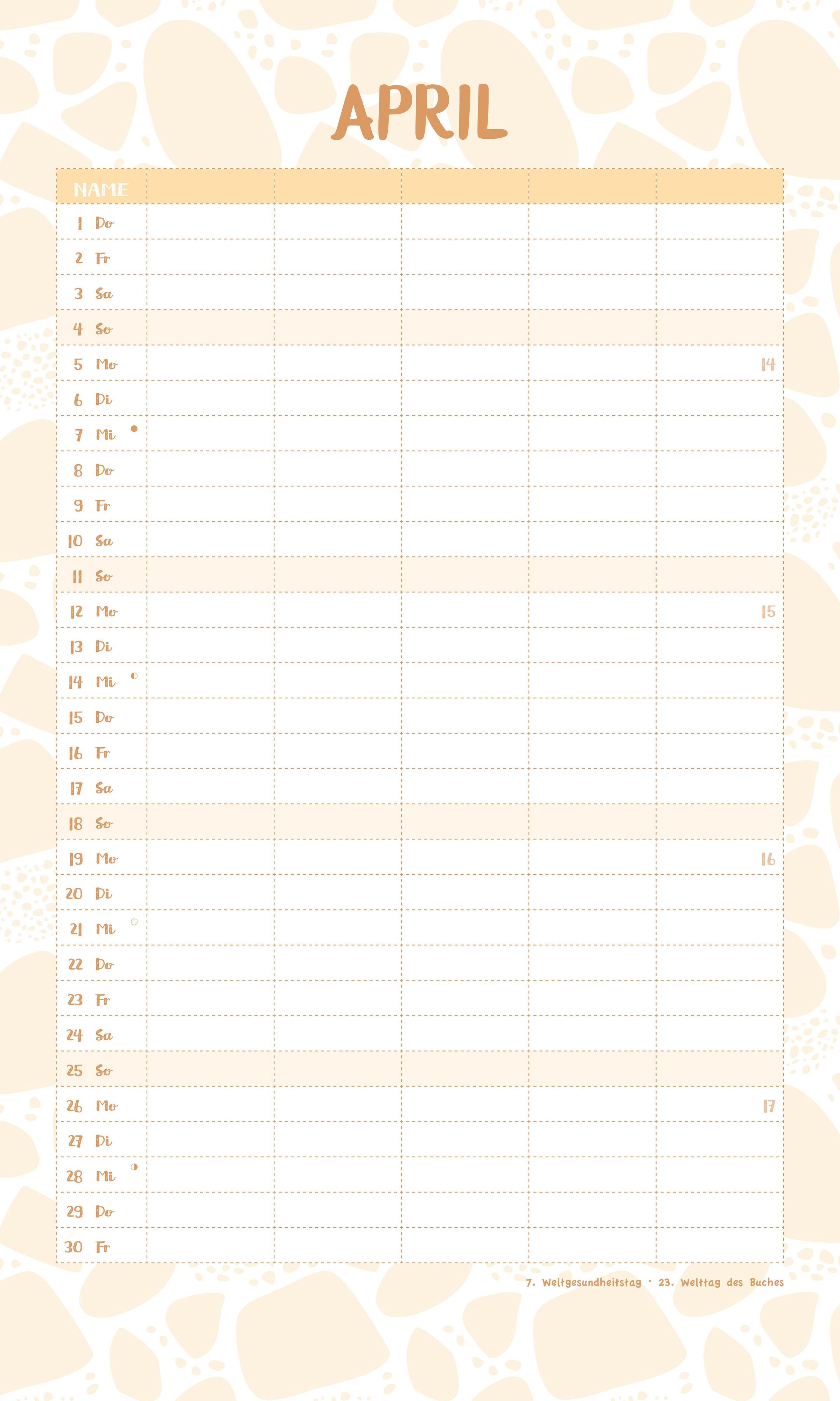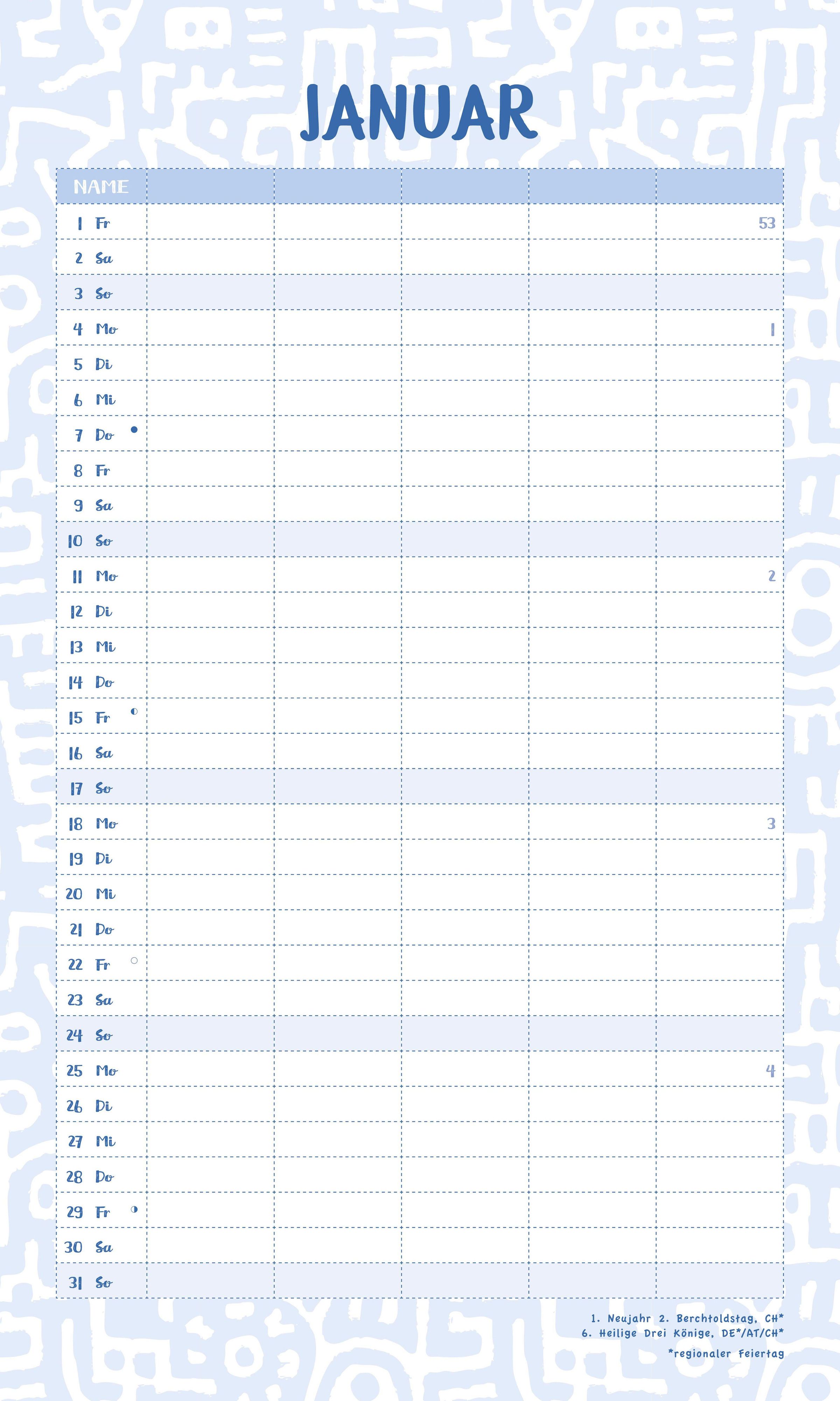 5 Spalten für volle Übersicht: Ideal für die einzelnen Familienmitglieder und ihre Themen wie Schule, Hobbys, Haushalt oder Freizeitaktivitäten.