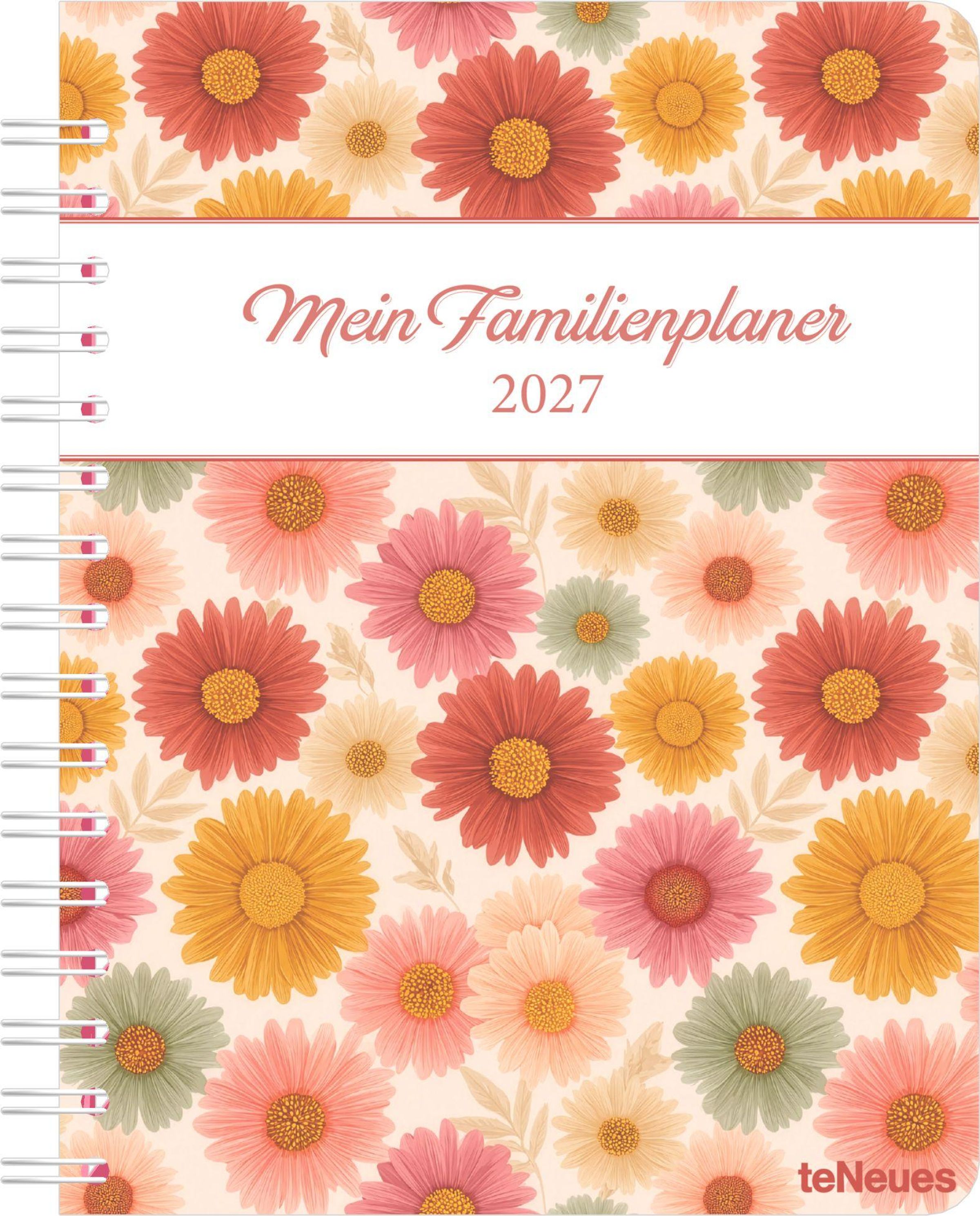 Der teNeues Familienplaner-Buch Flowers 2027 ist der ideale Kalender für alle Familien, die unterwegs und zuhause stets den Überblick behalten möchten. Mit bis zu 5 Spalten bietet er genug Platz, um die Termine einer fünfköpfigen Familie übersichtlich zu organisieren -- kompakt, praktisch und im fröhlich-floralen Design.