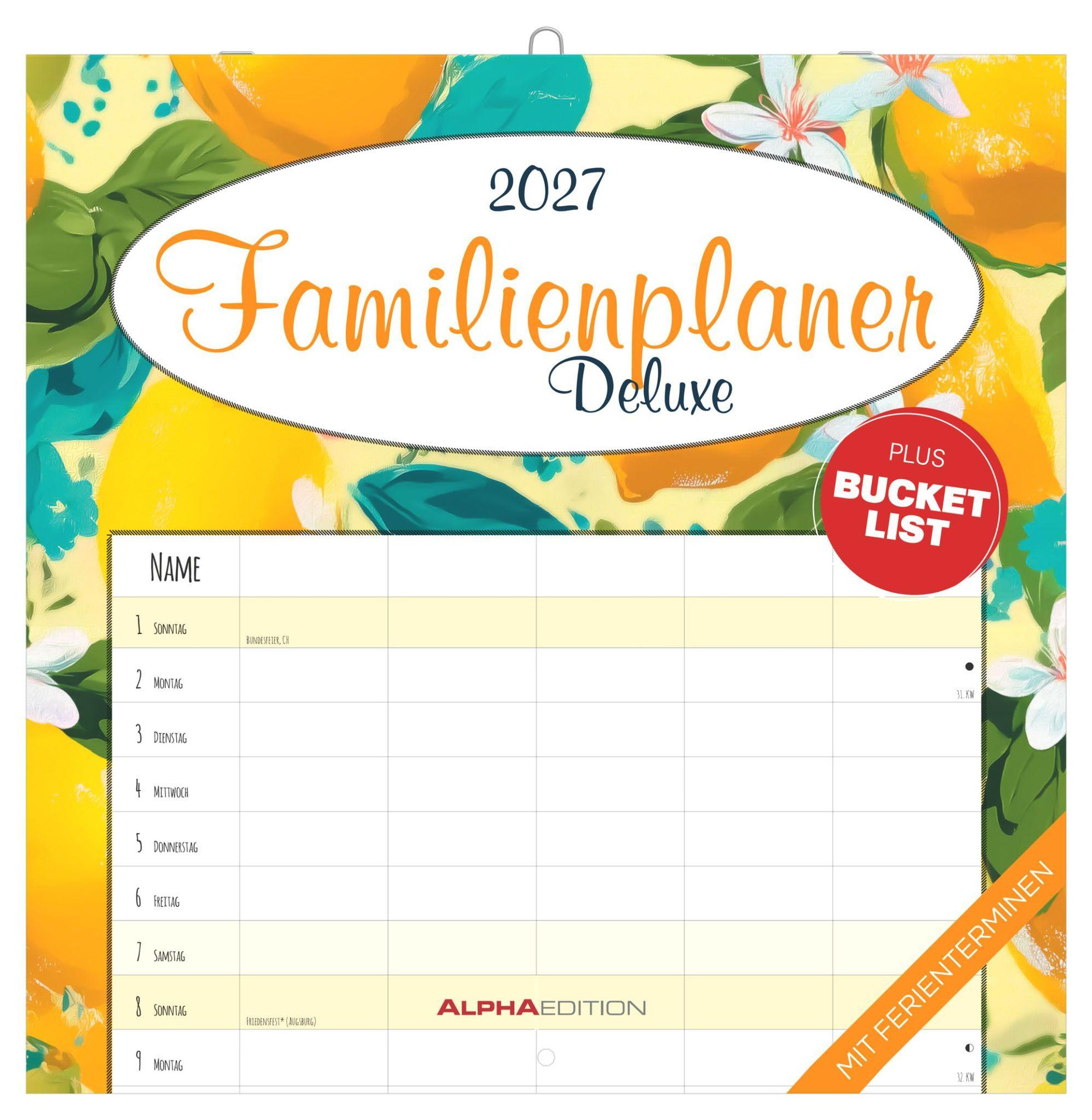"Familienplaner Deluxe 2027" mit einer roten Plakette "PLUS BUCKET LIST". Blumiges Design in gelb und grün., Kalender