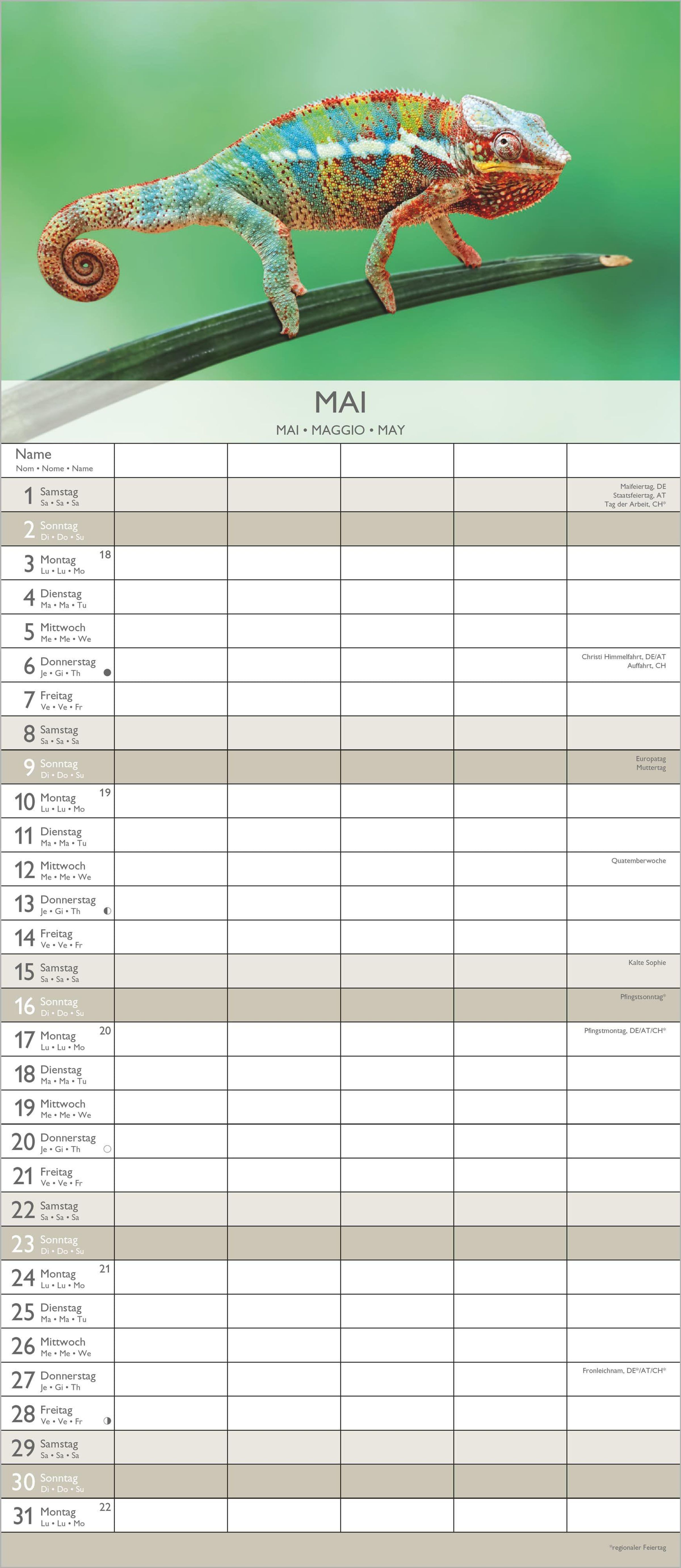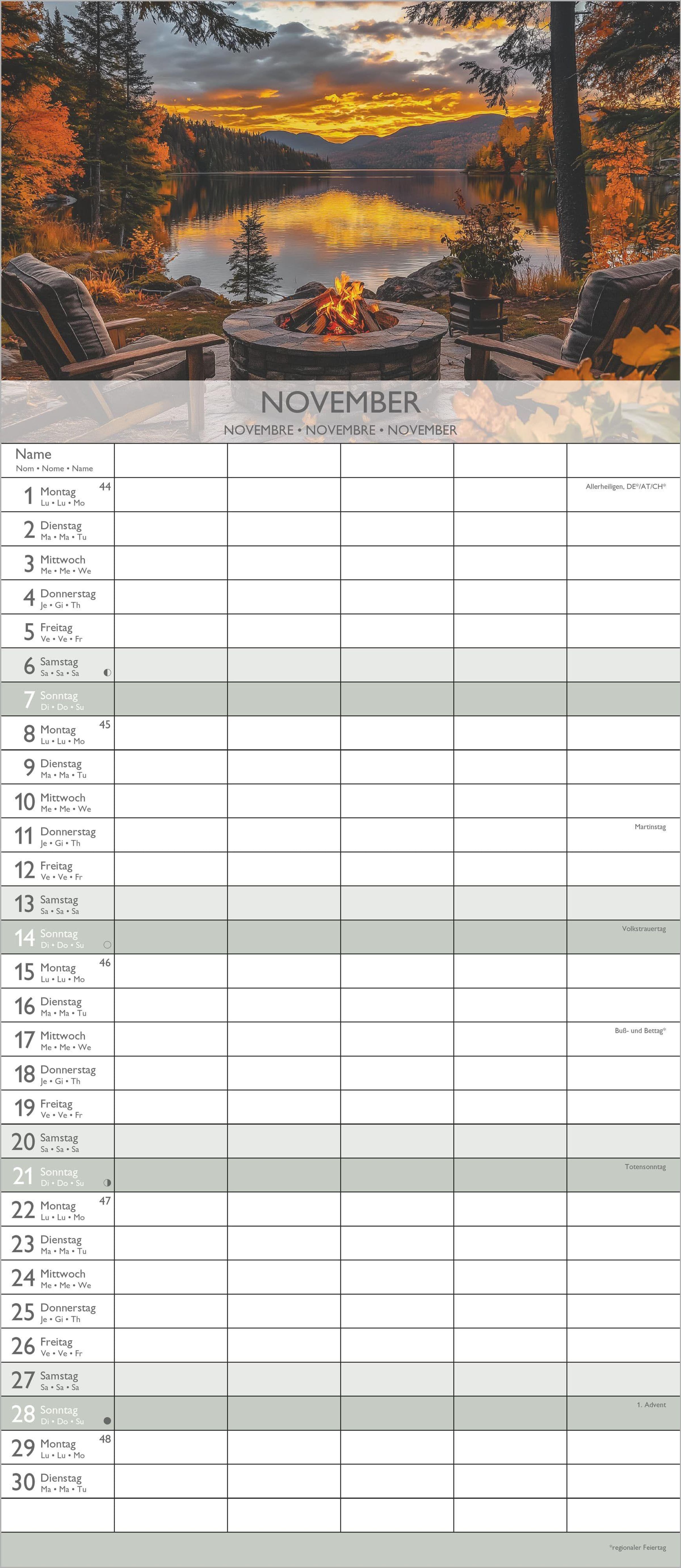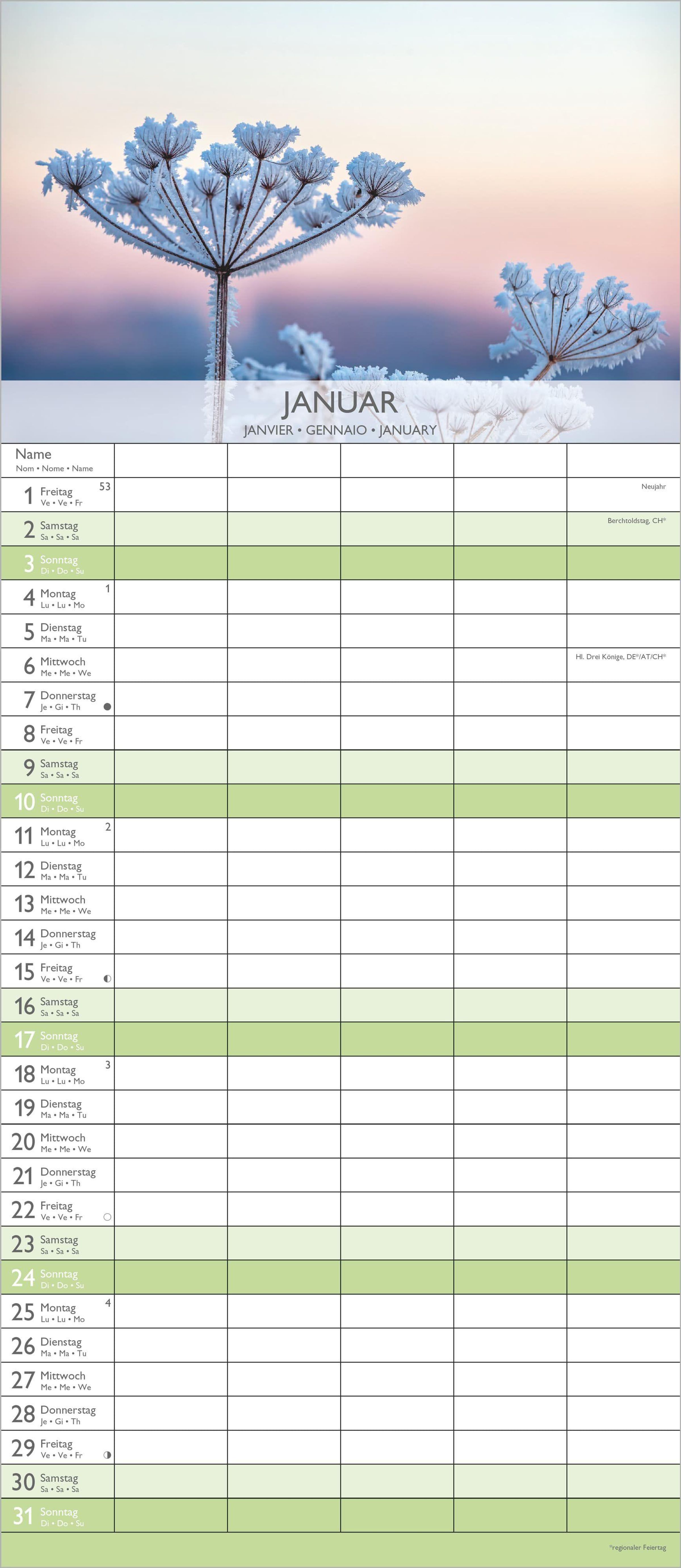 4-sprachiges Kalendarium: DE/FR/IT/GB -- ideal auch für mehrsprachige Haushalte