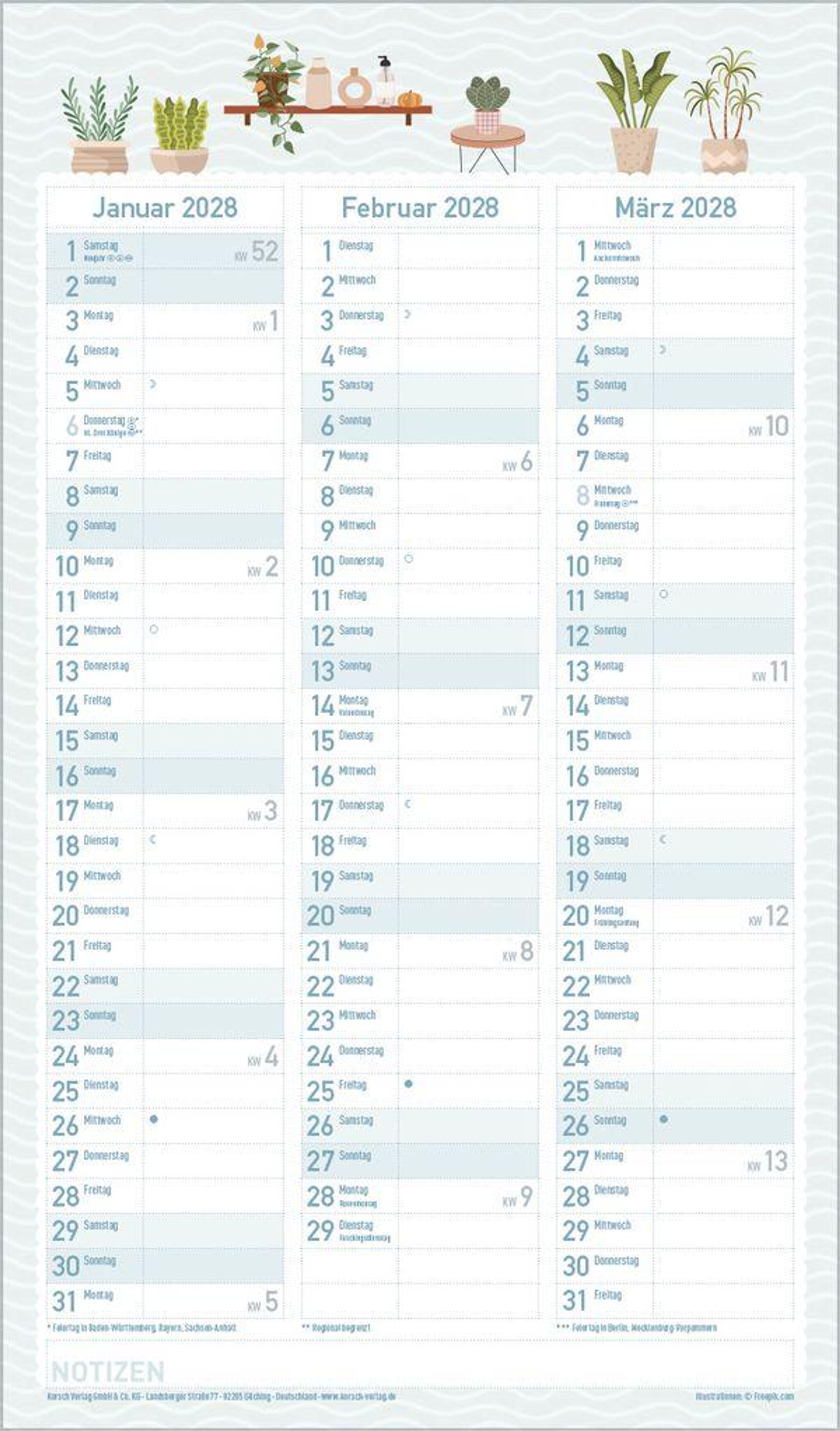 Urban Jungle und Zimmerpflanzen liegen voll im Trend. In seinen fröhlichen und pastellig-zarten Illustrationen im nach wie vor angesagten Flat Design greift dieser Familienplaner diesen Trend auf und zaubert mit seinen vielen Details eine liebevolle Wohlfühl-Atmosphäre an die Wand. Mit sechs großen Spalten sowie Ferienterminen und Vorschau fürs Folgejahr.