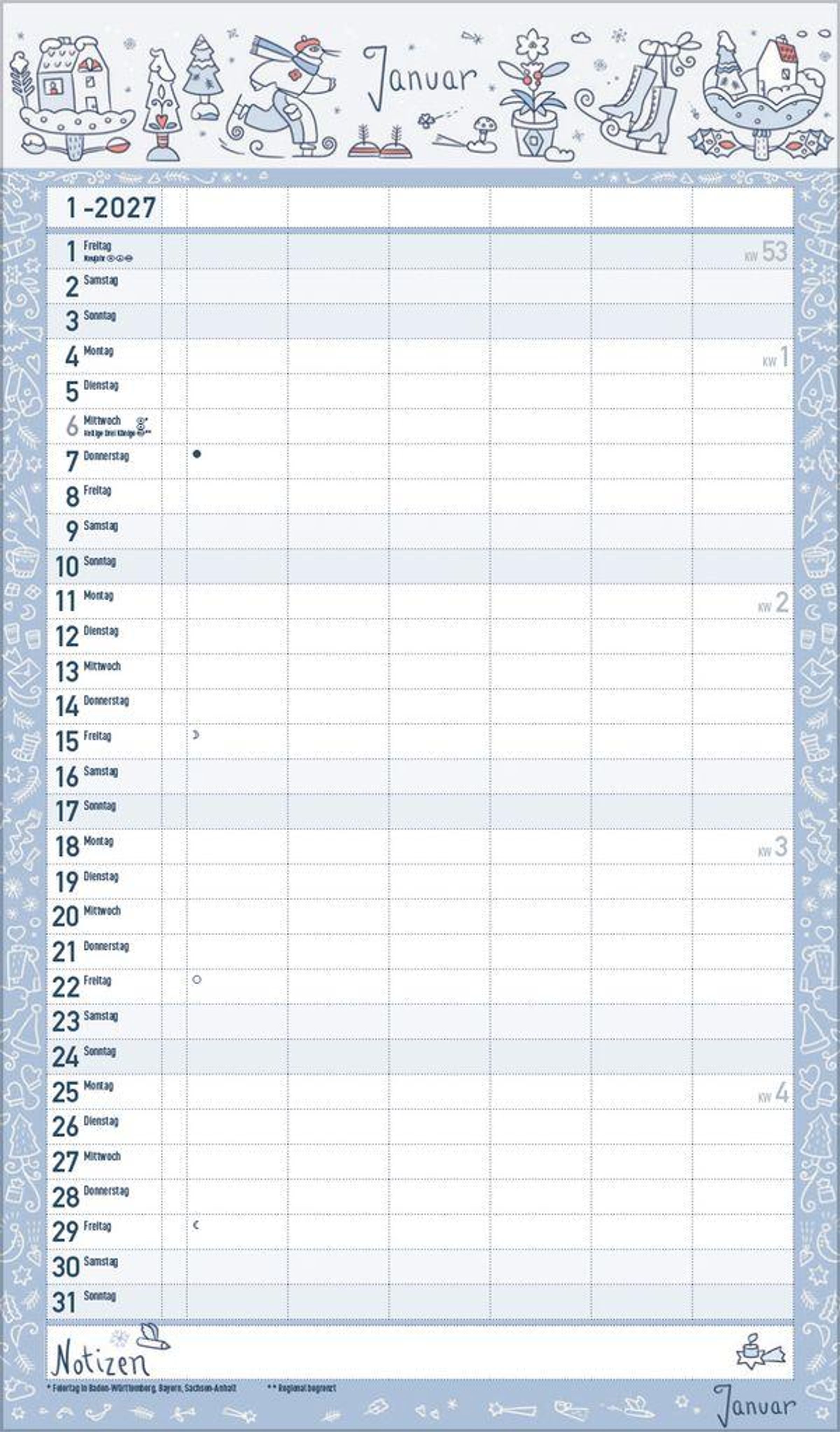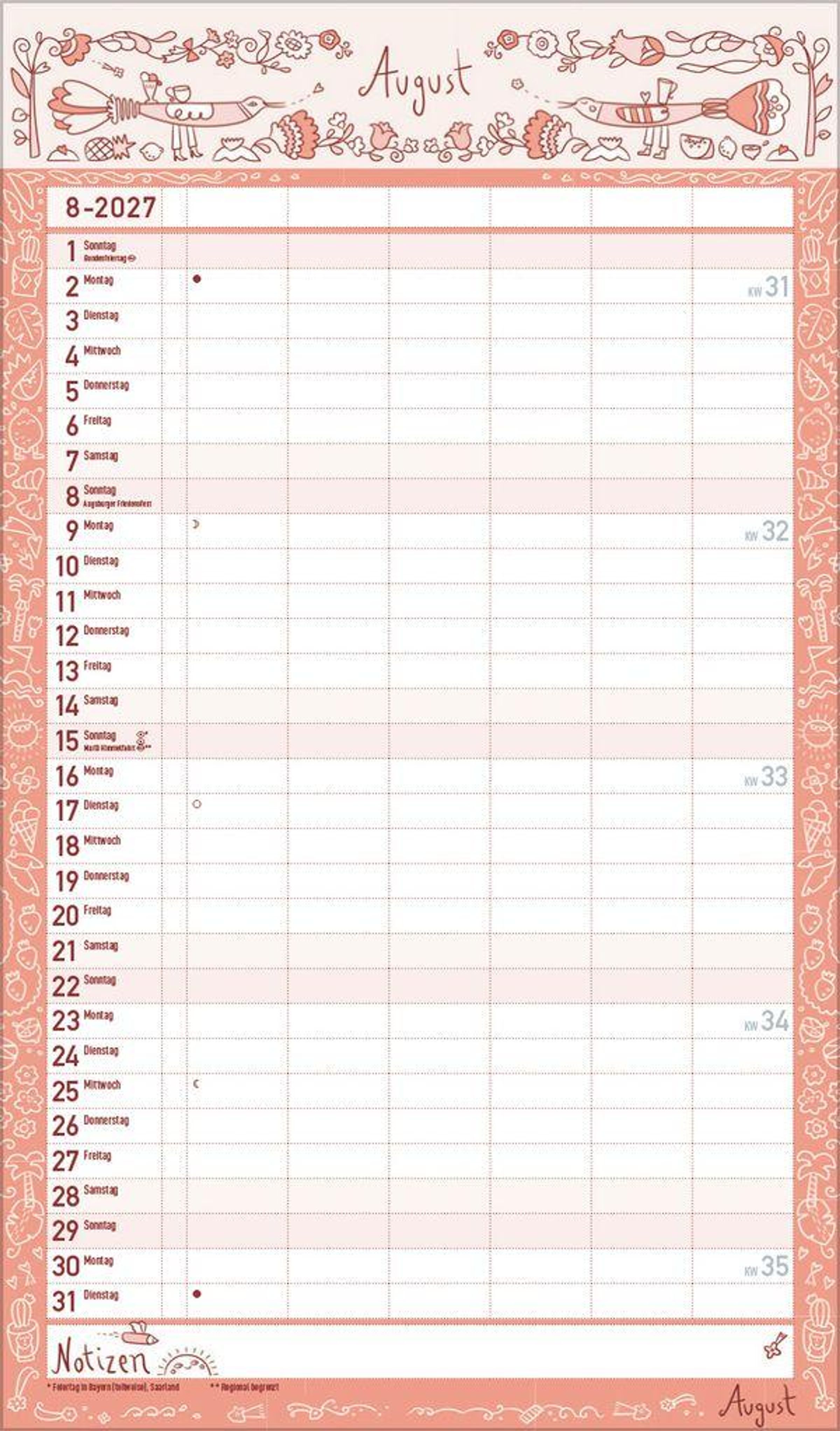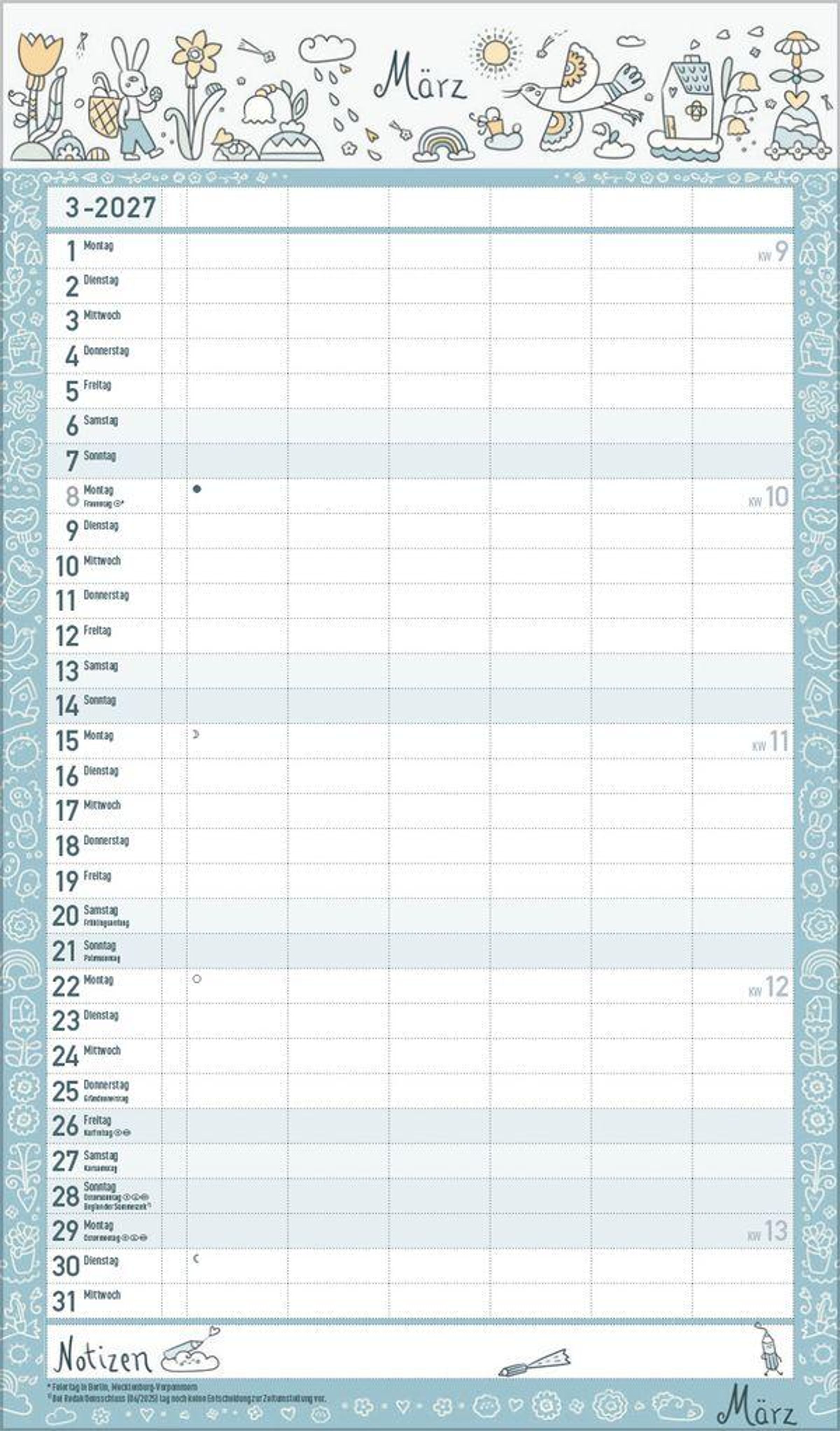 - Familienkalender, 6 große Spalten. Familientimer mit Ferienterminen, extra Spalte und Vorschau bis März 2027. Format: 27 x 46 cm